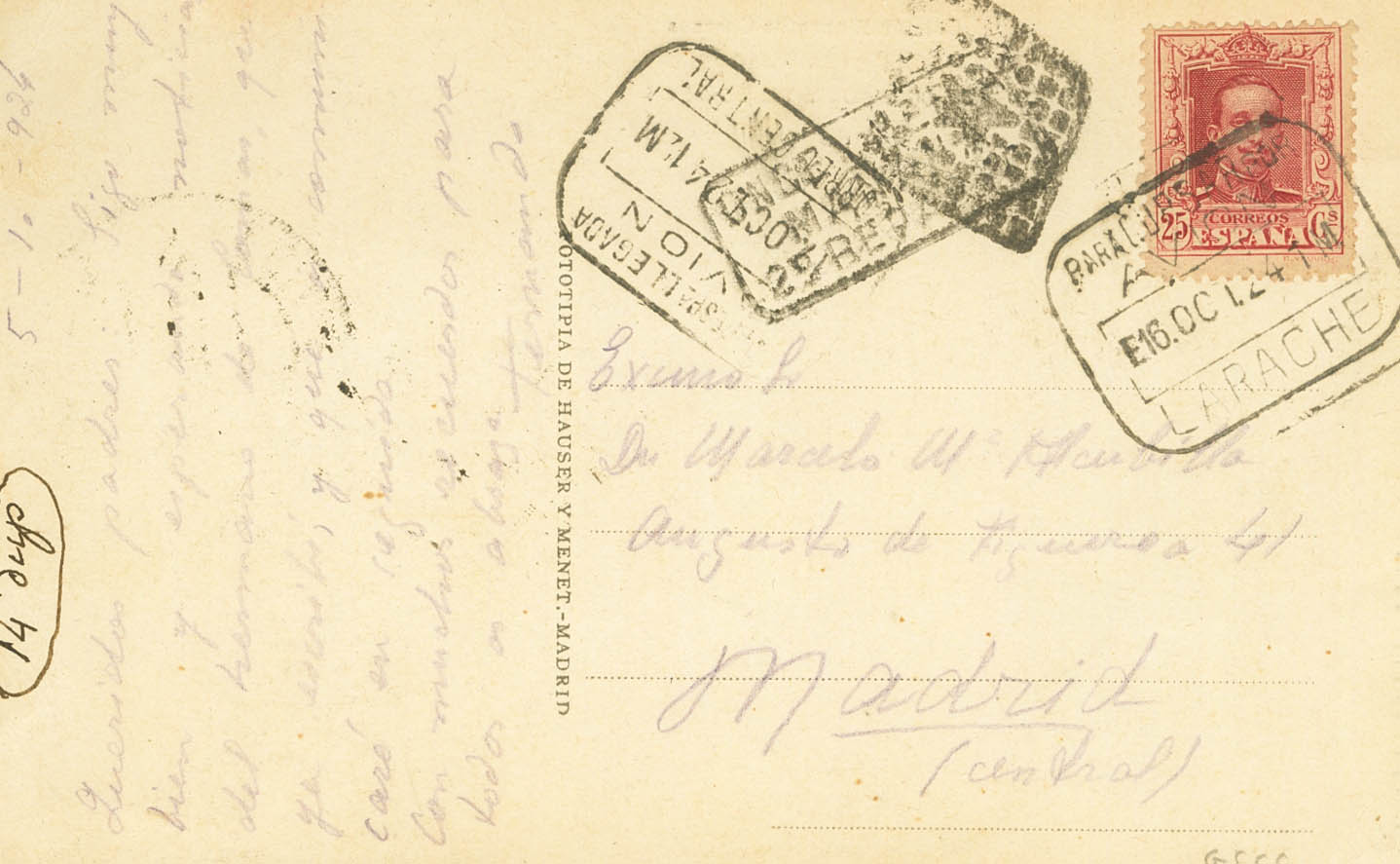 317. 1924. 25 cts rojo carmín. Tarjeta Postal de LARACHE a MADRID. Matasello PARA CURSAR POR / AVION / LARACHE. MAGNIFICA.