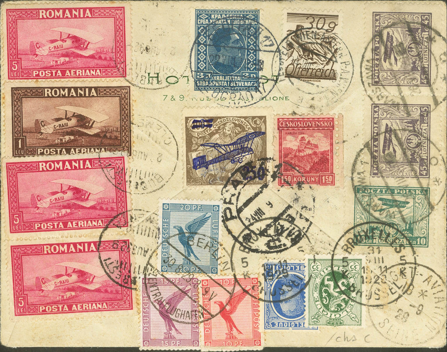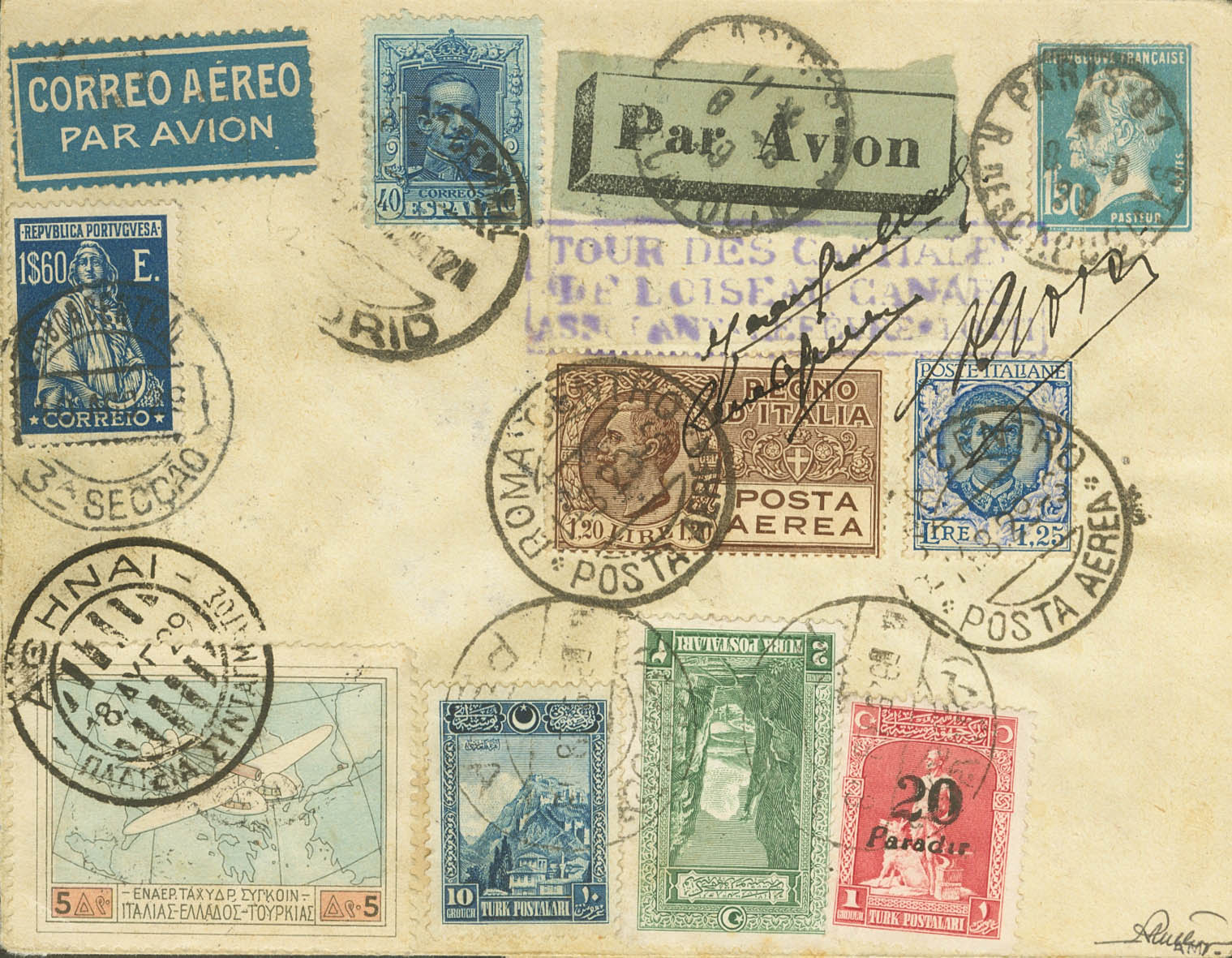 319. 1929. 40 cts azul y diversos valores de doce países. Vuelo de prueba del avión Oiseau Canari por diversas ciudades europeas y firmada por los tres pilotos que llevaron a cabo el vuelo, Armand Lotti, Jean Asollant y Rene Lefeure, este vuelo de prueba se realizó para probar el avión de cara a una travesía del Océano Atlántico que se realizaría desde Estados Unidos a España, las ciudades donde tomó tierra fueron Madrid, Lisboa, Roma, Atenas, Estambul, Bucarest, Belgrado, Praga, Viena, Varsovia, Berlín y Bruselas, regresando a París en Septiembre de 1929. MAGNIFICA Y RARISIMA.