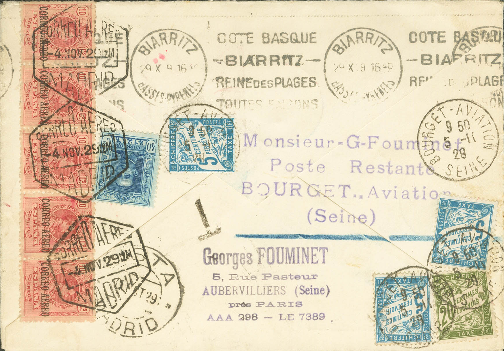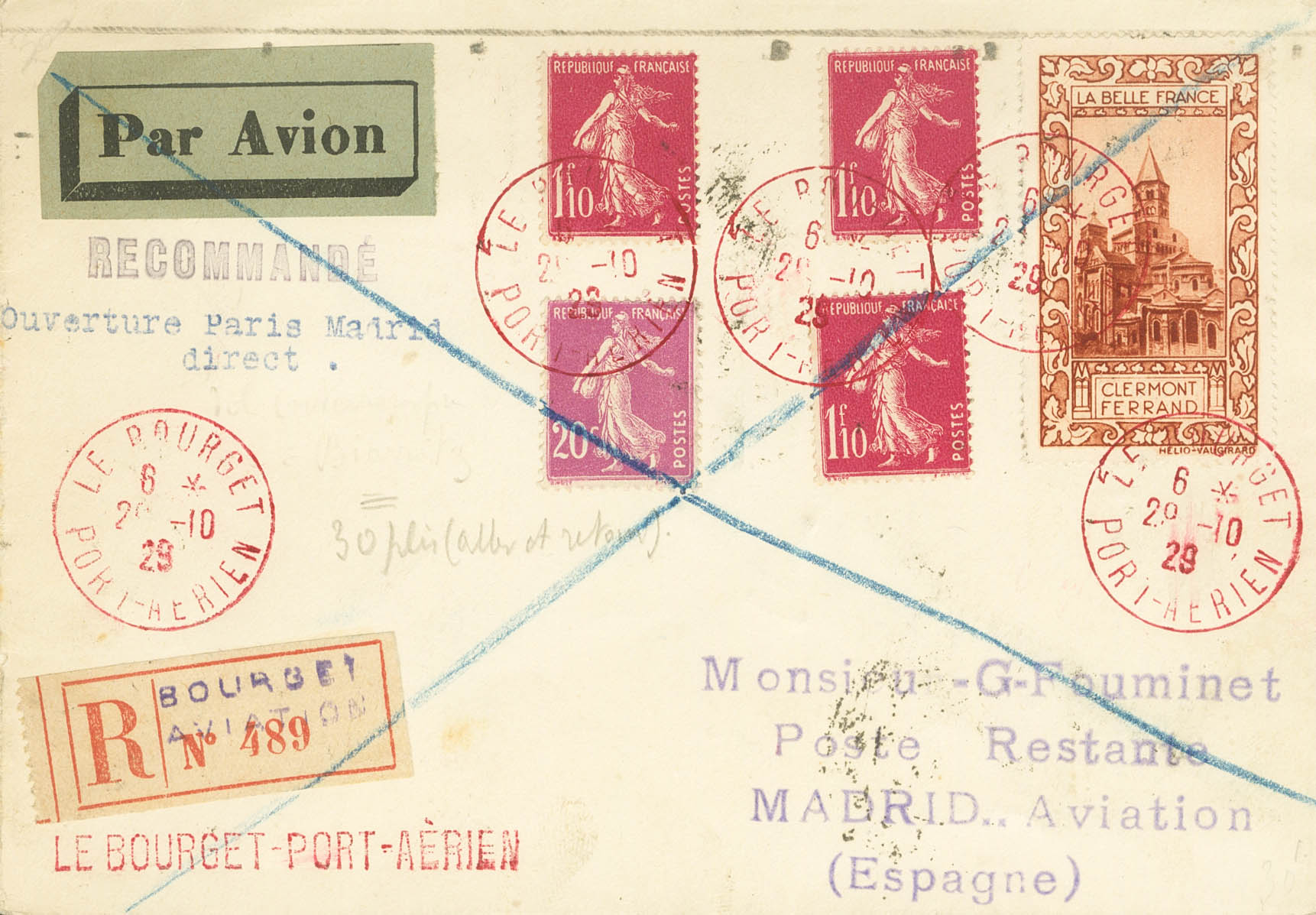 319, 293. 1929. Sellos de Francia de 20 cts lila, 1´10 f carmín rosa, tres sellos y viñeta de Clermont Ferrand. Certificado de LE BOURGET (FRANCIA) a MADRID. Matasello LE BOURGET / PORT AERIEN, en rojo, al dorso se aplican cinco sellos de España de 10 cts y uno de 40 cts, para cubrir el trayecto de vuelta, que resulta insuficiente y es tasada por el correo francés en 35 cts, aplicando tres sellos de tasa de 5 cts y uno de 20 cts. MAGNIFICA Y ESPECTACULAR FRANQUEO DEL VUELO DE APERTURA DE PARIS A MADRID, SOLO S E CONOCEN TREINTA CARTAS.