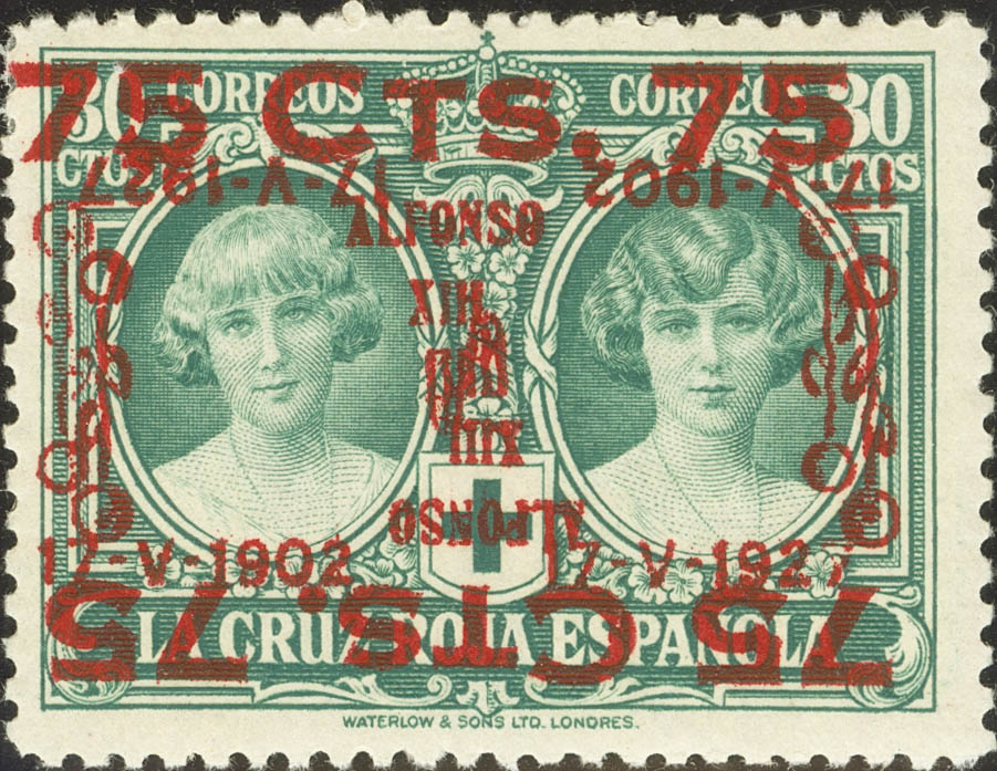 ★★ 381hhi. 1927. 75 cts sobre 30 cts. Variedad SOBRECARGA DOBLE, UNA INVERTIDA. MAGNIFICO. Edifil 2020: +265 Euros
