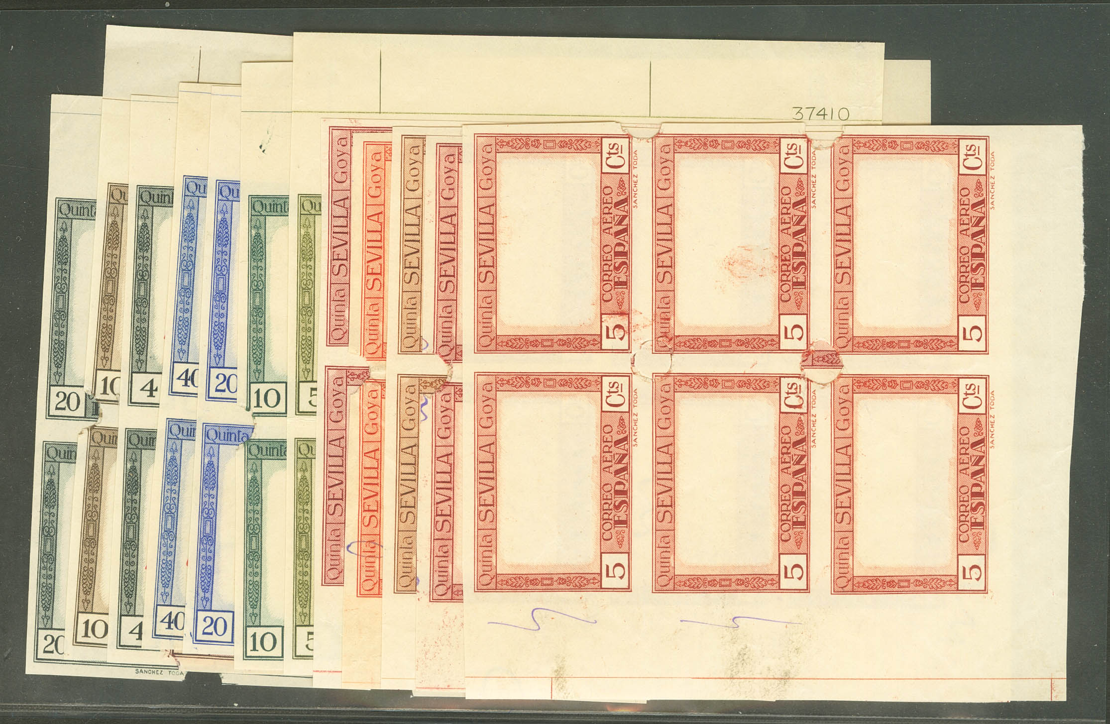 (★) 517/30P(6). 1930. Serie completa, doce valores en bloque de seis (dos sellos del 10 cts rasgados sin importancia alguna). ENSAYOS DE PLANCHA DE LOS MARCOS, en los colores adoptados y con taladros (algunos con anotaciones del impresor). MAGNIFICO Y RARISIMO CONJUNTO. (Gálvez CA230/43)
