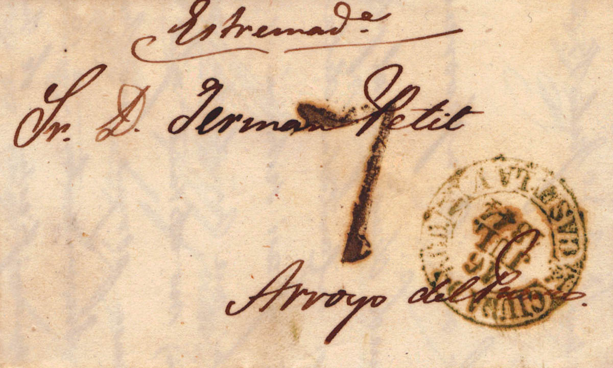 1844. CIUDAD RODRIGO a ARROYO DEL PUERCO. Baeza CIUDAD-ROD / CAST.LA V., en verde. MAGNIFICA Y RARA.