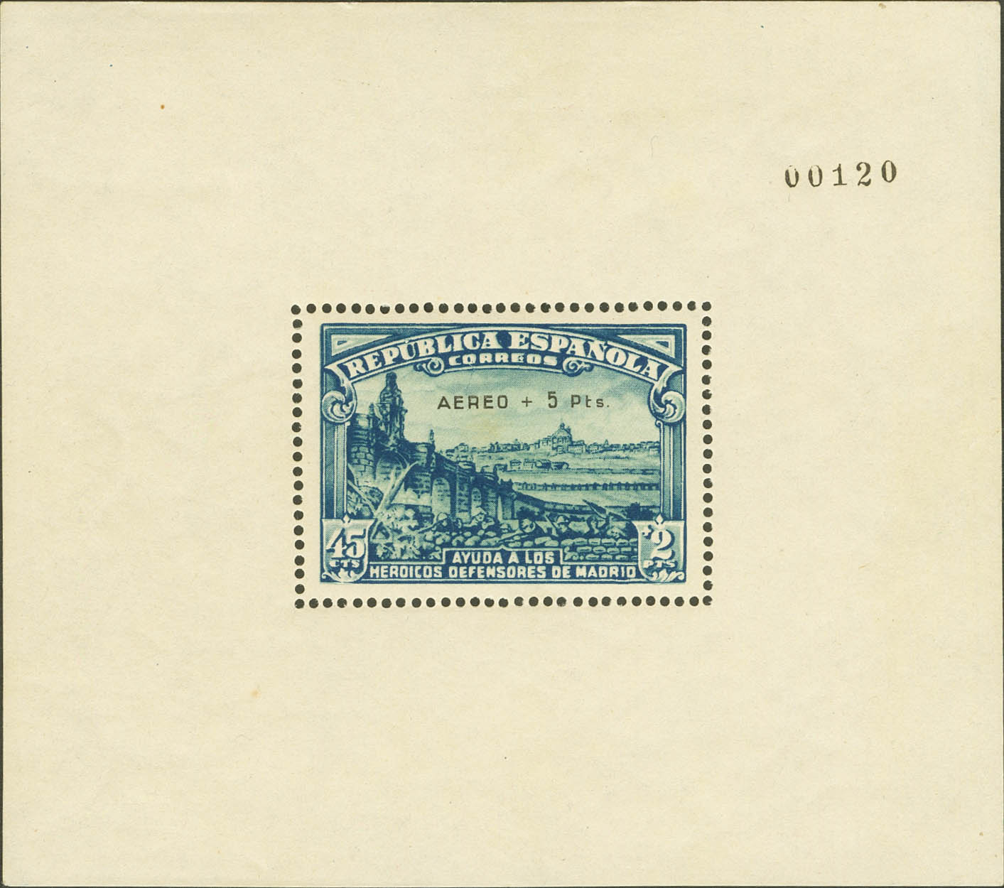 ★★ 760. 1938. Hoja bloque (conservación habitual). AEREO+5 PTS. MAGNIFICA Y RARA. Cert. CEM. Edifil 2023: 6.500 Euros