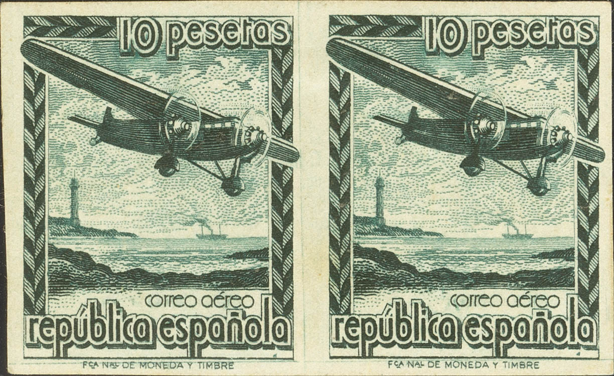 ★★ NE38(2). 1939. 10 pts verde negruzco, pareja. NO EMITIDO y SIN DENTAR. MAGNIFICA. Edifil 2023: +194 Euros