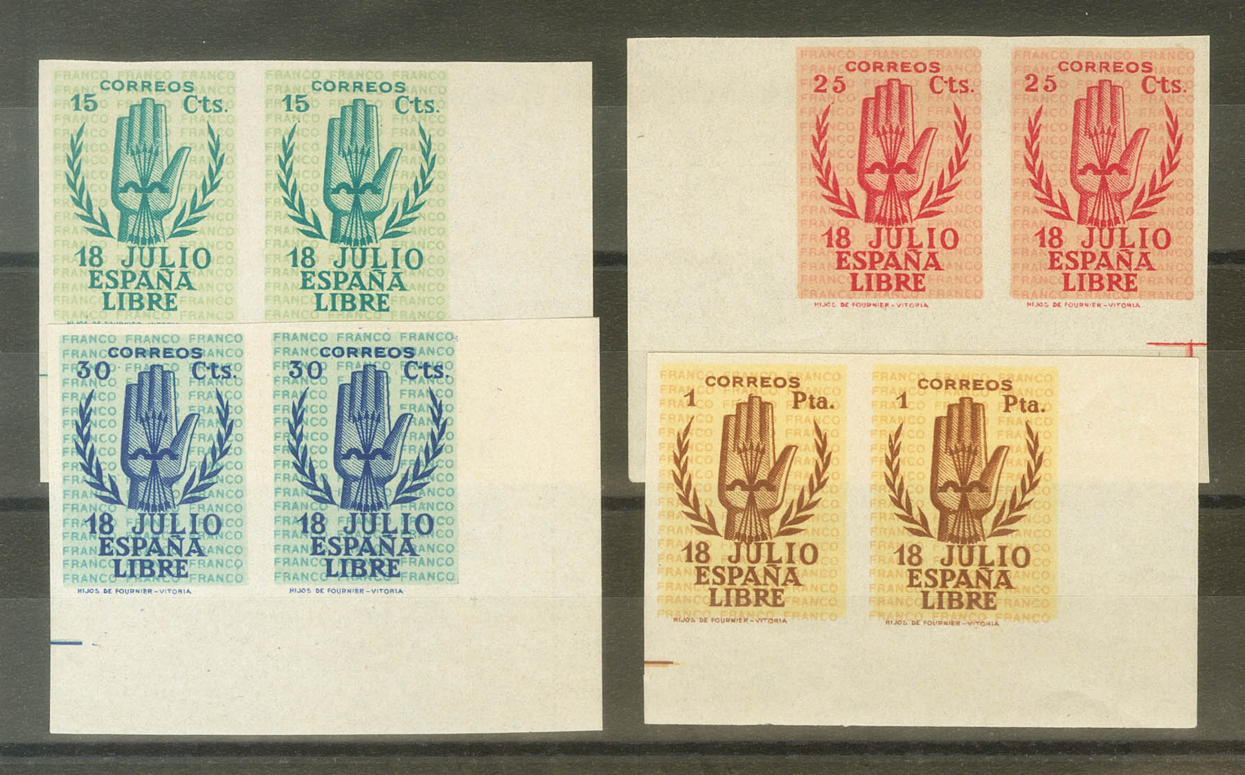 ★★ 851/54s(2). 1938. Serie completa, en pareja y esquina de pliego. SIN DENTAR. MAGNIFICA Y RARA. Edifil 2023: +2.650 Euros