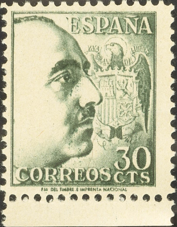 (★) 869P. 1939. 30 cts verde, borde de hoja. ENSAYO DE COLOR (dentado 10). MAGNIFICO Y RARISIMO. (Gálvez 3625)
