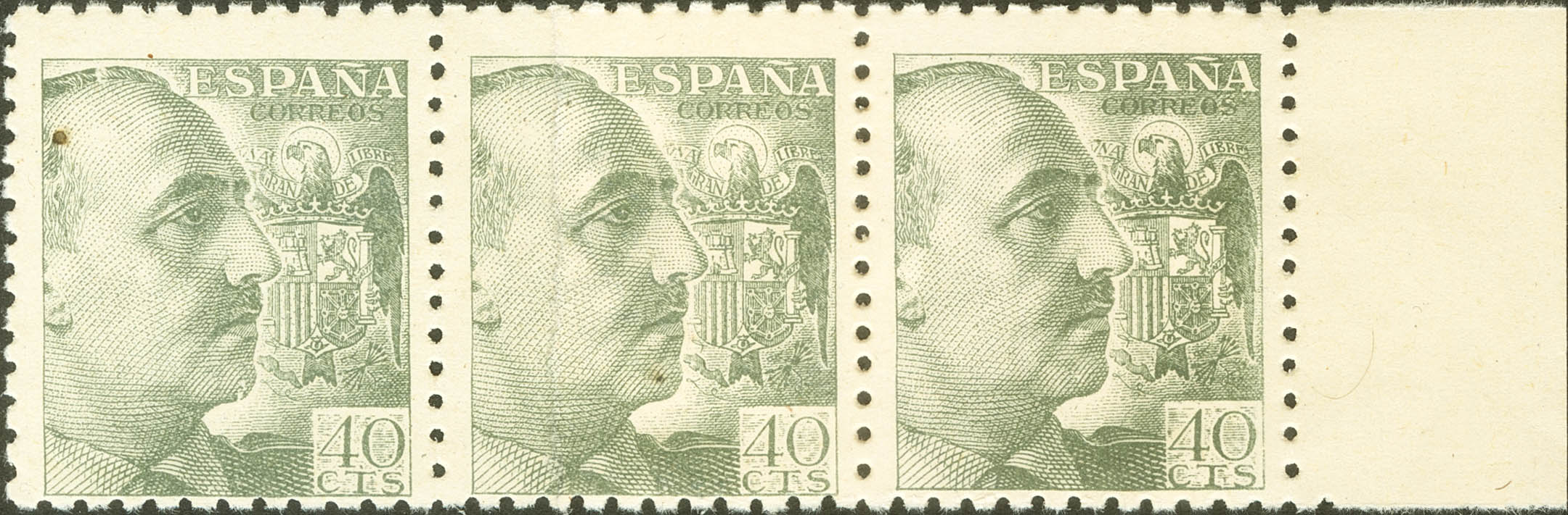 ★★ 925(2), 925x. 1939. 40 cts verde gris, tira de tres. Un sello variedad EMPALME DE PAPEL. MAGNIFICA. Edifil 2021: +41 Euros