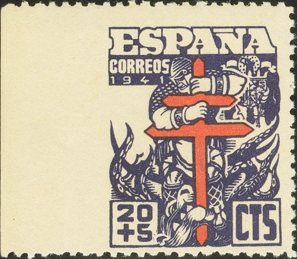 ★★ 949smi. 1941. 20 cts + 5 cts violeta, borde de hoja. Variedad SIN DENTAR EL MARGEN IZQUIERDO. MAGNIFICO. Edifil 2020: +47 Euros
