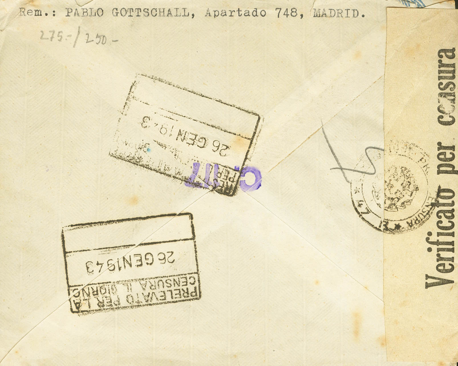 954/56. 1943. Serie completa y diversos valores. MADRID a SANTA MARGARITA (ITALIA). Al dorso marcas de censura italianas. MAGNIFICA.