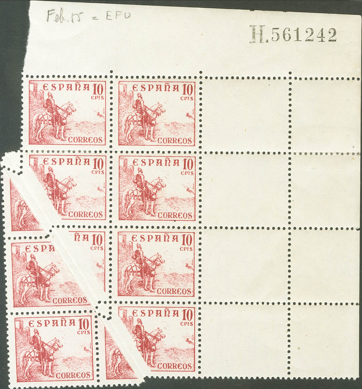 ★★/★ 1045(8). 1949. 10 cts carmín, bloque de ocho. Cuatro sellos variedad FUELLE DIAGONAL DE PAPEL. MAGNIFICO Y RARO.