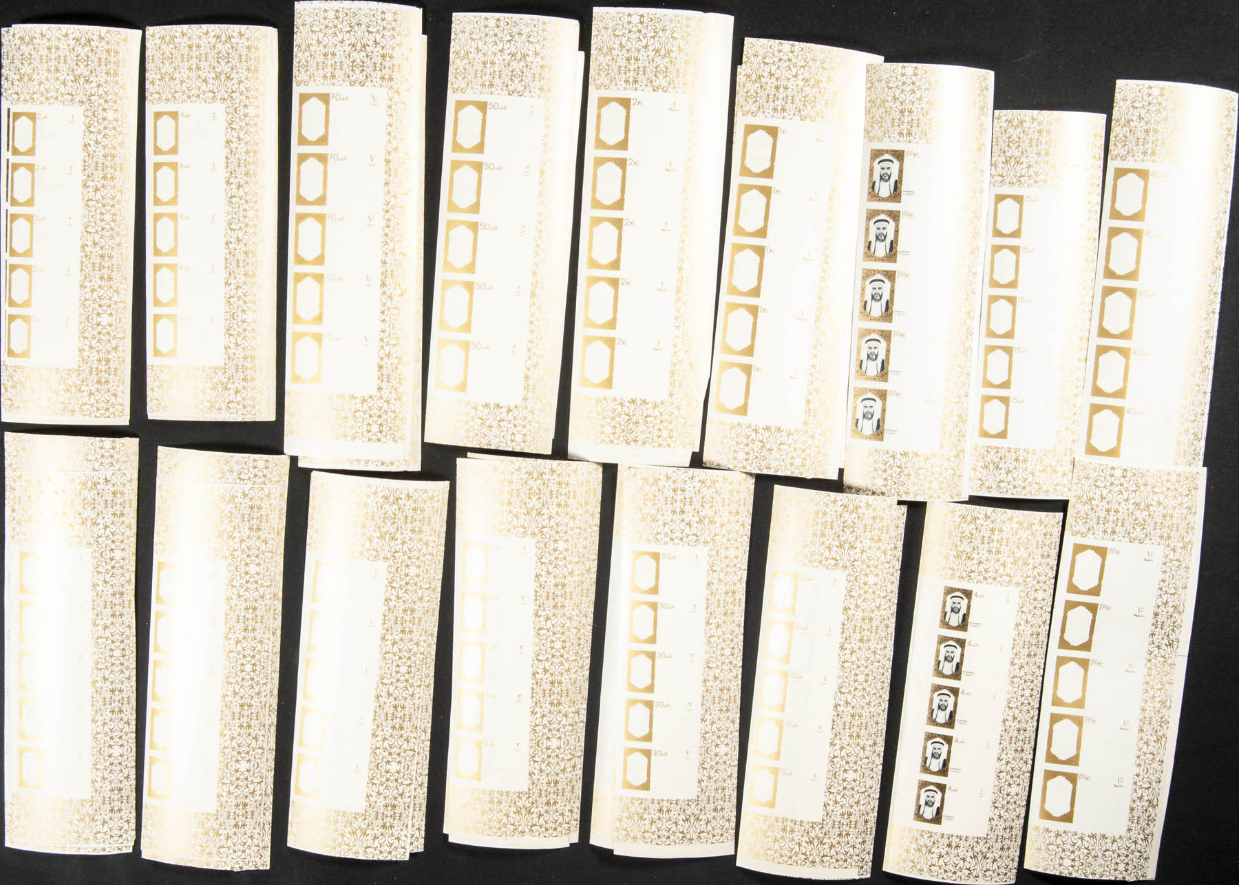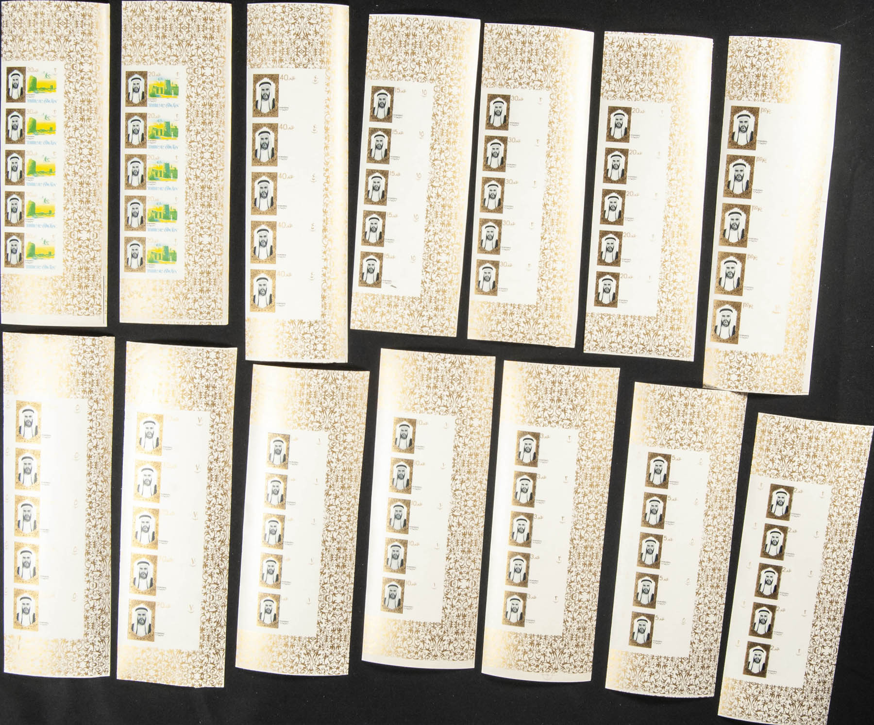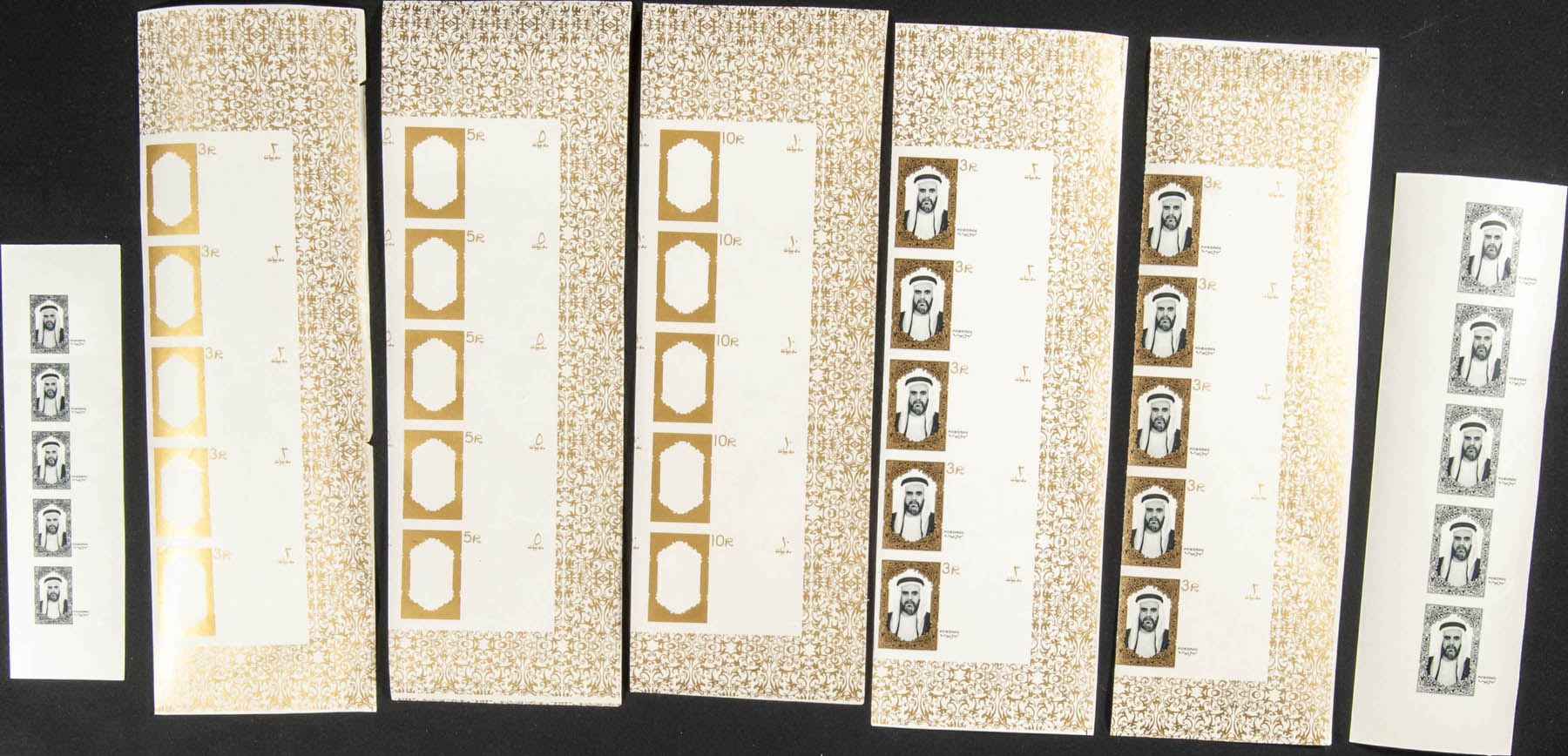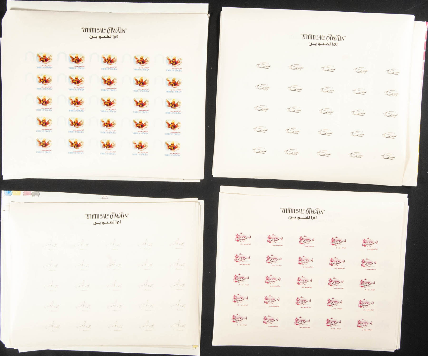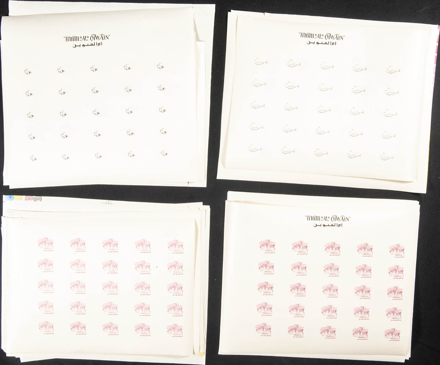 ★★ . 1964. Ahmed Bin Rashid al Moalla, definitives. Group of progressive plate proofs of the set. (Michel: 1/18)