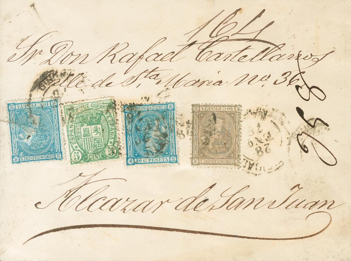 164(2), 168, 154. 1875. 10 cts azul, dos sellos (uno con defecto por conservación del archivo), 50 cts lila y 5 cts verde de Impuesto de Guerra. Certificado de MADRID a ALCAZAR DE SAN JUAN (CIUDAD-REAL). Matasello CERTIFICADO / MADRID, al dorso recibí y lacres (dos de certificado). MAGNIFICA Y RARO FRANQUEO DE DOBLE PORTE CERTIFICADO, RARISIMOS LOS CERTIFICADOS EN ESTA EMISION.