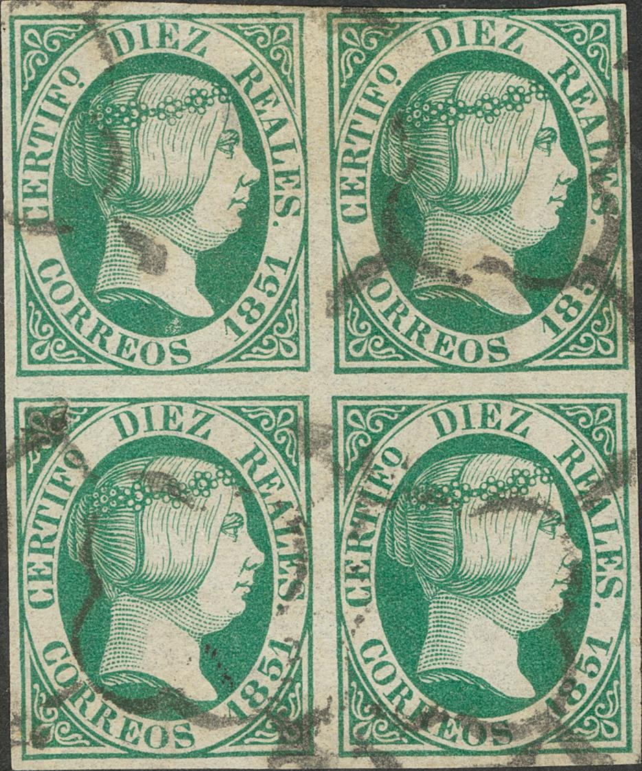 11(4). 1851. 10 reales verde, bloque de cuatro (ínfimo adelgazamiento en un sello). Matasello limpio y color intenso. MAGNIFICO Y RARO. Cert. GRAUS. Edifil 2020: 2.875 Euros