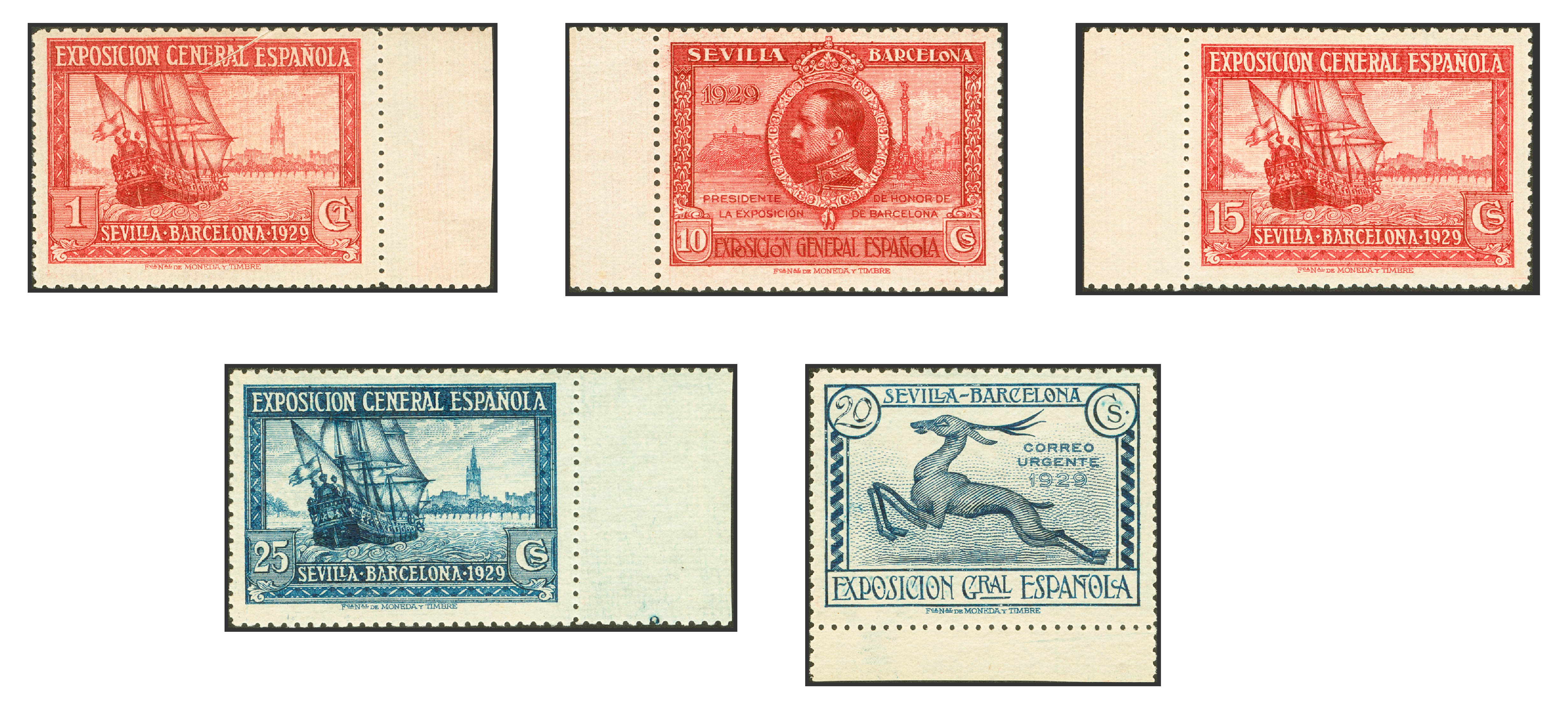 ★★ 434ccp, 437/40ccp, 447ccp. 1929. 1 cts carmín, 10 cts carmín, 15 cts carmín, 25 cts azul y 20 cts azul. Variedad CAMBIOS DE COLOR. MAGNIFICOS. Edifil 2020: +299 Euros