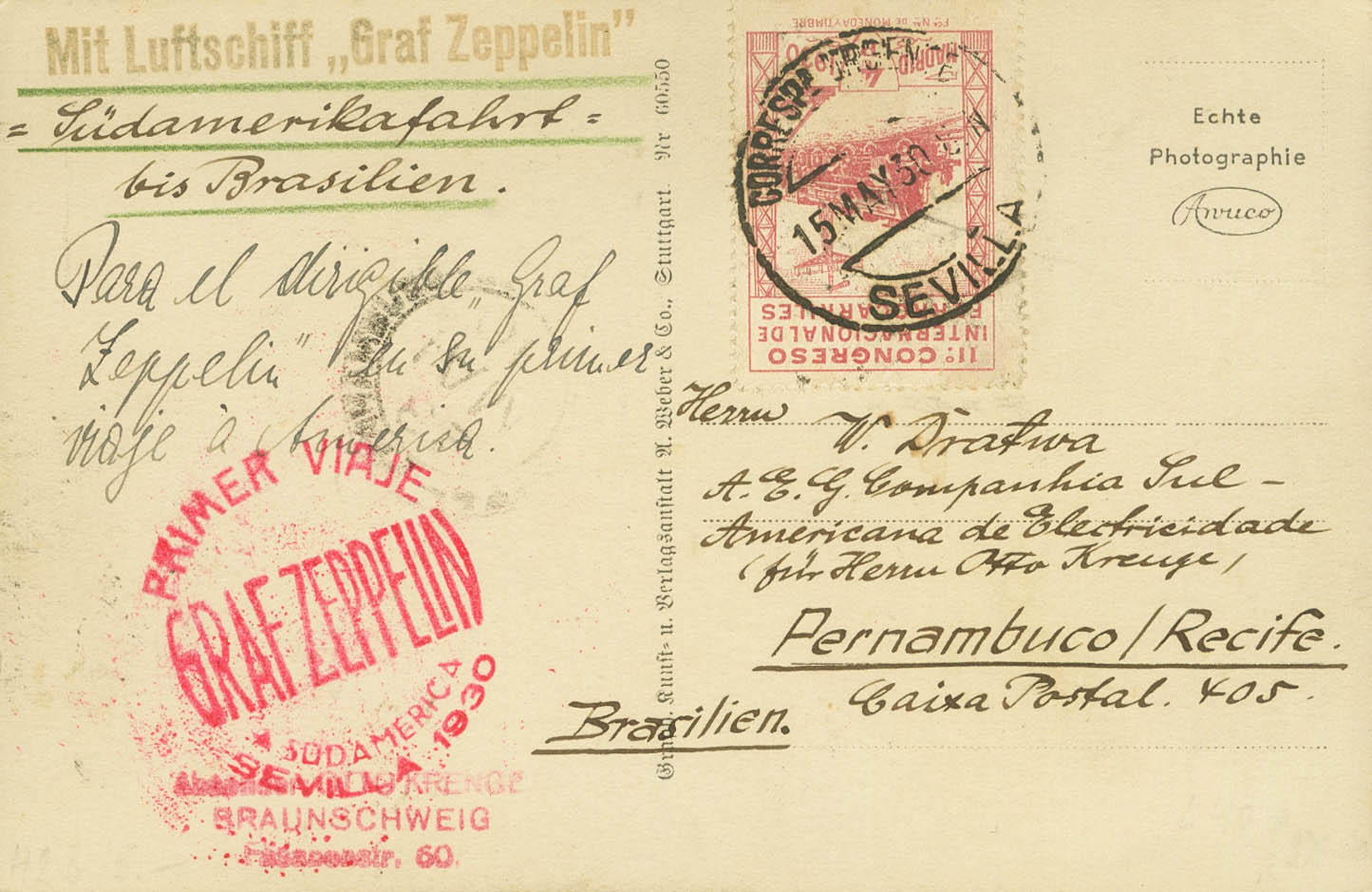480. 1930. 4 pts carmín. GRAF ZEPPELIN de SEVILLA a BRASIL. En el frente llegada. MAGNIFICA Y RARISIMA CON EL 4 PTS VERDADERAMENTE CIRCULADO.