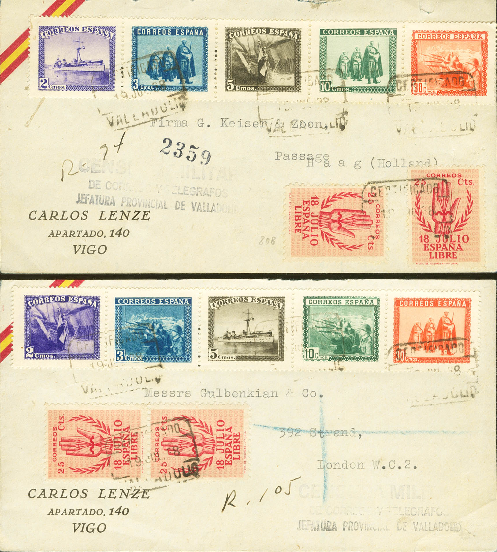 SH849. 1938. Serie completa, procedente de la hoja bloque de la Marina sobre dos cartas Filatélicas Certificadas ambas con origen en VALLADOLID y dirigidas a LA HAYA (HOLANDA) y LONDRES (INGLATERRA), respectivamente. MAGNIFICA Y RARISIMA, MUY POCAS CONOCIDAS EN CARTA Y TODAS ELLAS SIEMPRE CON ORIGEN FILATELICO, OBVIAMENTE Y DEBIDO A SU FORMATO Y JUSTIFICACION DE LA EMISION NO CIRCULARON NUNCA.