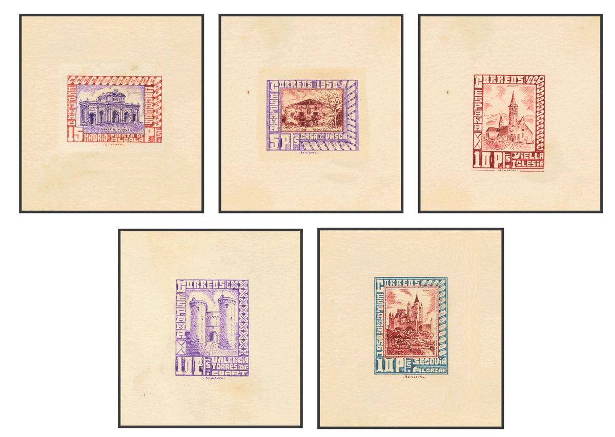 (★)1950. Espectacular conjunto de cinco PRUEBAS DE COLOR, de diseños no adoptados de 5 pts lila y violeta (Casa Vasca), 10 pts azul y violeta (Alcazar de Segovia), 10 pts lila (Torres de Cuart), 10 pts violeta (Iglesia de Viella) y 15 pts rojo y violeta (Puerta de Alcalá), adheridos sobre láminas de presentación. MAGNIFICO Y EXTRAORDINARIAMENTE RARO CONJUNTO, UNICO CONOCIDO.