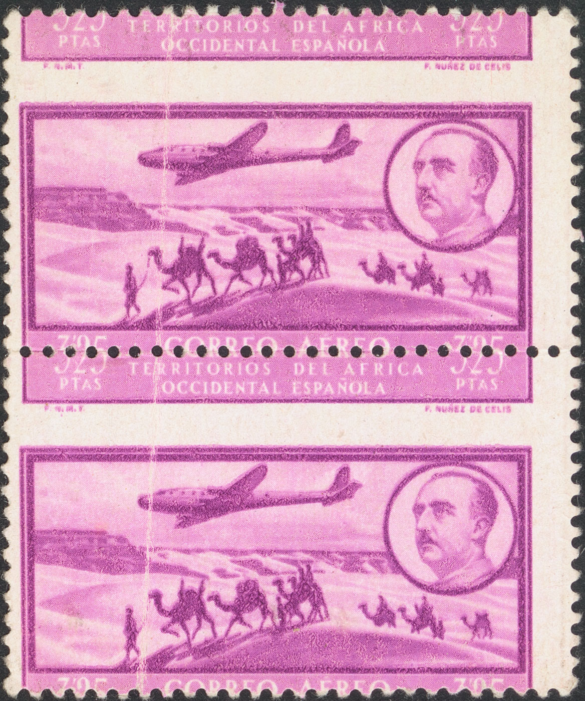 ★ 24(2). 1951. 3´25 pts violeta, pareja (ligero pliegue vertical). DENTADO DESPLAZADO. MAGNIFICA Y RARISIMA, NO CATALOGADA.