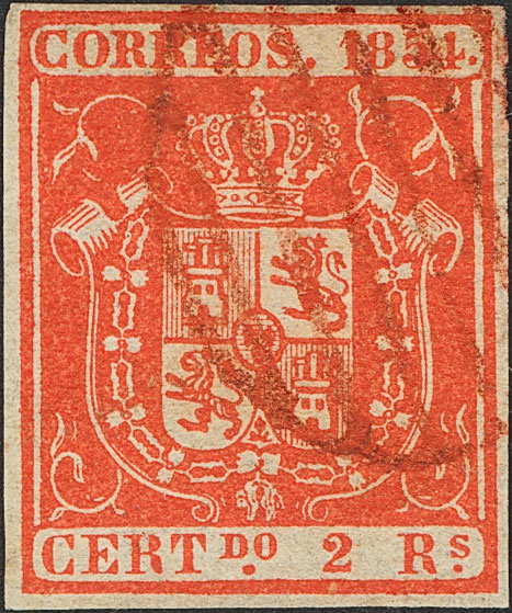 25. 1854. 2 reales rojo. Matasello PARRILLA, en rojo. MAGNIFICO Y RARISIMO. Edifil 2020: 685 Euros