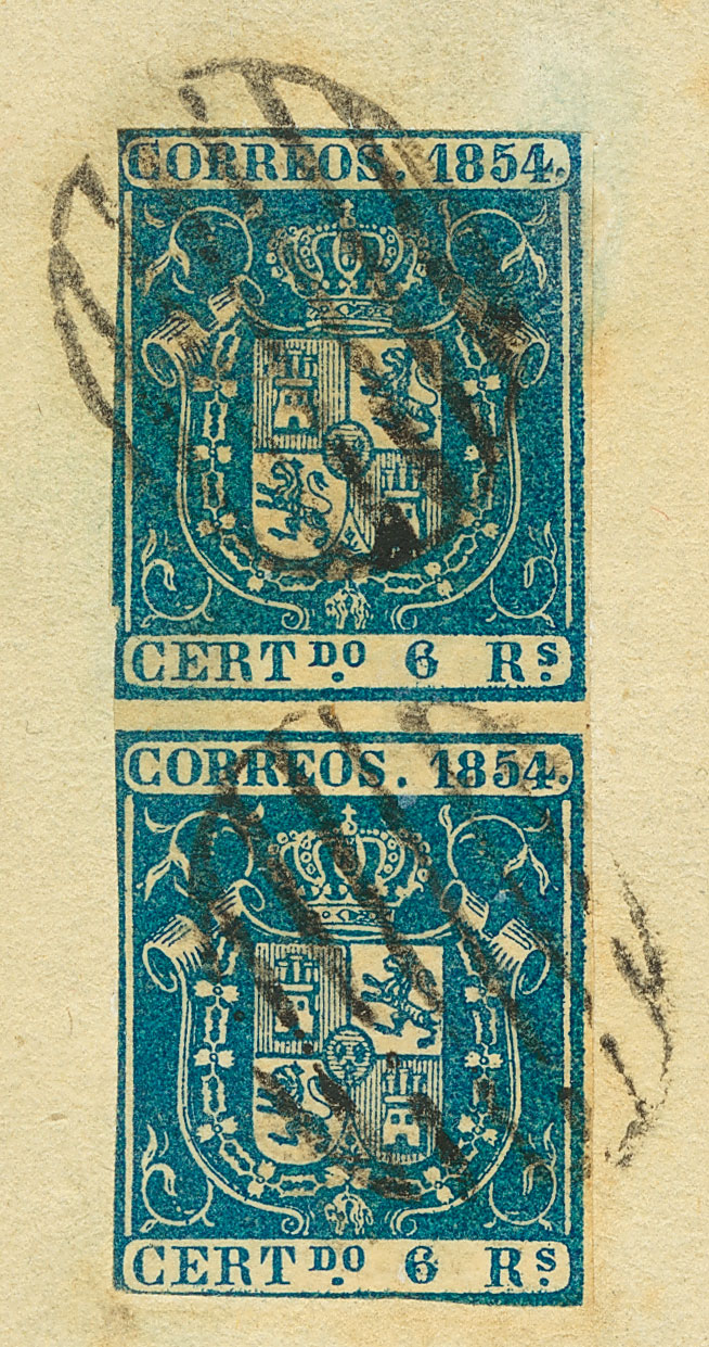 △ 27(2). 1854. 6 reales azul, pareja, sobre fragmento. MAGNIFICA Y RARA, MUY ESPECTACULAR. Edifil 2020: 775 Euros