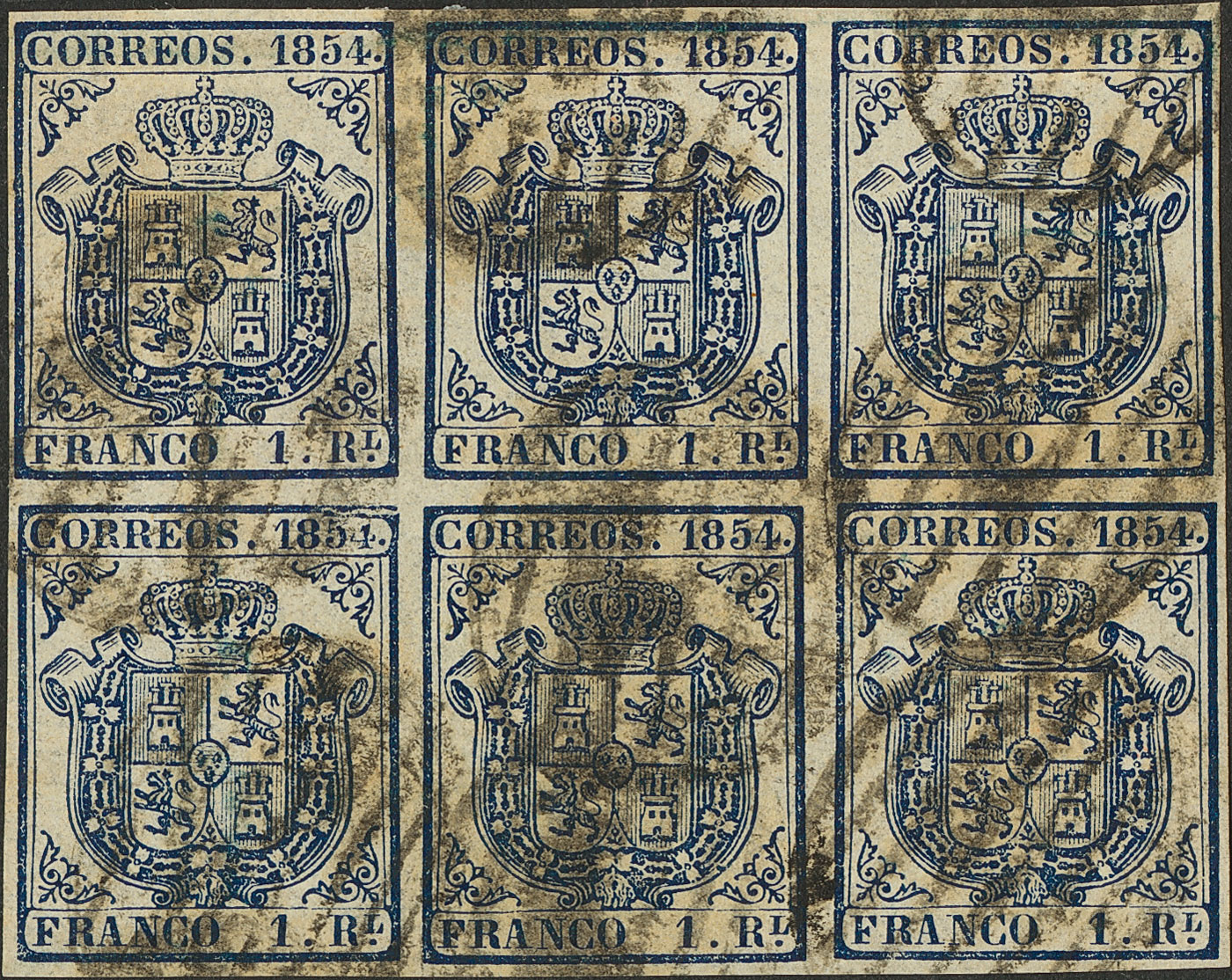 34(6). 1854. 1 real azul oscuro, bloque de seis. MAGNIFICO Y RARISIMO UN BLOQUE DE ESTE TAMAÑO. Cert. CEM. Edifil 2020: +4.600 Euros
