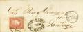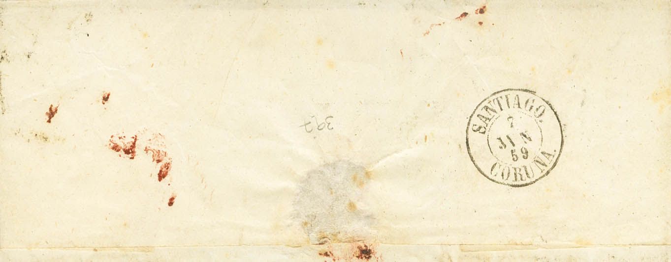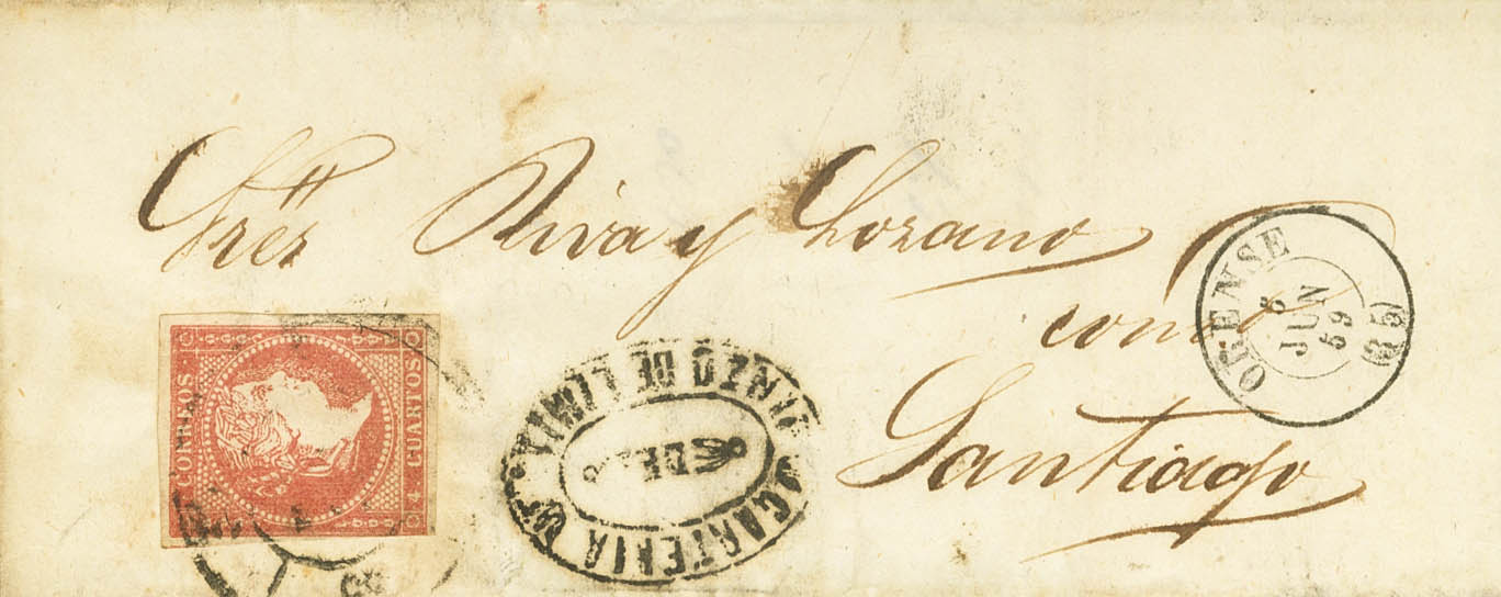48. 1859. 4 cuartos rojo. GINZO DE LIMIA (ORENSE) a SANTIAGO DE COMPOSTELA. Matasello R.CARRETA Nº35, de Orense y en el frente marca CARTERIA / DE / JINZO DE LIMIA. MAGNIFICA Y EXTRAORDINARIAMENTE RARA, SE TRATA DE LA PRIMERA MARCA DE CARTERIA CONOCIDA, Y DE INICIATIVA PERSONAL DEL CARTERO QUE DIRIGIA LA OFICINA.