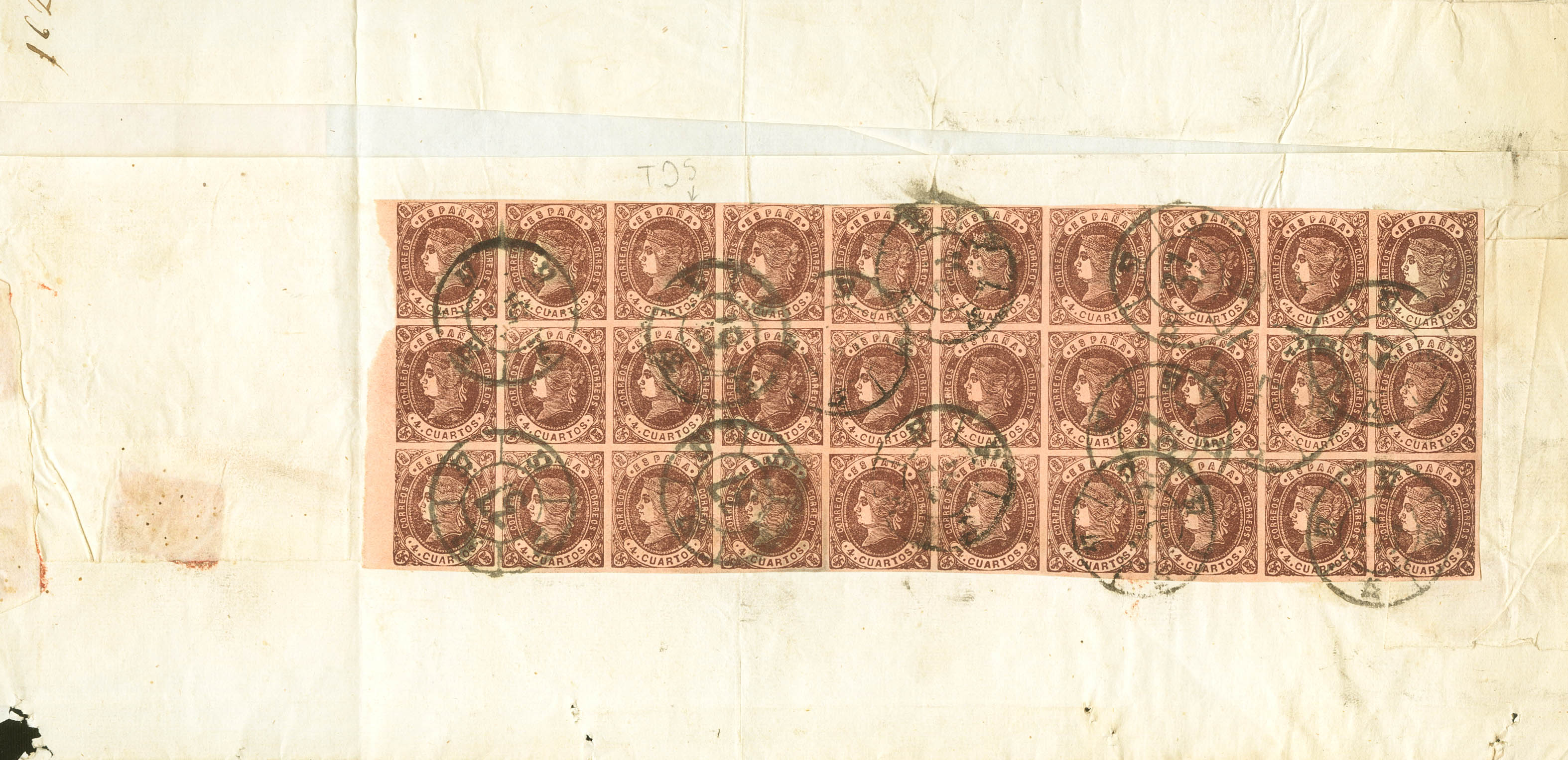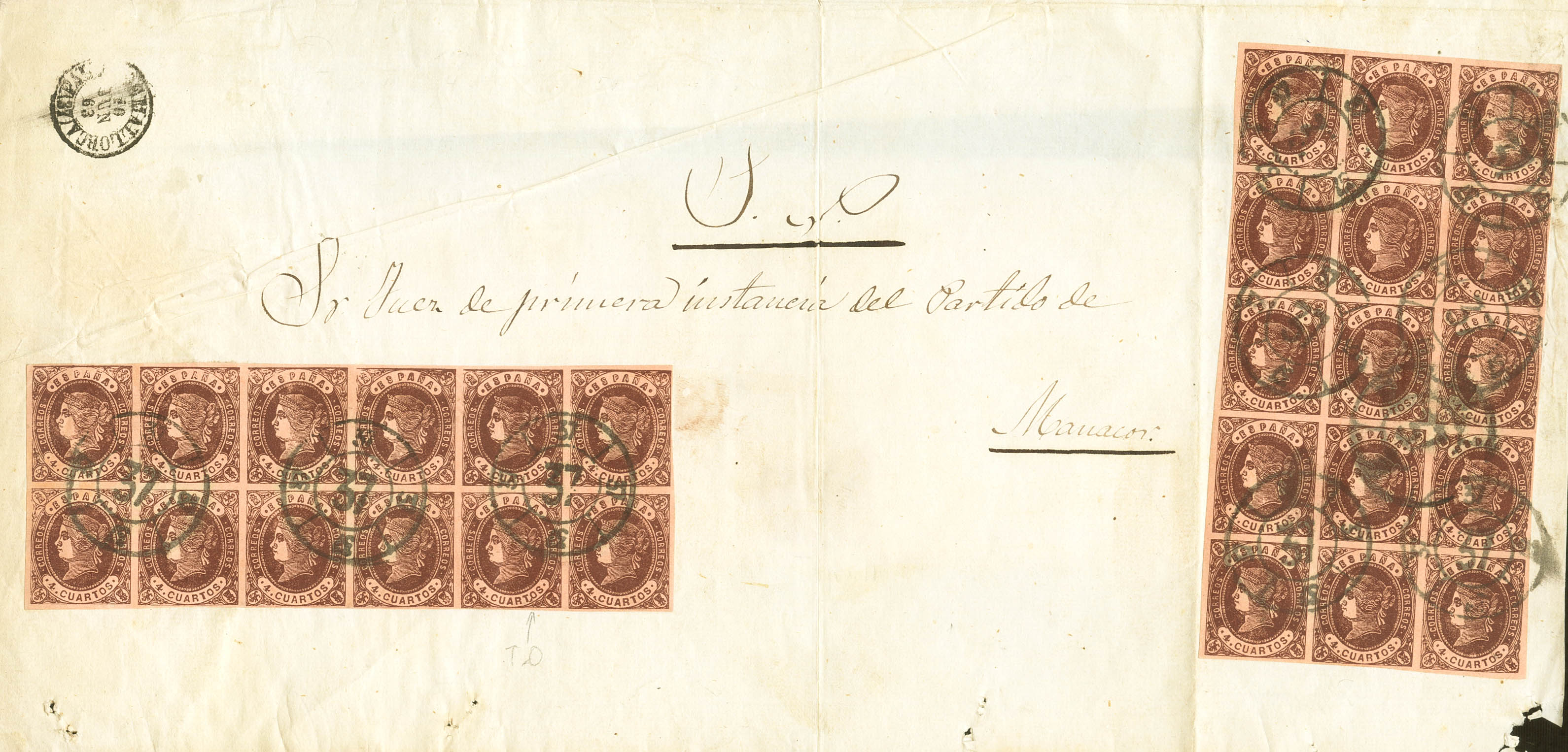 58(59). 1863. 4 cuartos castaño, bloque de treinta (al dorso), bloque de doce y bloque de quince. Plica Judicial de PALMA DE MALLORCA a MANACOR. Matasello R.CARRETA Nº37, de Palma. MAGNIFICA Y ESPECTACULAR PLICA, SIN DUDA UNA DE LAS DE MAYOR FRANQUEO CONOCIDO Y CON MAYOR SENTIDO ESTETICO.