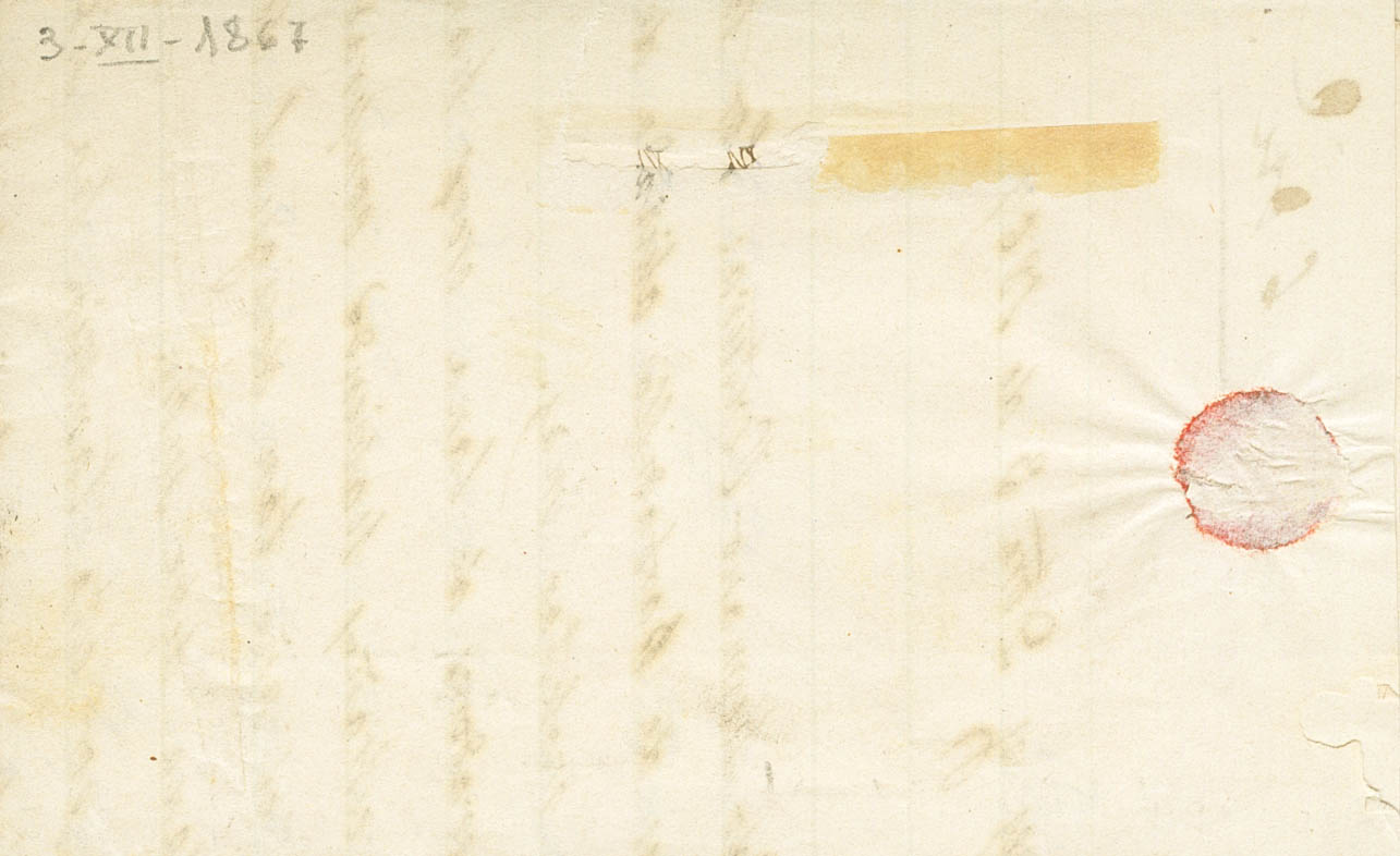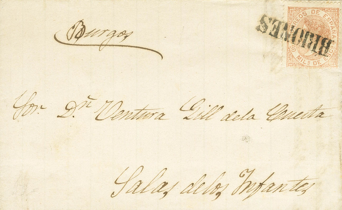 96. 1867. 50 mils castaño. BRIONES a SALAS DE LOS INFANTES. Matasello lineal BRIONES. MAGNIFICA Y RARISIMA.