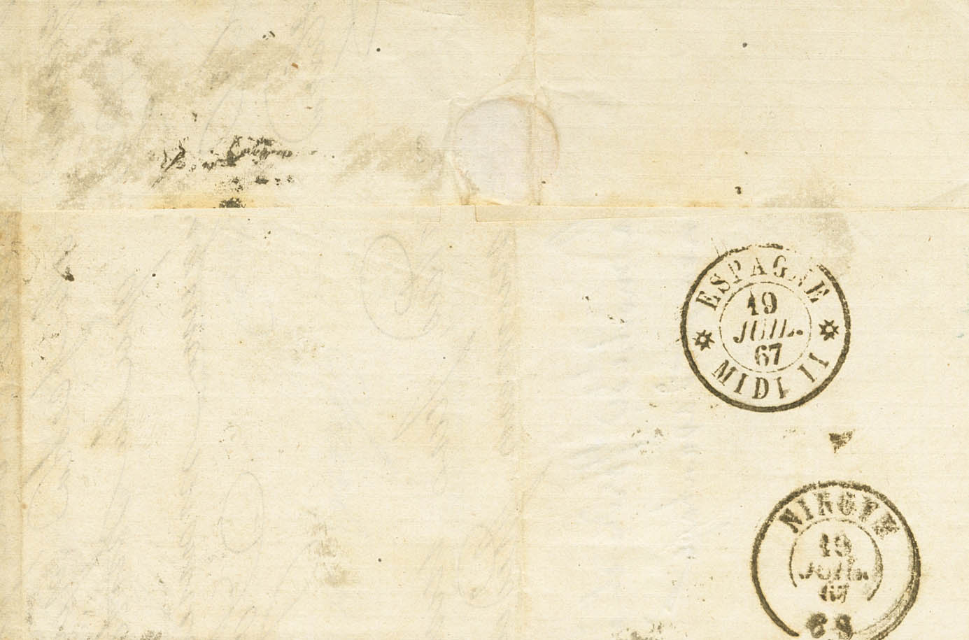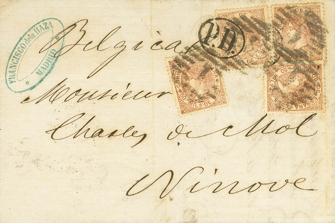 96(4). 1867. 50 mils castaño, cuatro sellos. MADRID a NINOVE (BELGICA). El franqueo de 200 mils (equivalente a 16 cuartos), no es suficiente para cubrir la tarifa de 19 cuartos vigente desde el 1 de Enero de 1866, y sin embargo el correo aceptó el franqueo a pesar de que le faltaban 3 cuartos. MAGNIFICA Y MUY RARA.