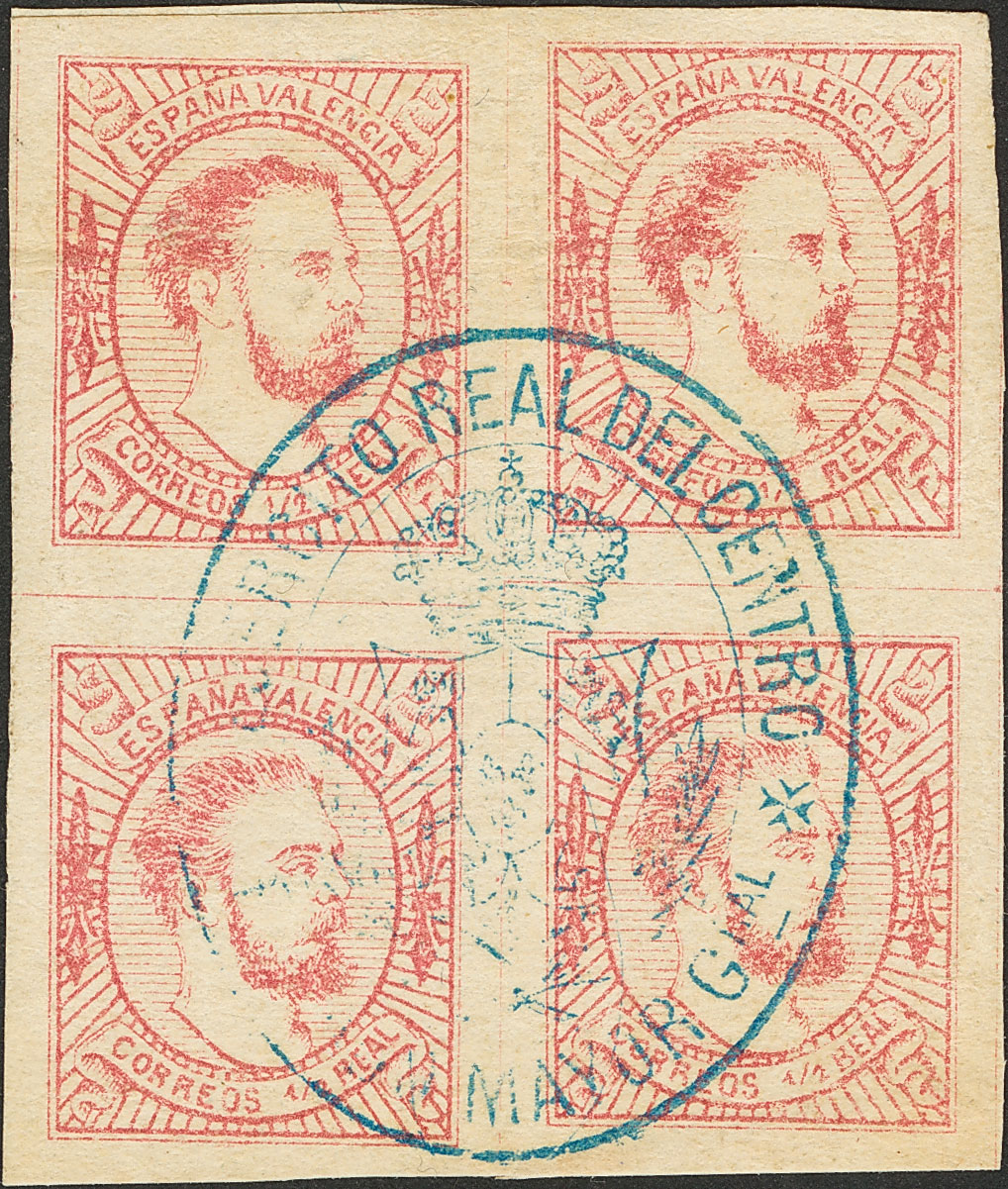 159(2), 159A(2). 1874. 1/2 real rosa, bloque de cuatro, incluyendo dos Tipos I y dos Tipos II. Matasello EJERCITO REAL DEL CENTRO / ESTADO MAYOR GNAL. MAGNIFICO Y RARO. Edifil 2020: 600 Euros