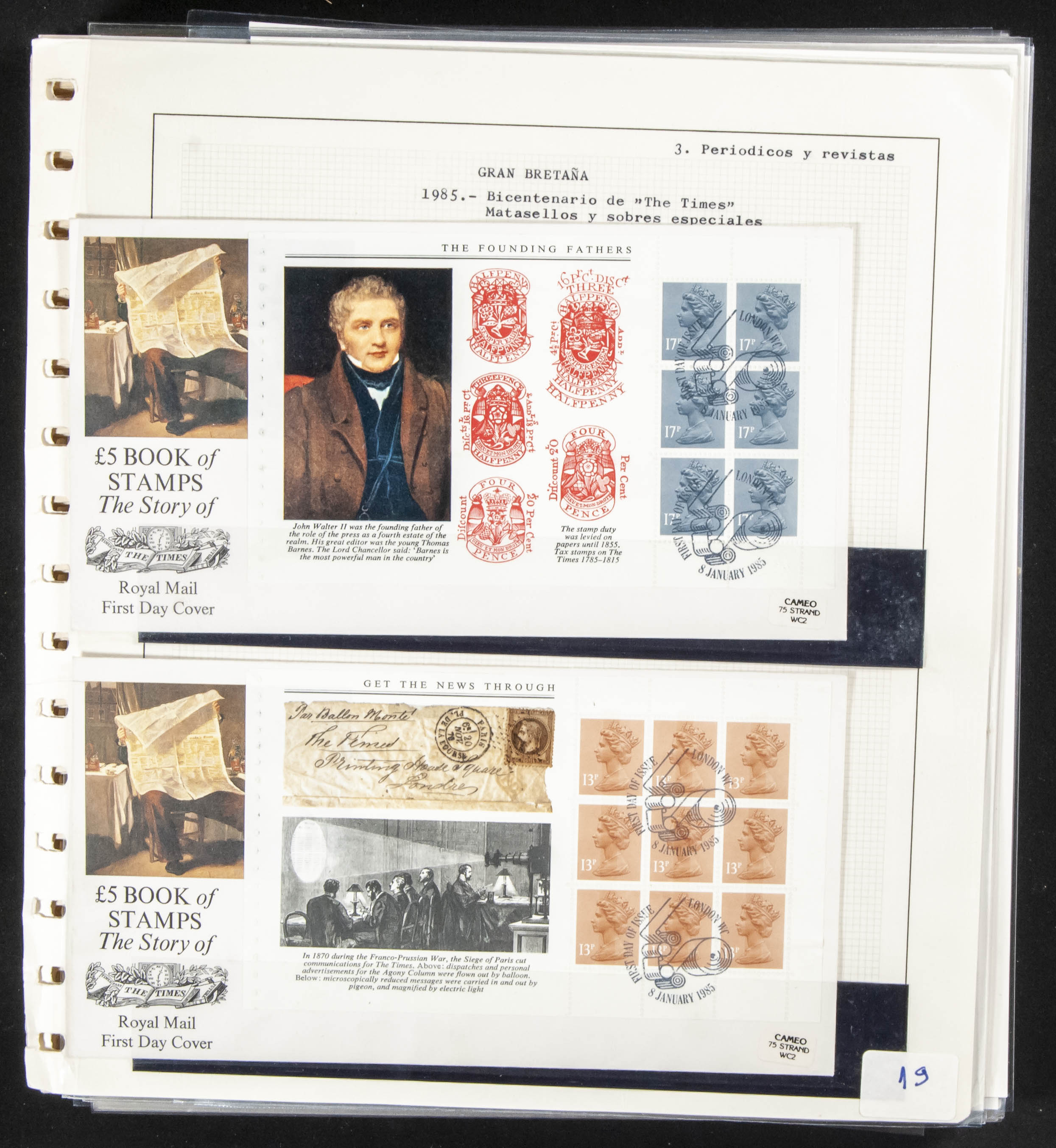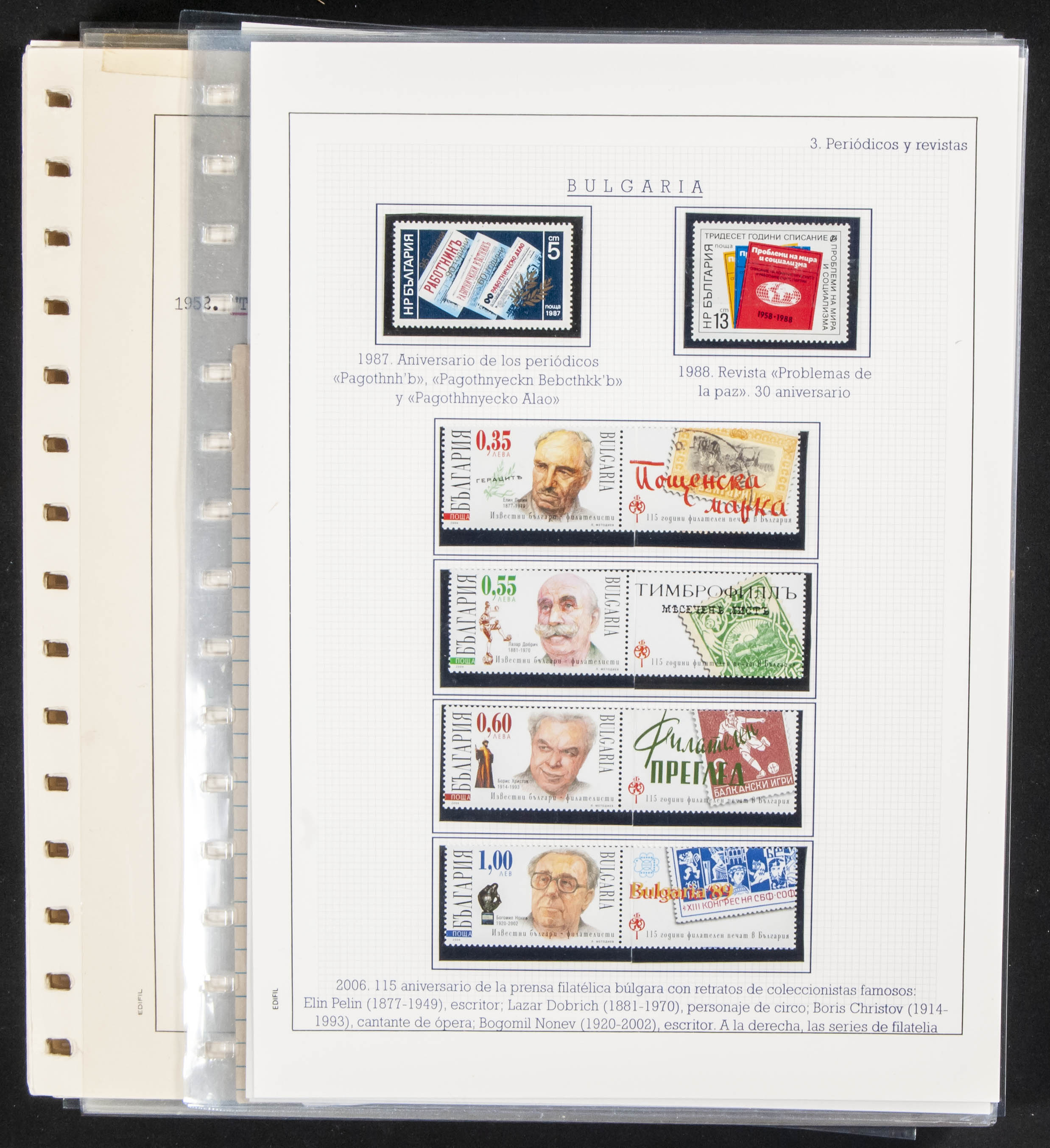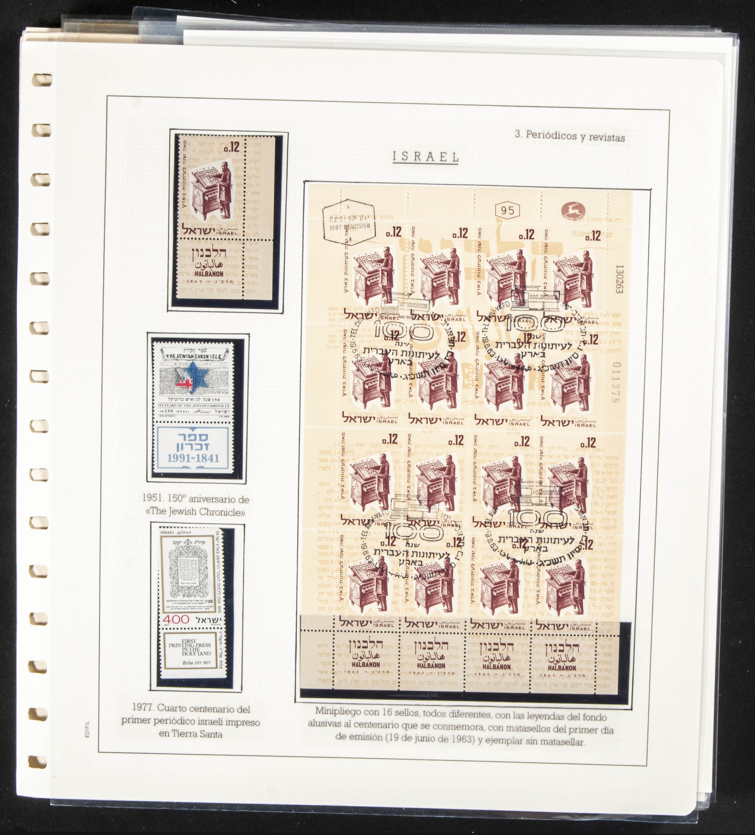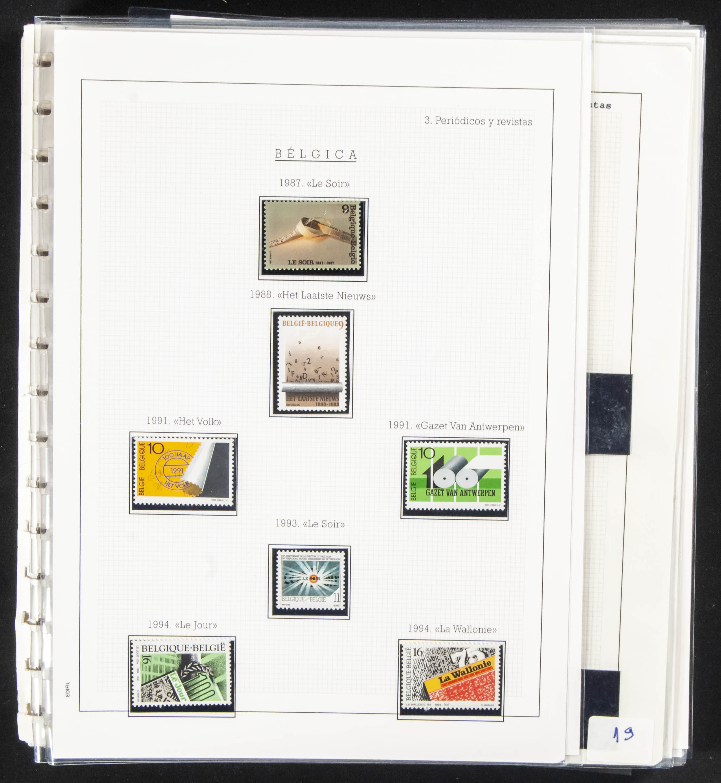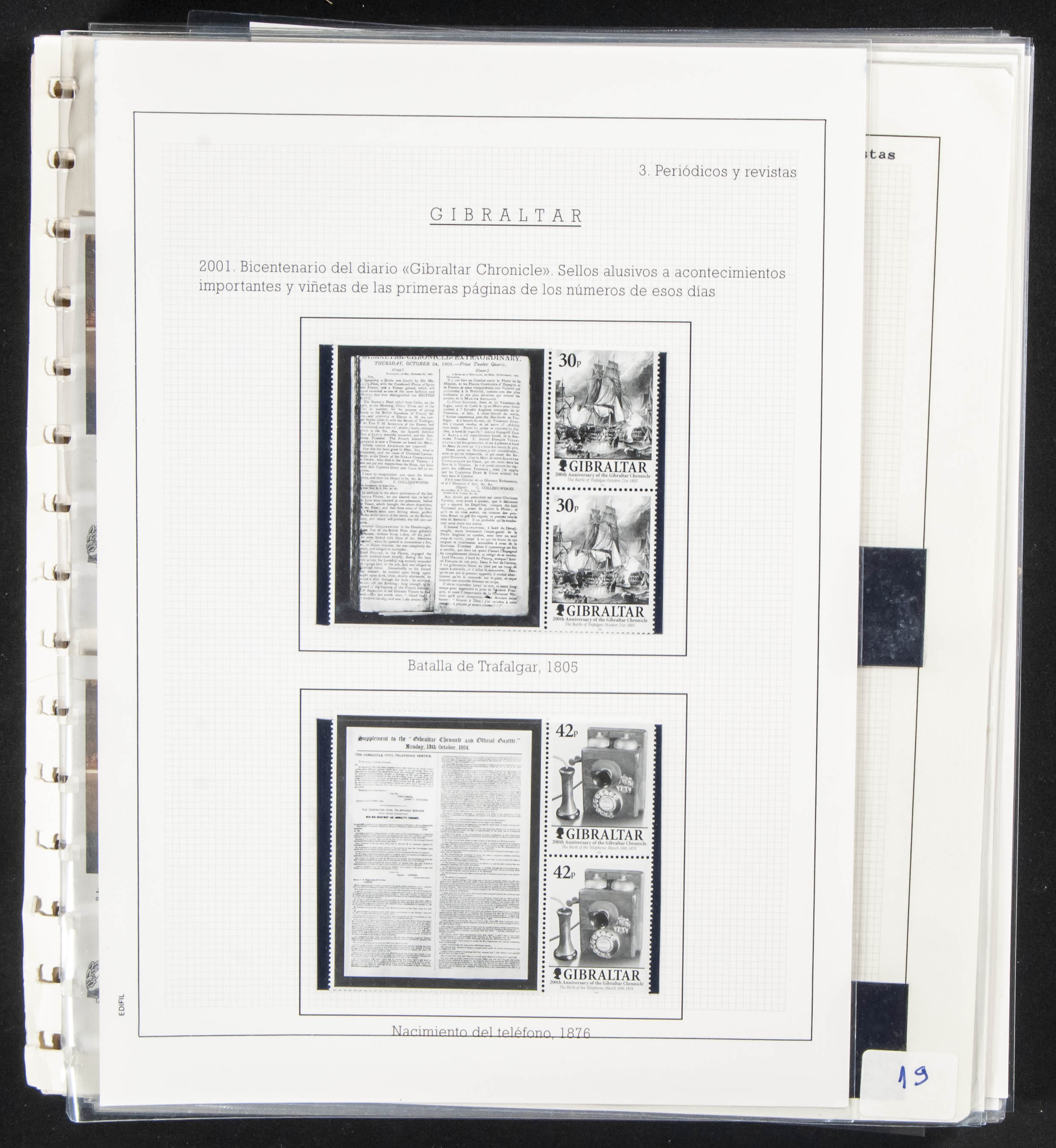 ★★/(1840ca). Espectacular colección temática con el Periodismo como tema principal, comprendiendo el periodo entre 1840 y 2000 con numerosos sellos y series de España y Extranjero, cartas circuladas (con membretes, fajas de periódico, timbres de periódicos, matasellos especiales, Sobres de Primer Día, etc), Tarjetas Entero Postales, periódicos completos, tarjetas postales, etc, realizada durante toda una vida por el periodista Alejandro Fernández Pombo, incluye variedades de series de España de la emisión de la prensa y algunos bocetos de sellos realizados a lápiz. IMPRESCINDIBLE EXAMINAR.