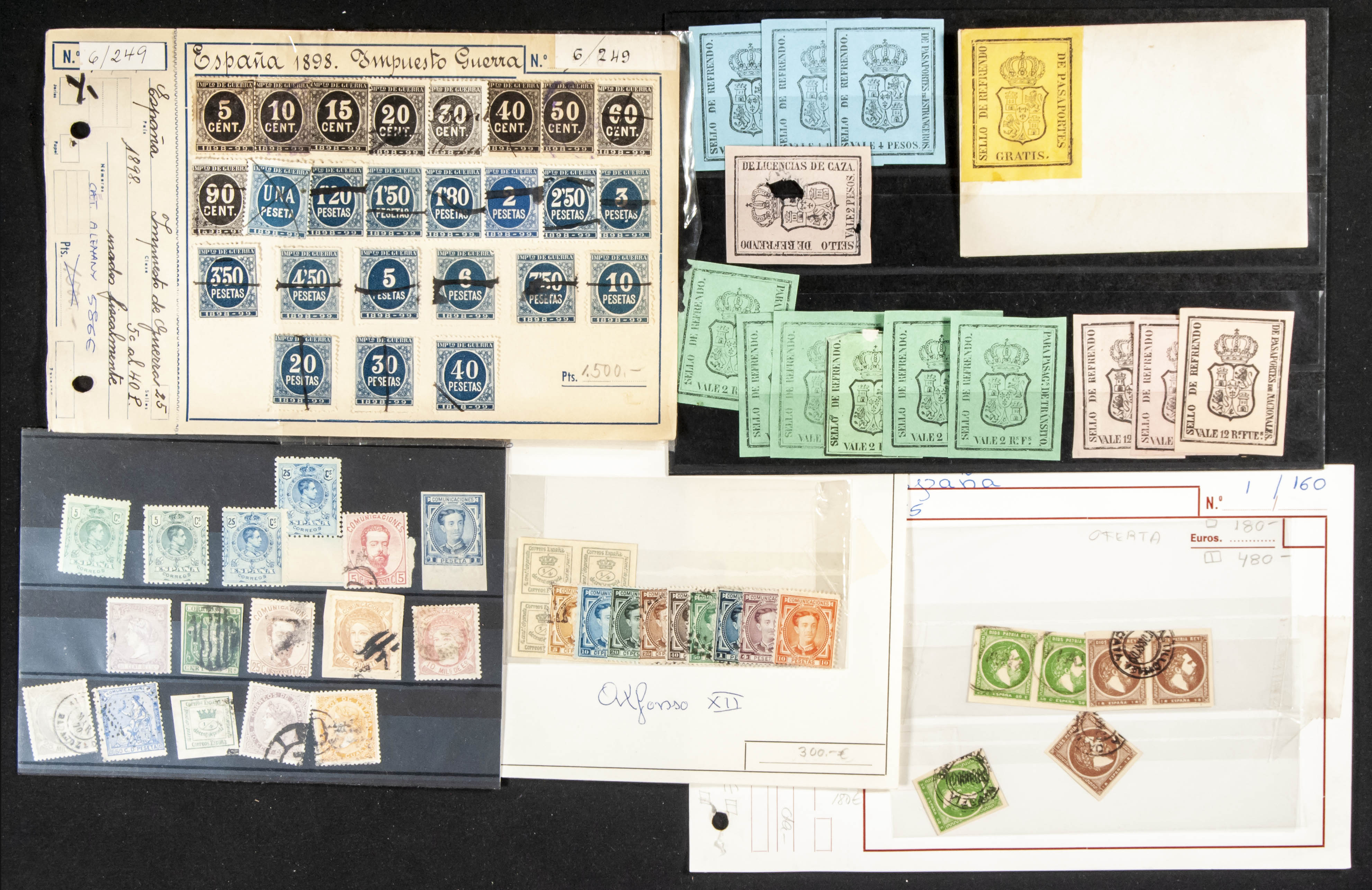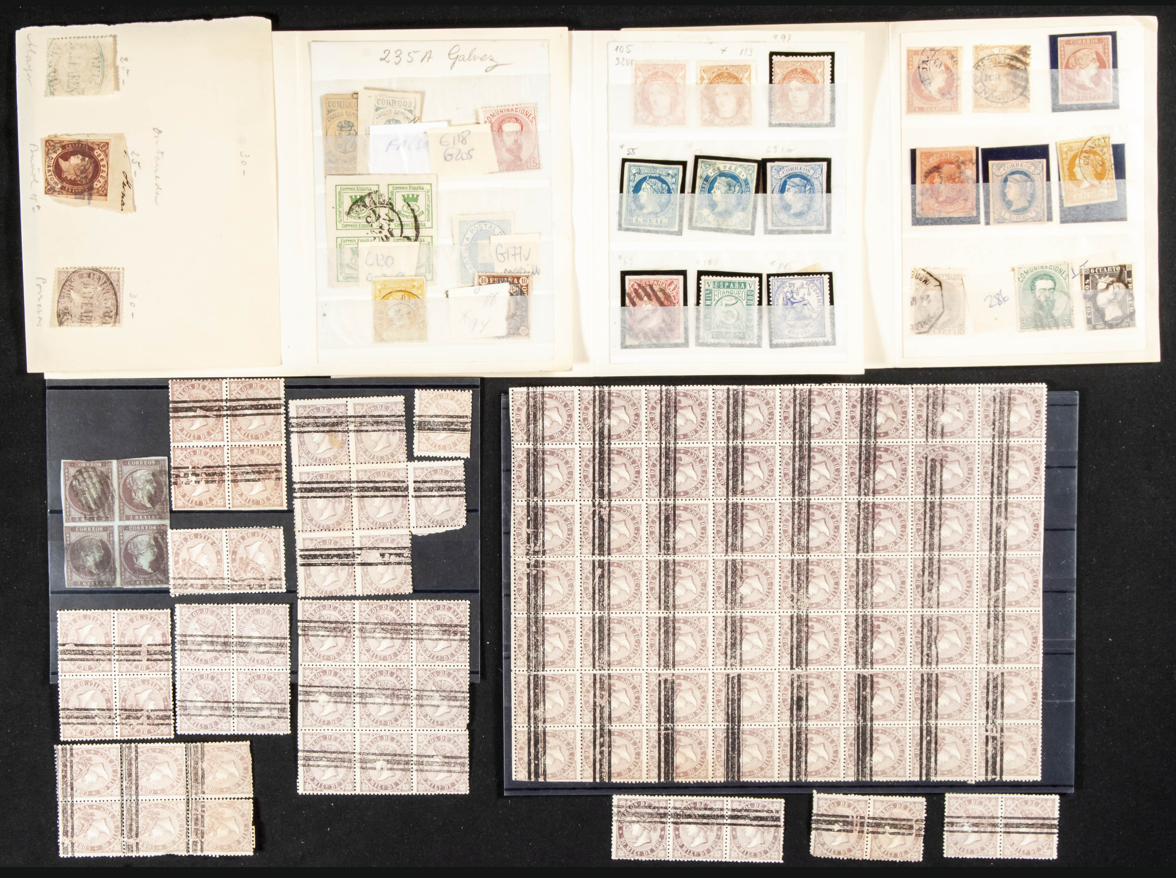 (★)/(1850ca). Conjunto de sellos clásicos en nuevo y usado (mayoría), algunos con matasellos especiales, destacando un bloque de cincuenta y seis barrado de 50 mils de 1868, serie completa de Alfonso XII de 1876 (nueva y usada), varios sellos con sobrecarga HABILITADO POR LA NACION y algún sello de Alfonso XIII. A EXAMINAR.