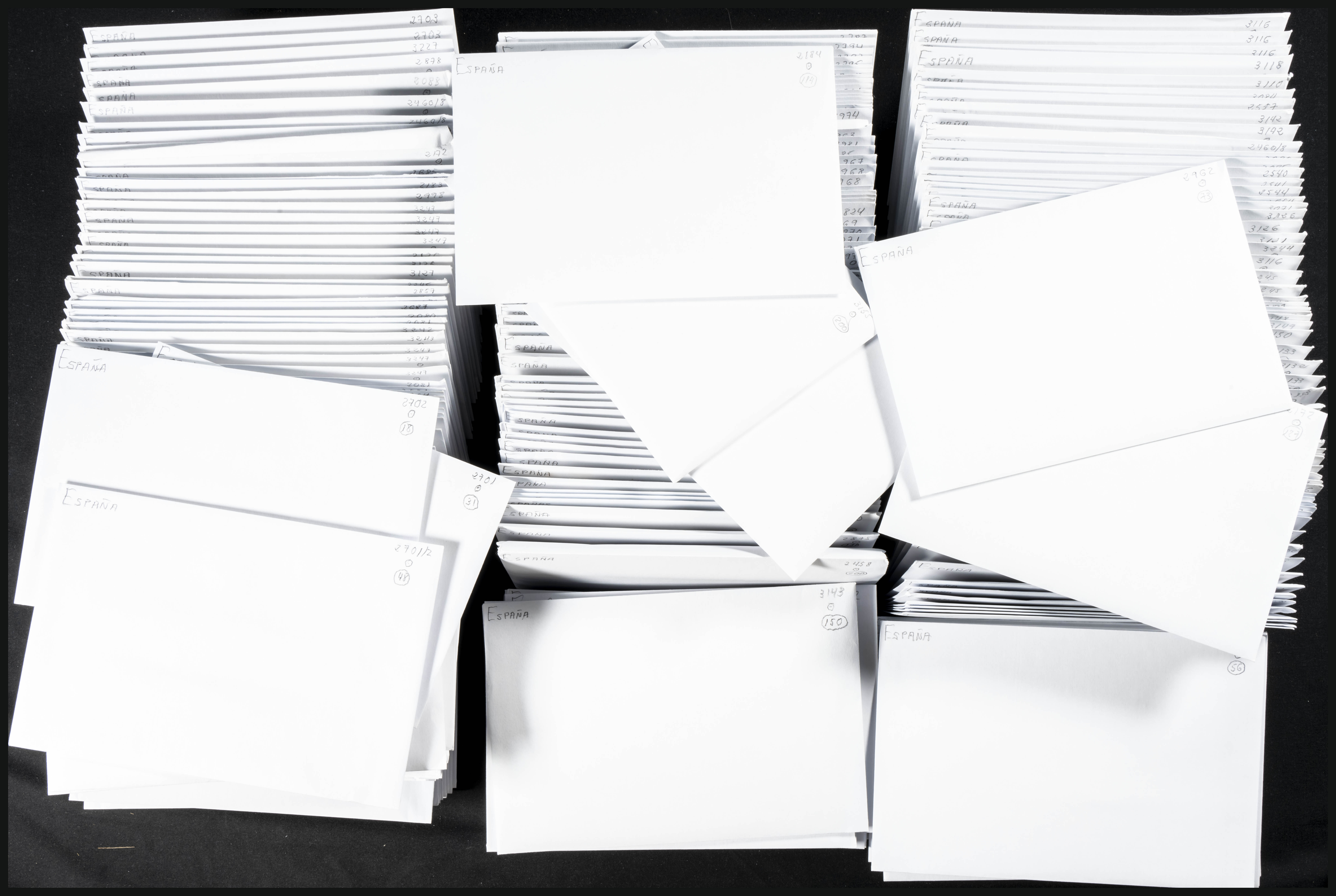 (1956ca). Espectacular conjunto-stock de más de cien mil sellos usados entre 1956 y 1993, organizados en sobres (dentro de cada sobre ordenados en fichas) con indicación del número de catálogo Edifil y la cantidad de cada uno con repeticiones entre cuatro y doscientas unidades de cada. ALTISIMO VALOR DE CATALOGO. IMPRESCINDIBLE EXAMINAR.