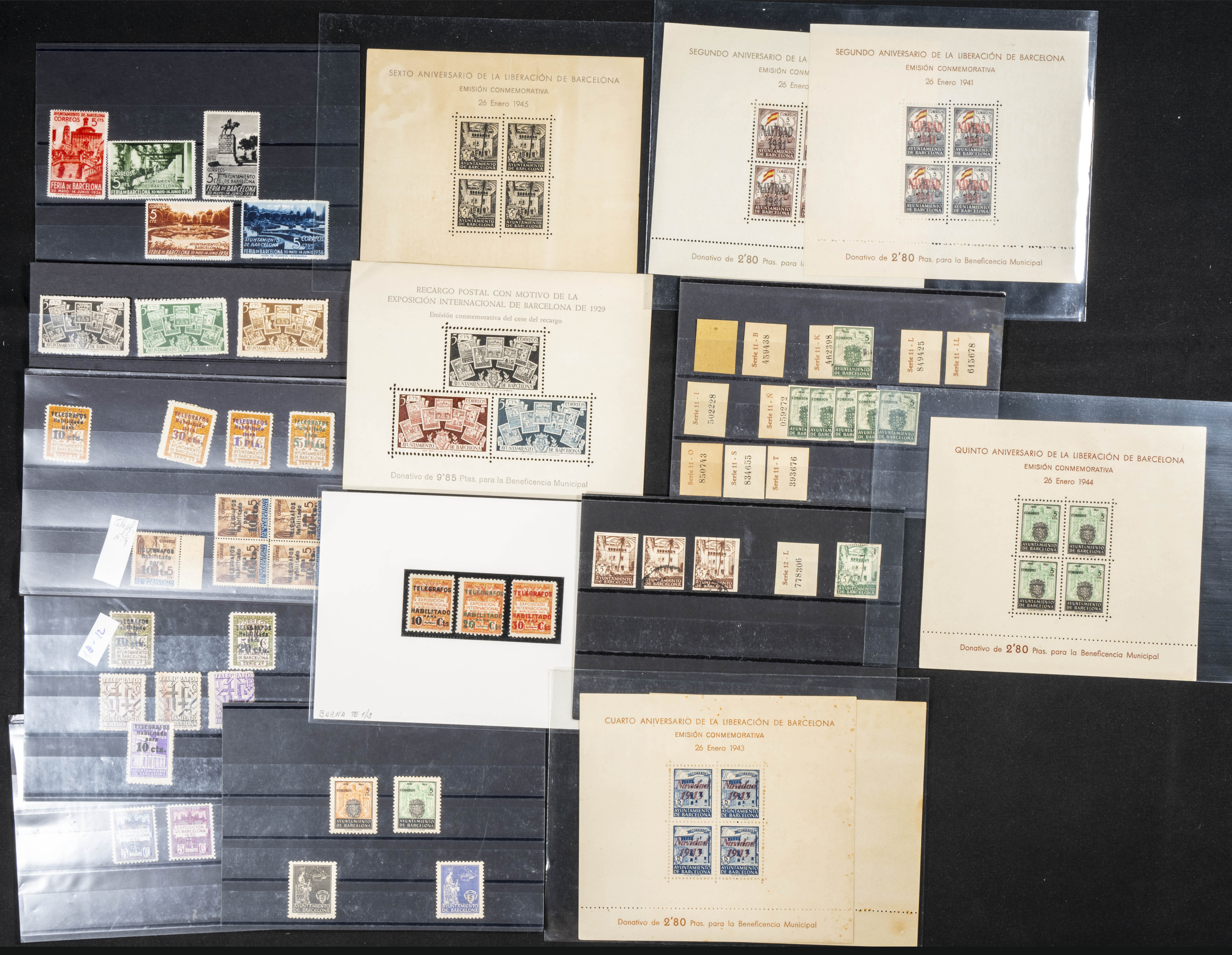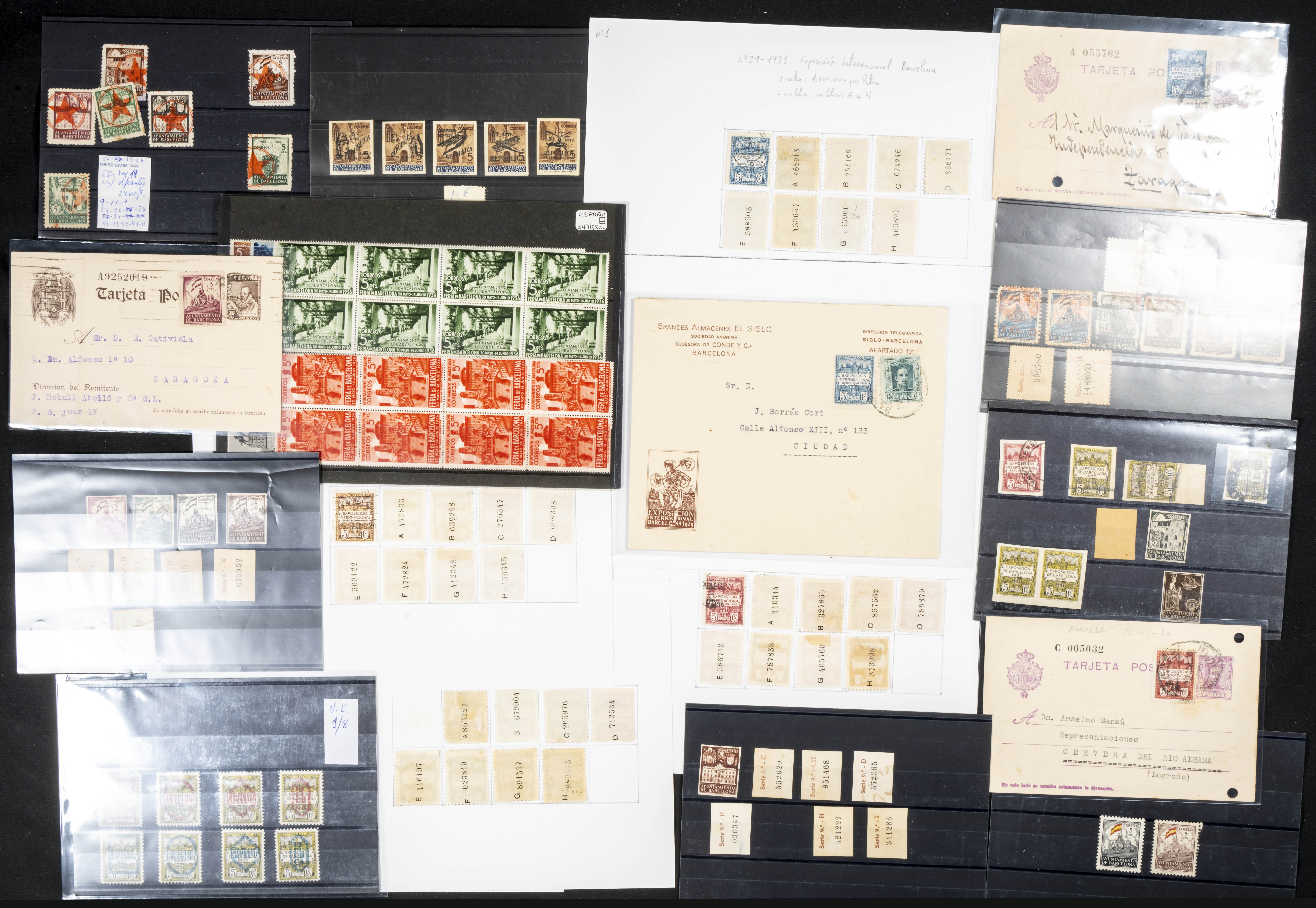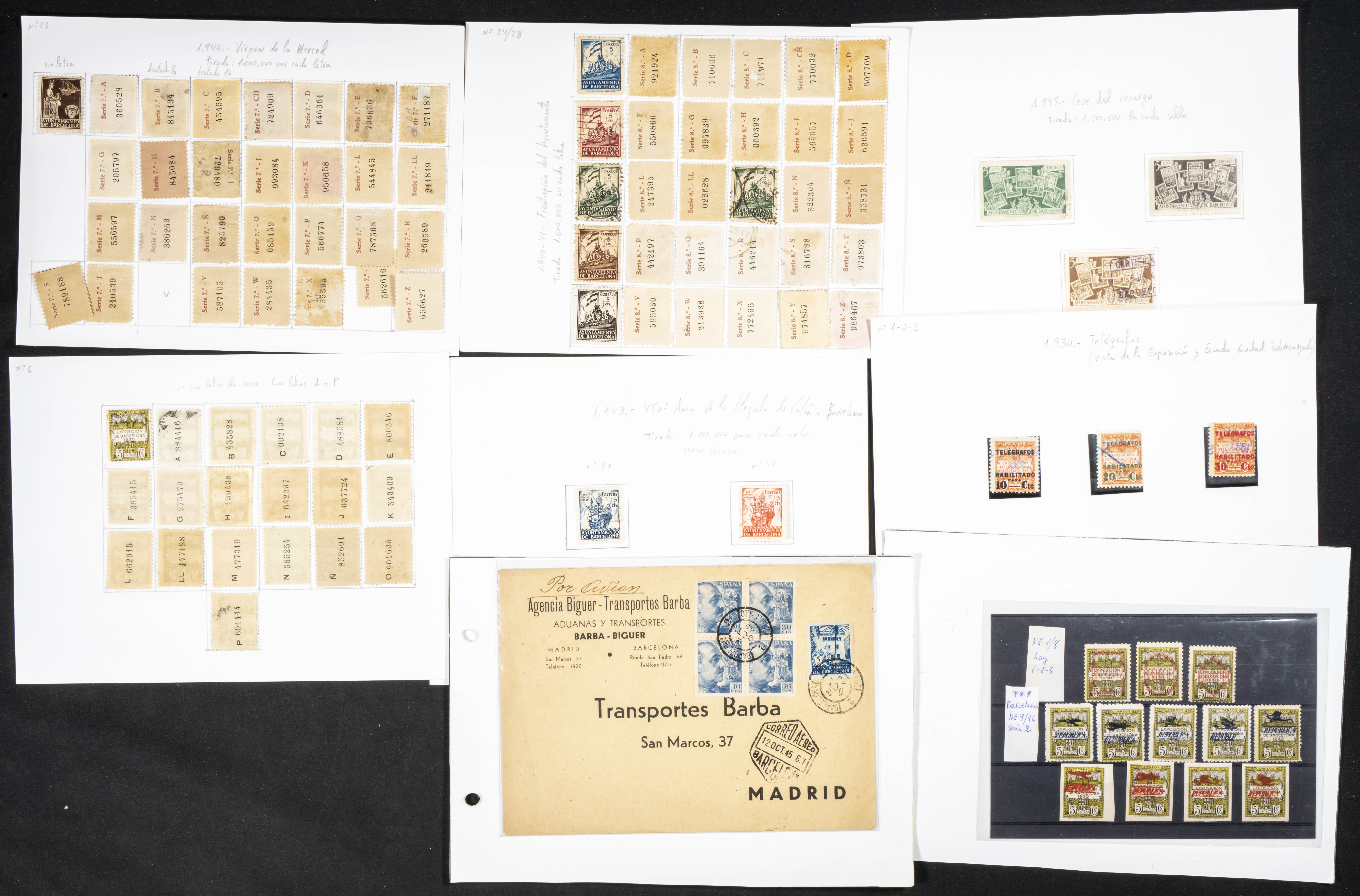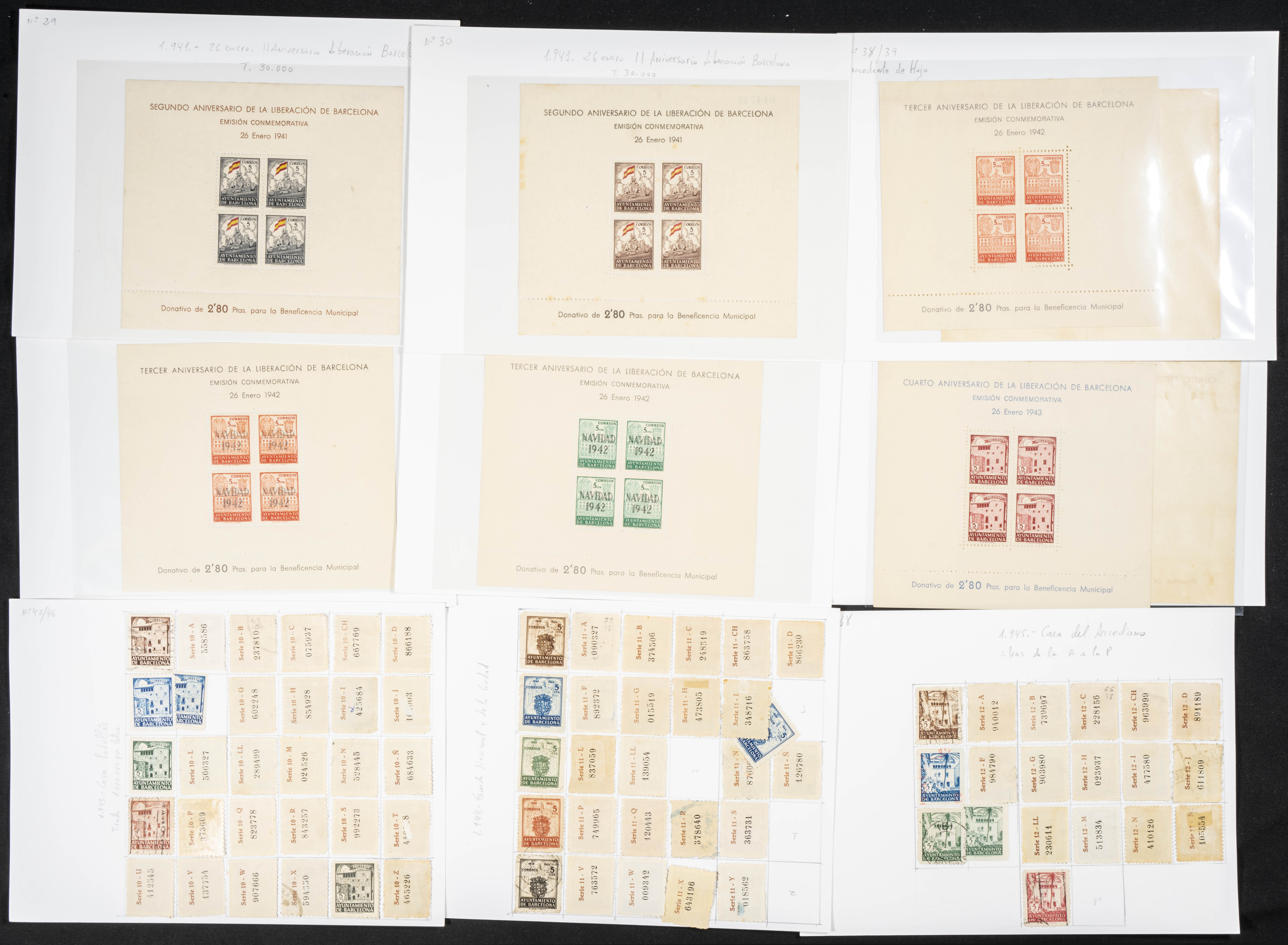 ★/(1928ca). Conjunto de series completas, sellos sueltos y hojas bloque del Ayuntamiento de Barcelona, en nuevo y usado, alguna en bloque e incluyendo un conjunto con numeraciones al dorso, cartas y variedades, además de varios conjuntos de Beneficencia, Cruzada contra el Frío y Franquicias Militares, en nuevo y usado. ALTISIMO VALOR DE CATALOGO. A EXAMINAR.