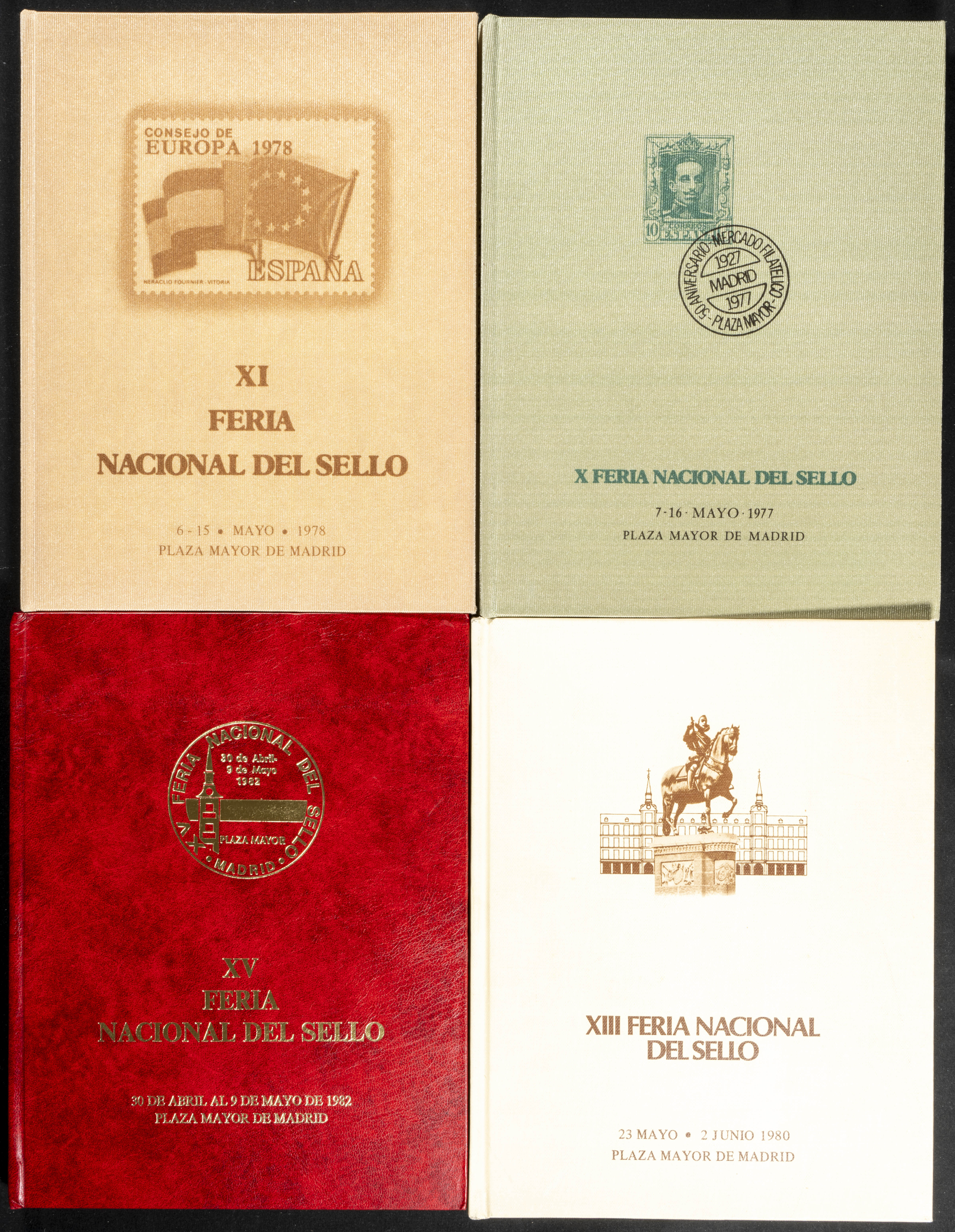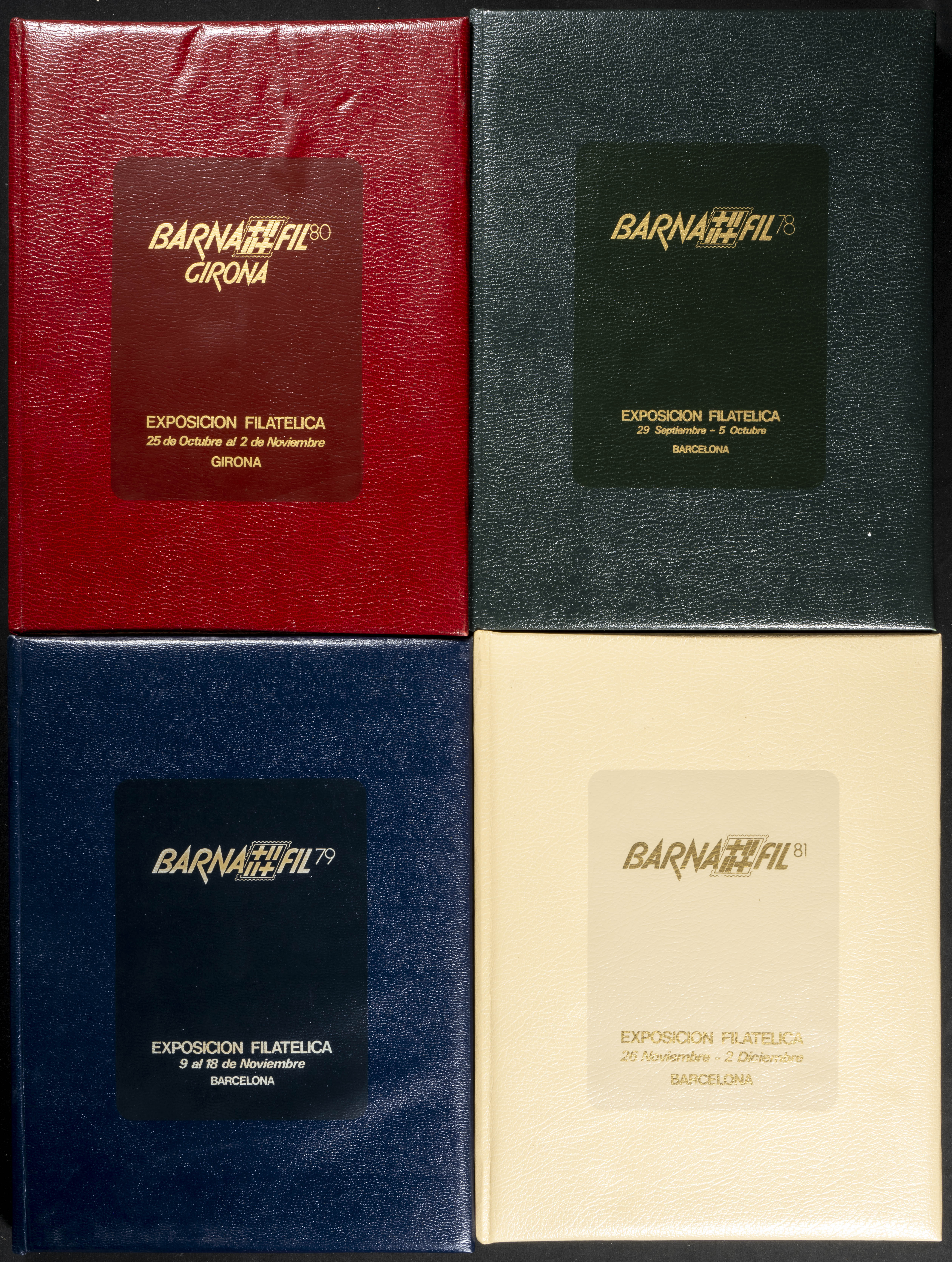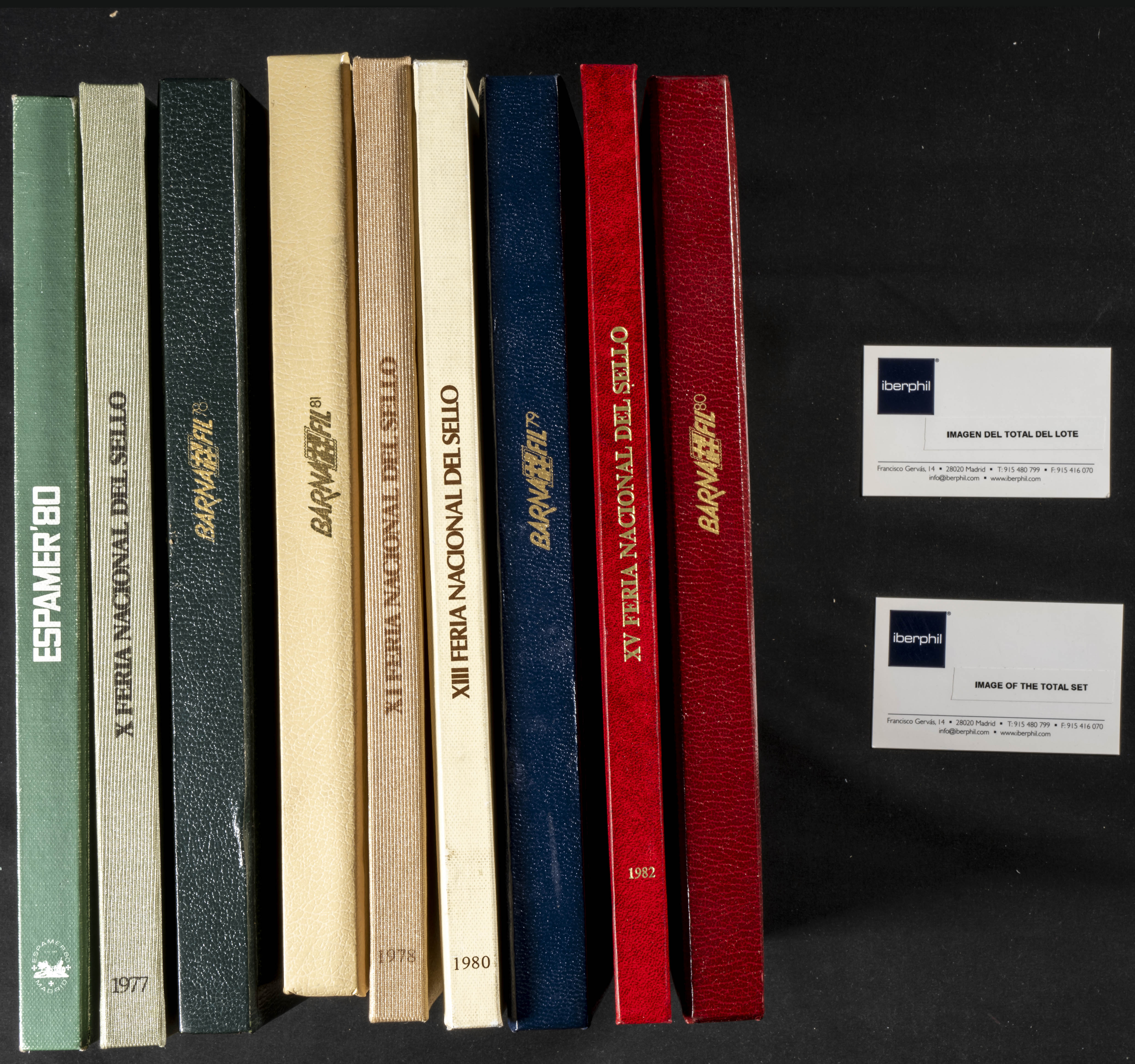 (1978ca). Conjunto de nueve libros de Exposiciones Filatélicas, cuatro de la Feria Nacional del Sello (X, XI, XIII y XV), cuatro de Barnafil (78, 79, 80 y 81) y uno de Espamer 80, con sobres conmemorativos y hojas recuerdo de los diferentes eventos. A EXAMINAR