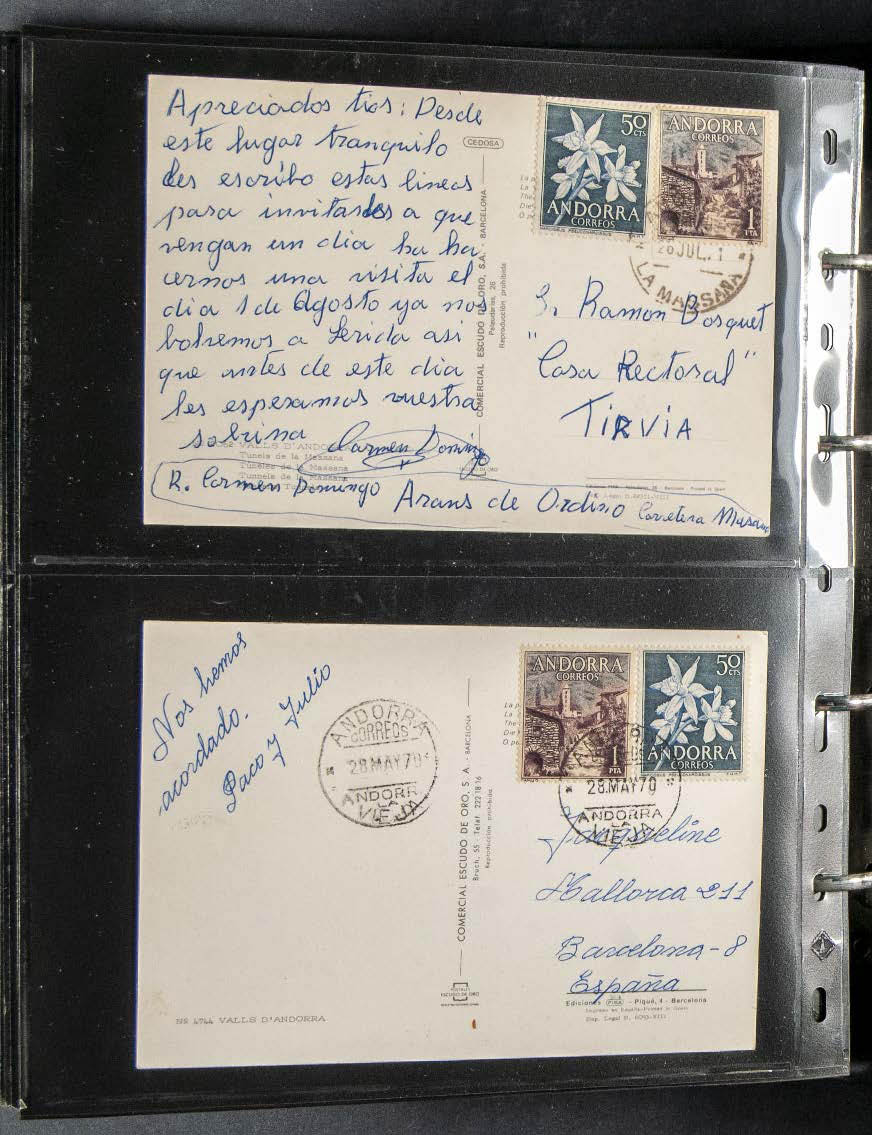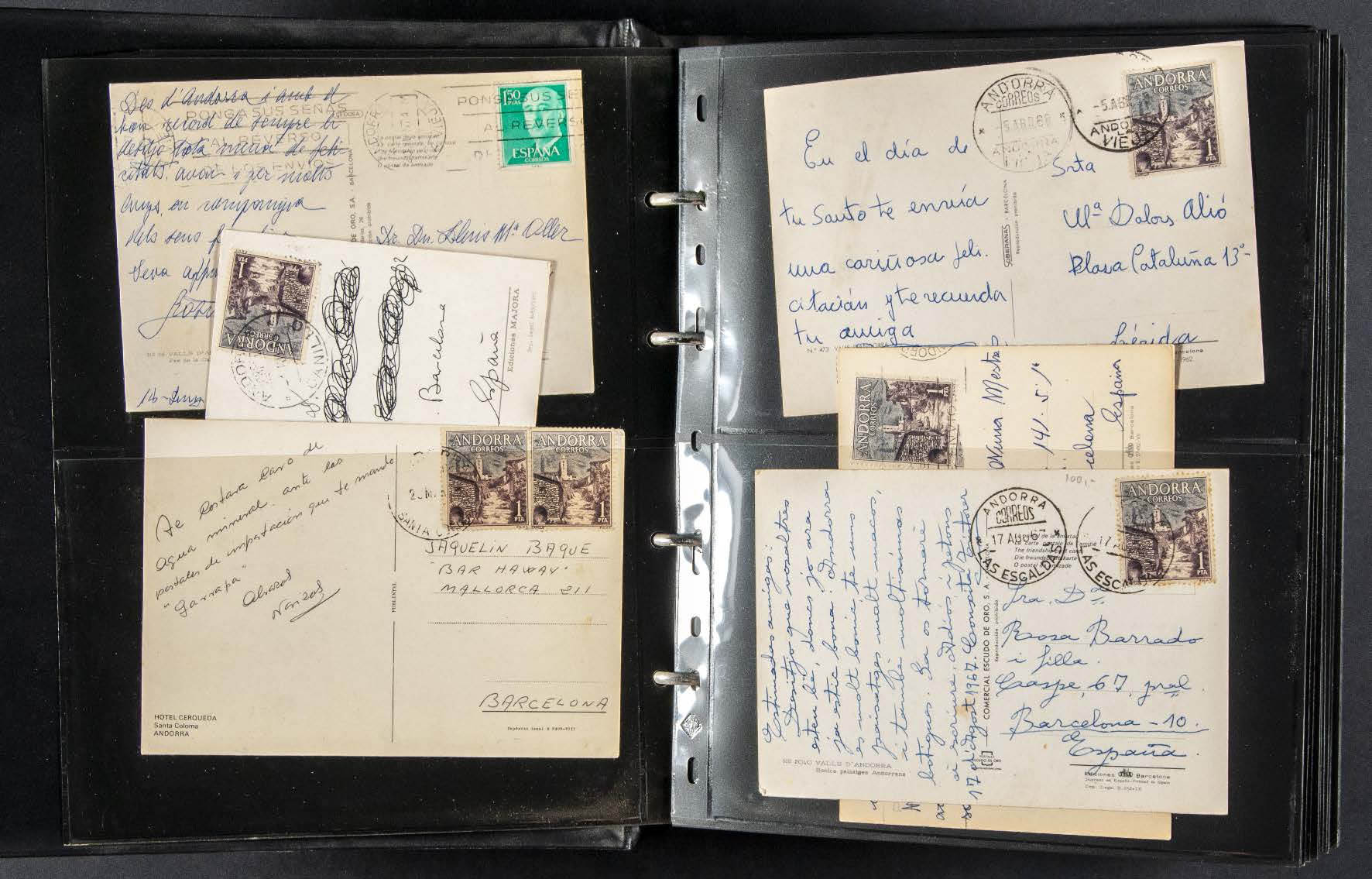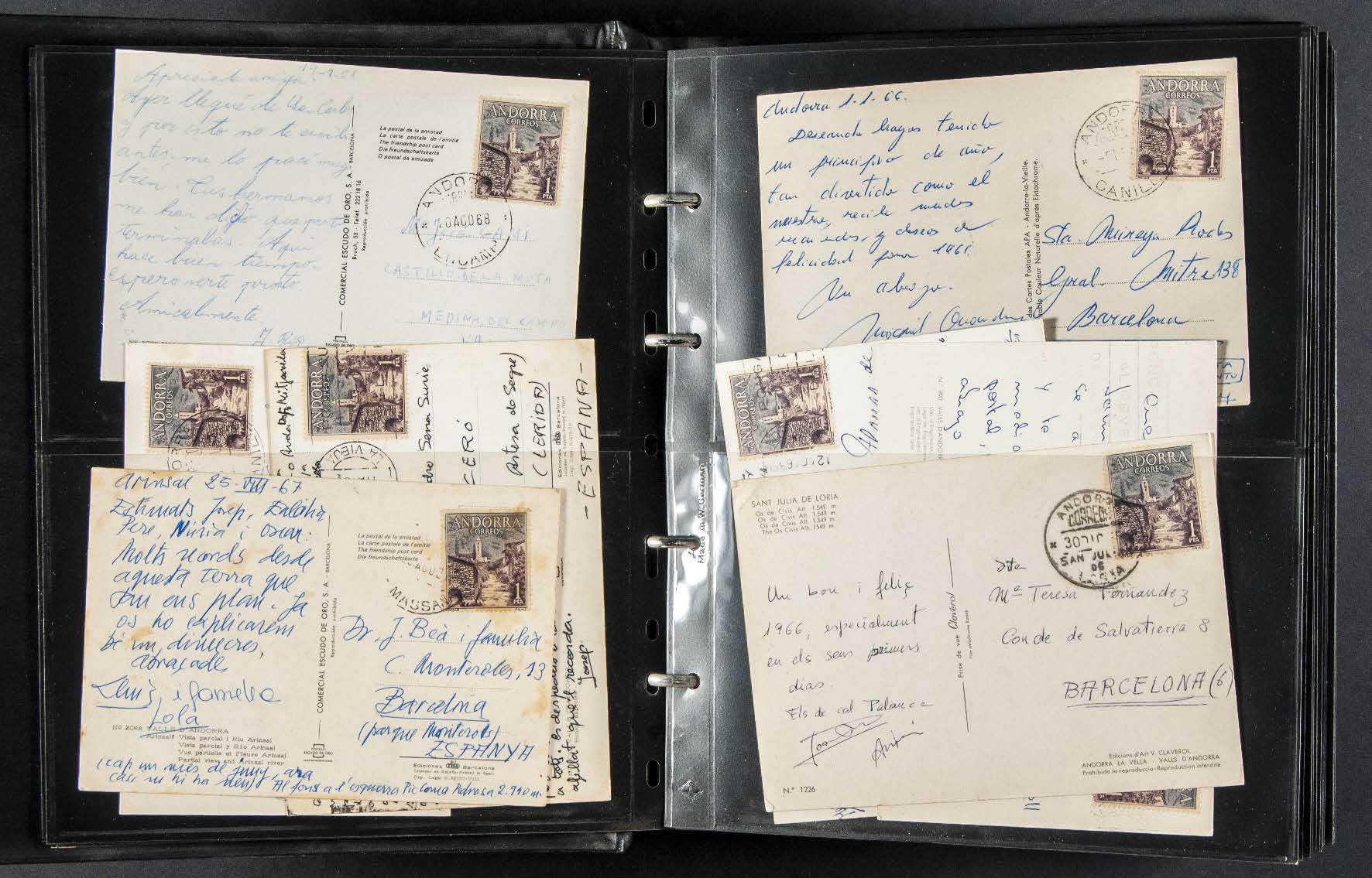 (1952ca). Interesante conjunto de más de doscientas tarjetas postales circuladas desde Andorra y franqueadas con sellos españoles y andorranos entre 1952 y 1988, algunas con sellos del Correo Francés. A EXAMINAR.