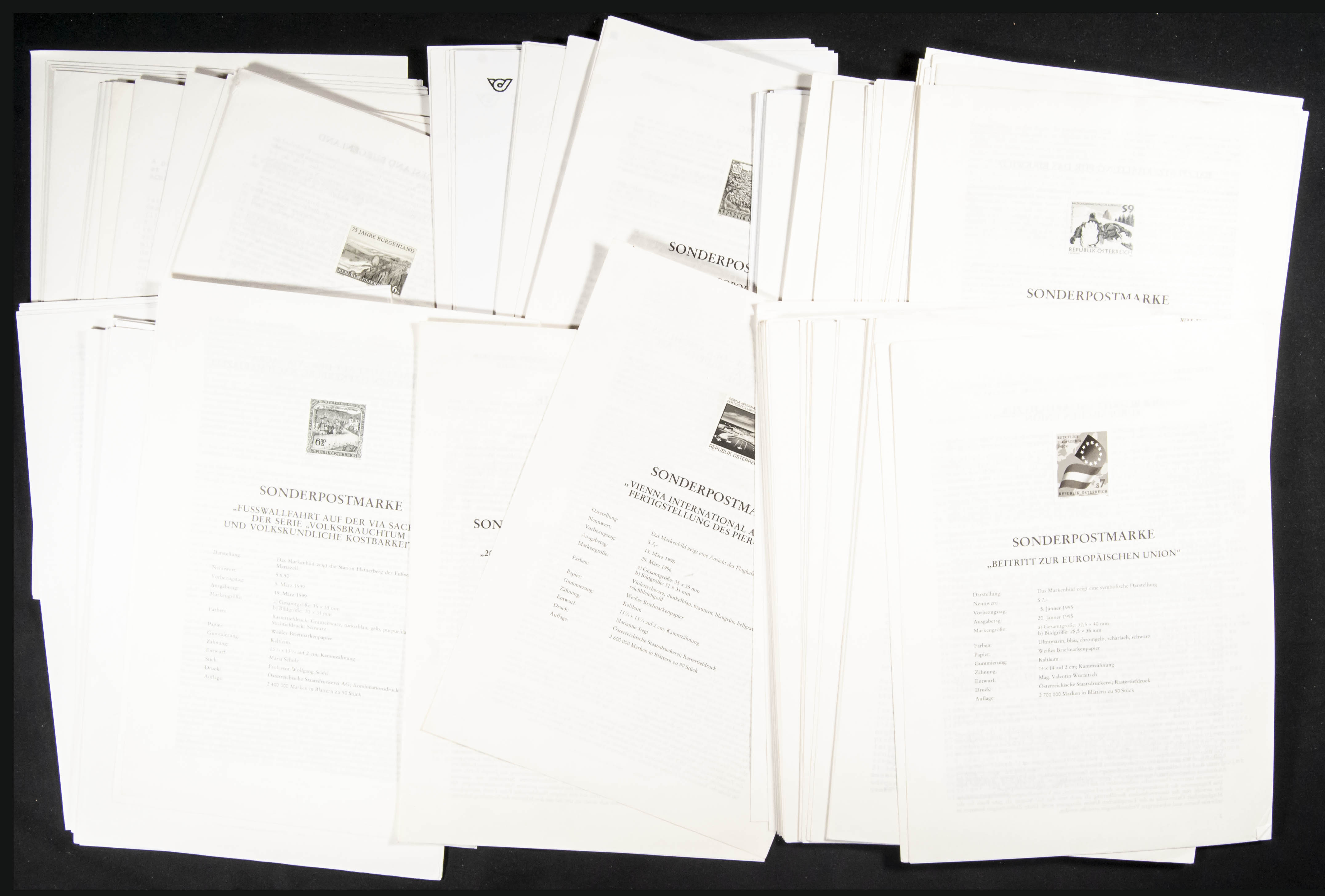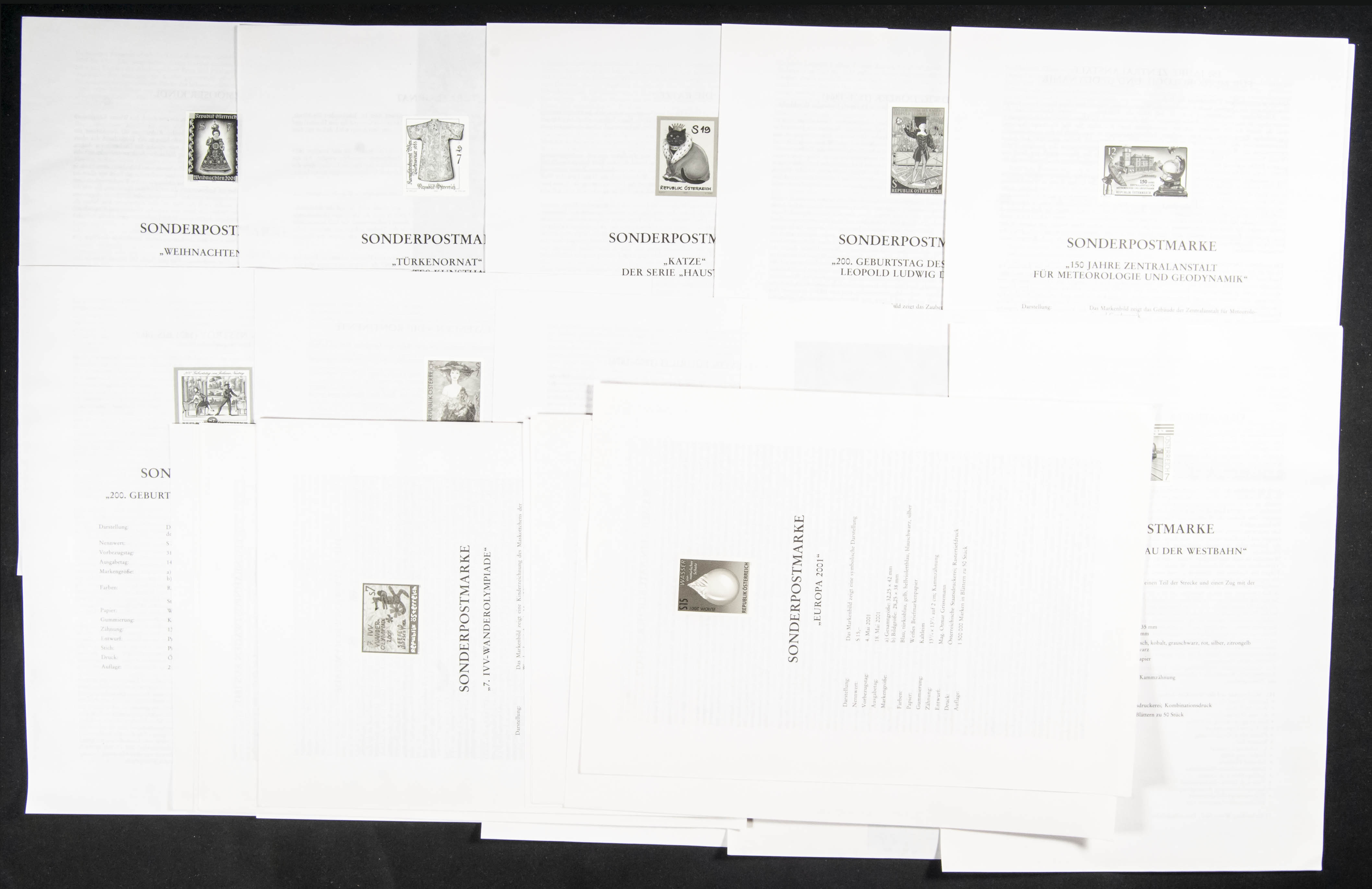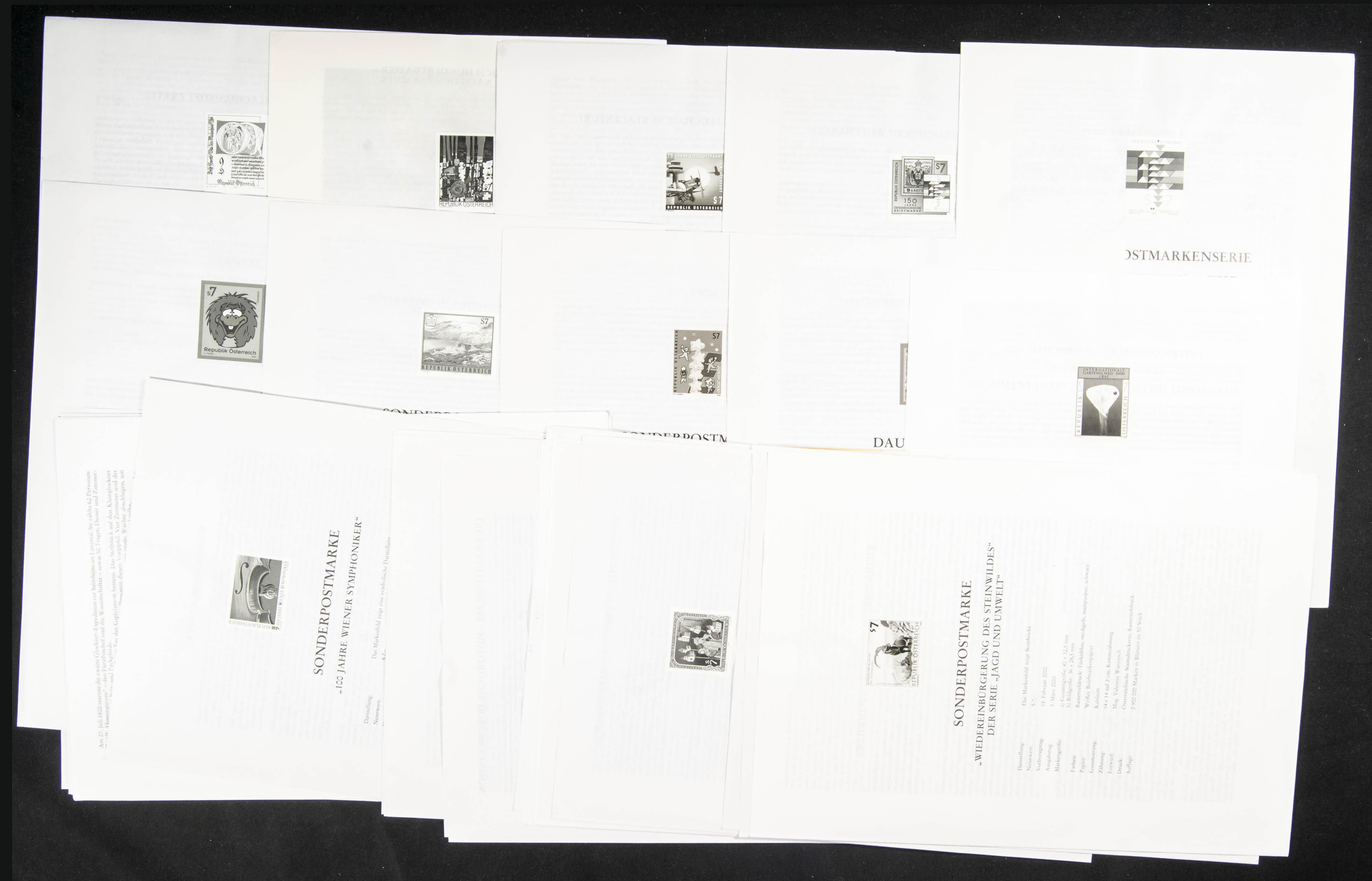 (★)(1981ca). Interesante conjunto de cientos de hojas de presentación de Austria entre 1981 y 2004 con sellos sin dentar en negro adheridos en cada hoja (Sonder-postmarke, schwarzdruk). ALTO VALOR DE CATALOGO. INUSUAL CONJUNTO. A EXAMINAR.