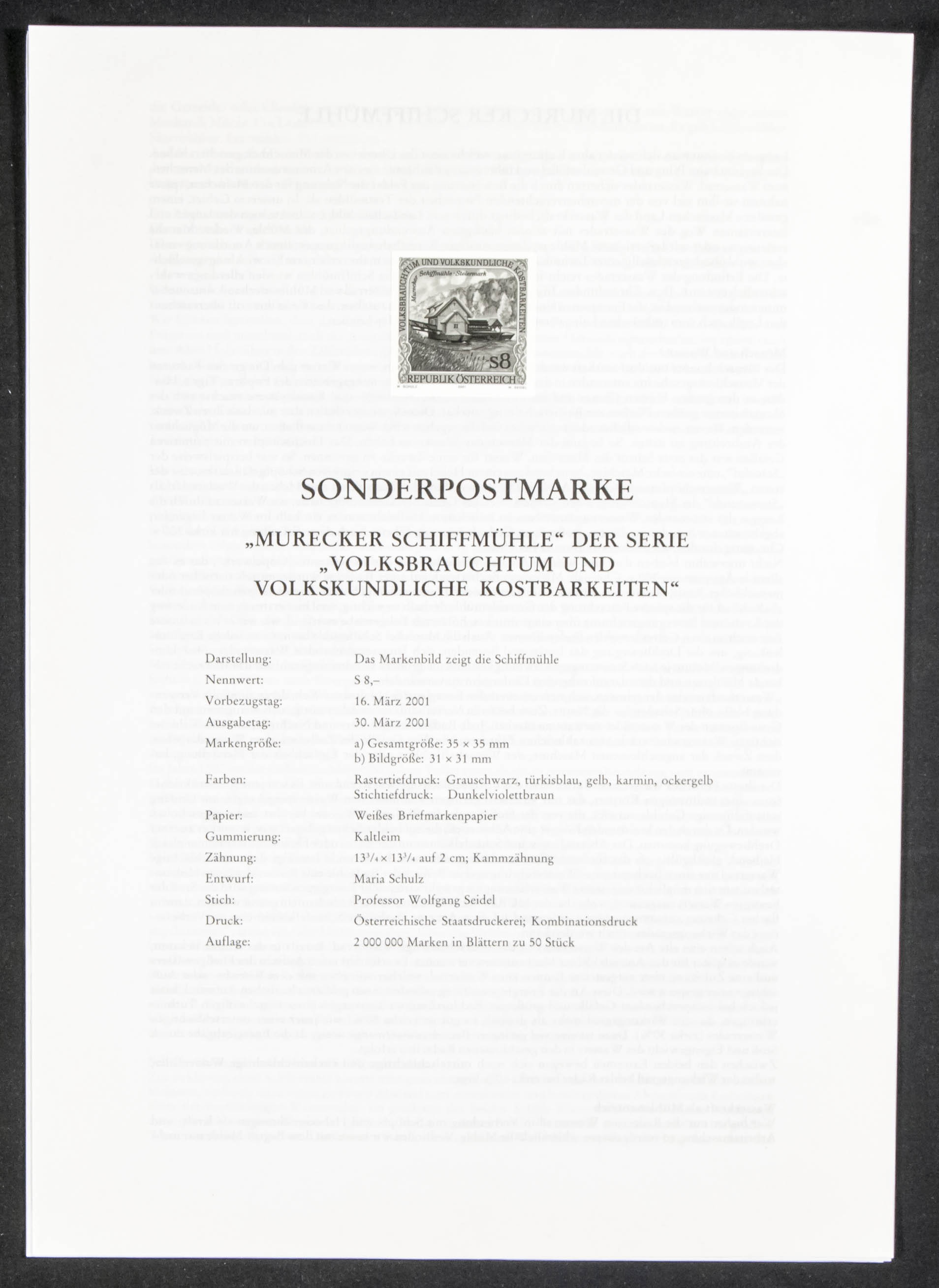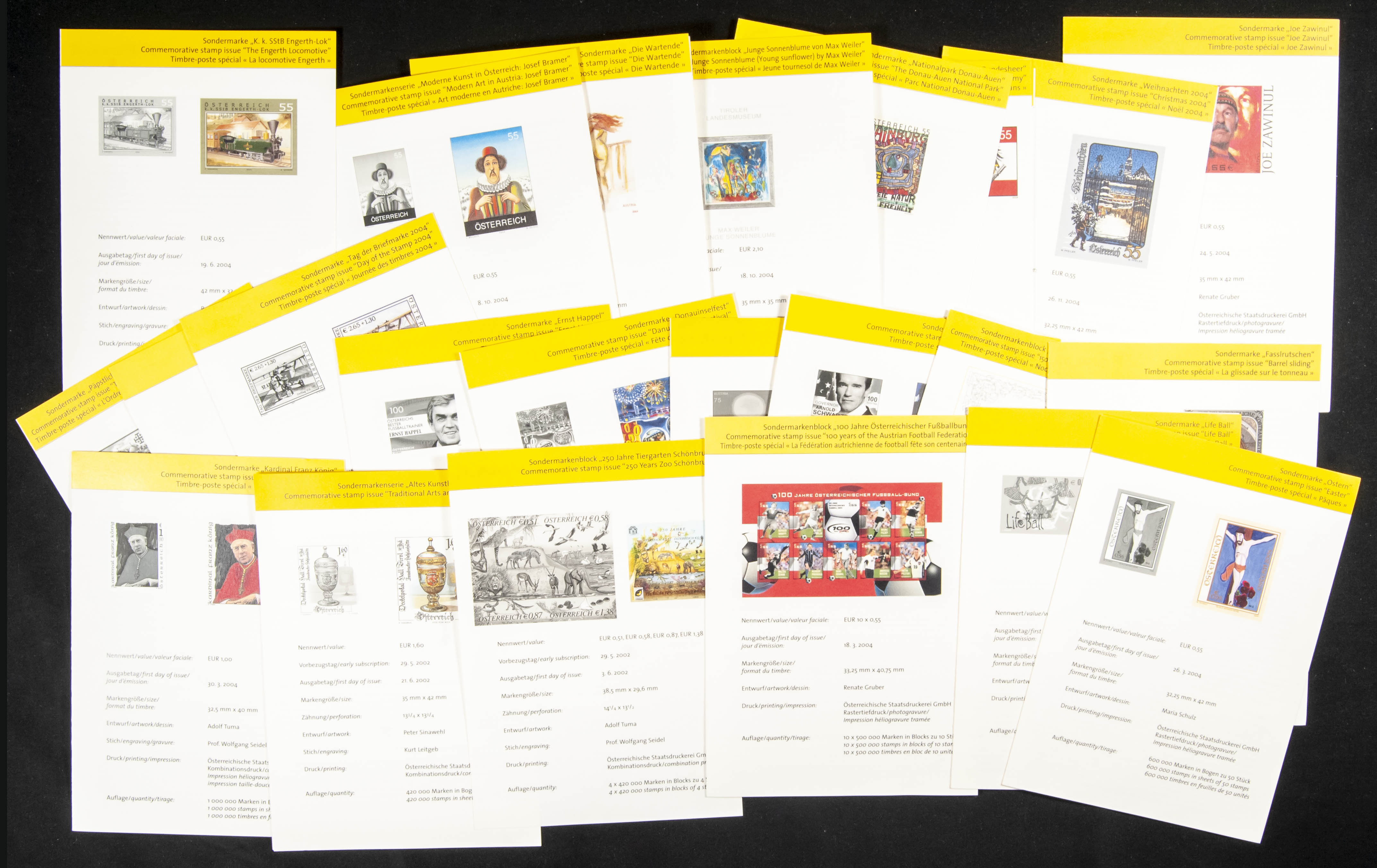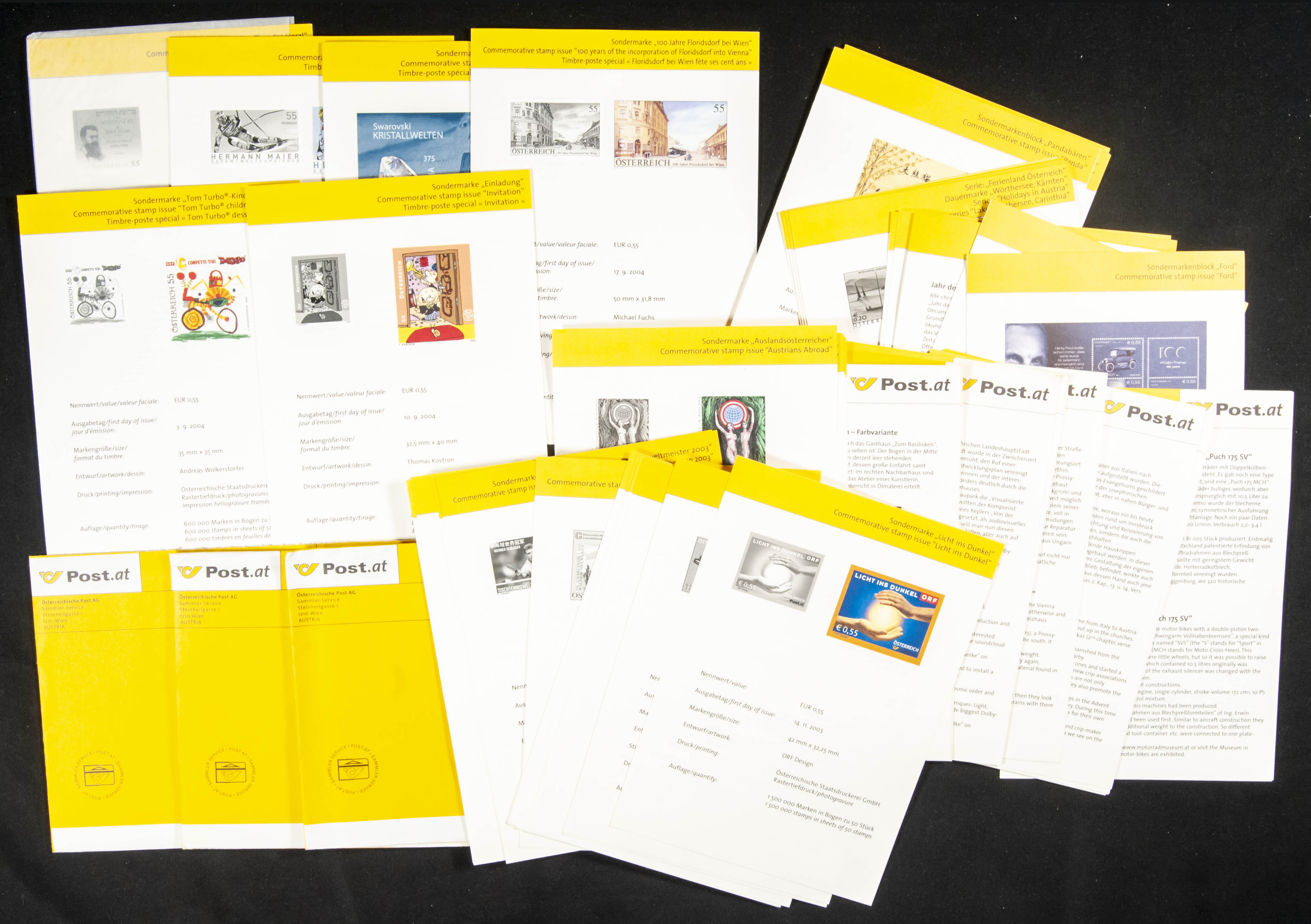 (★)(1981ca). Interesante conjunto de cientos de hojas de presentación de Austria entre 1981 y 2004 con sellos sin dentar en negro adheridos en cada hoja (Sonder-postmarke, schwarzdruk). ALTO VALOR DE CATALOGO. INUSUAL CONJUNTO. A EXAMINAR.