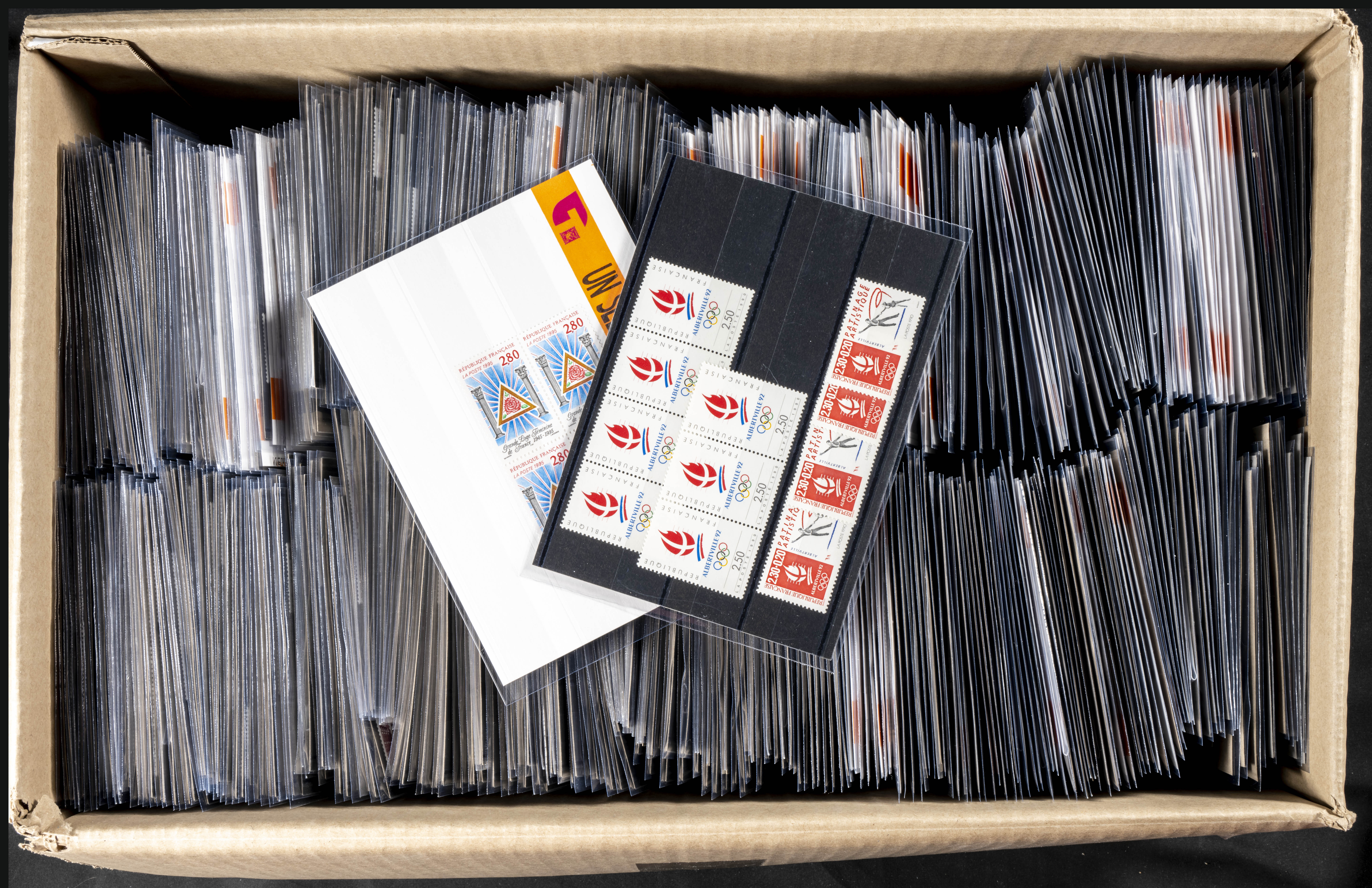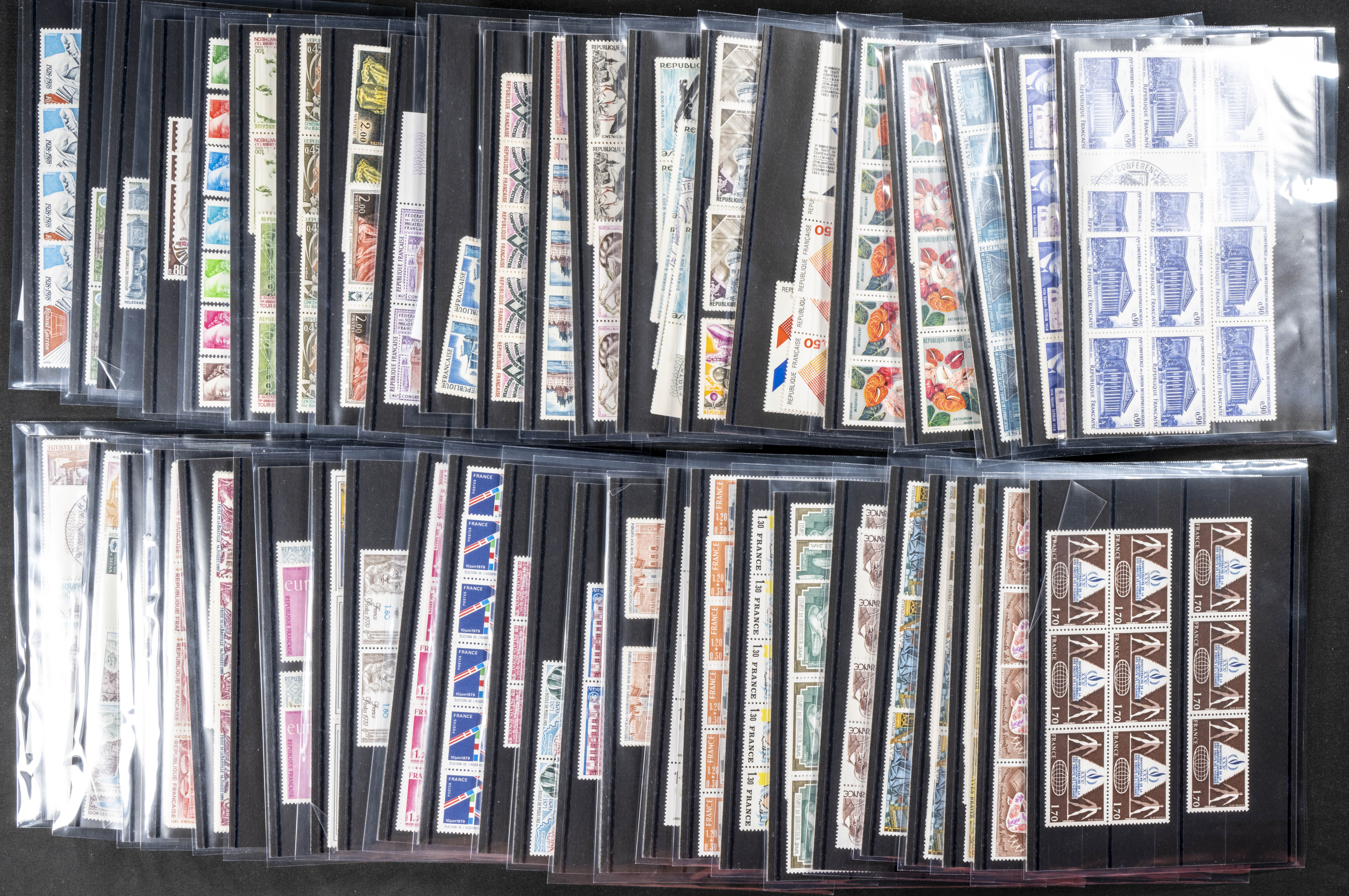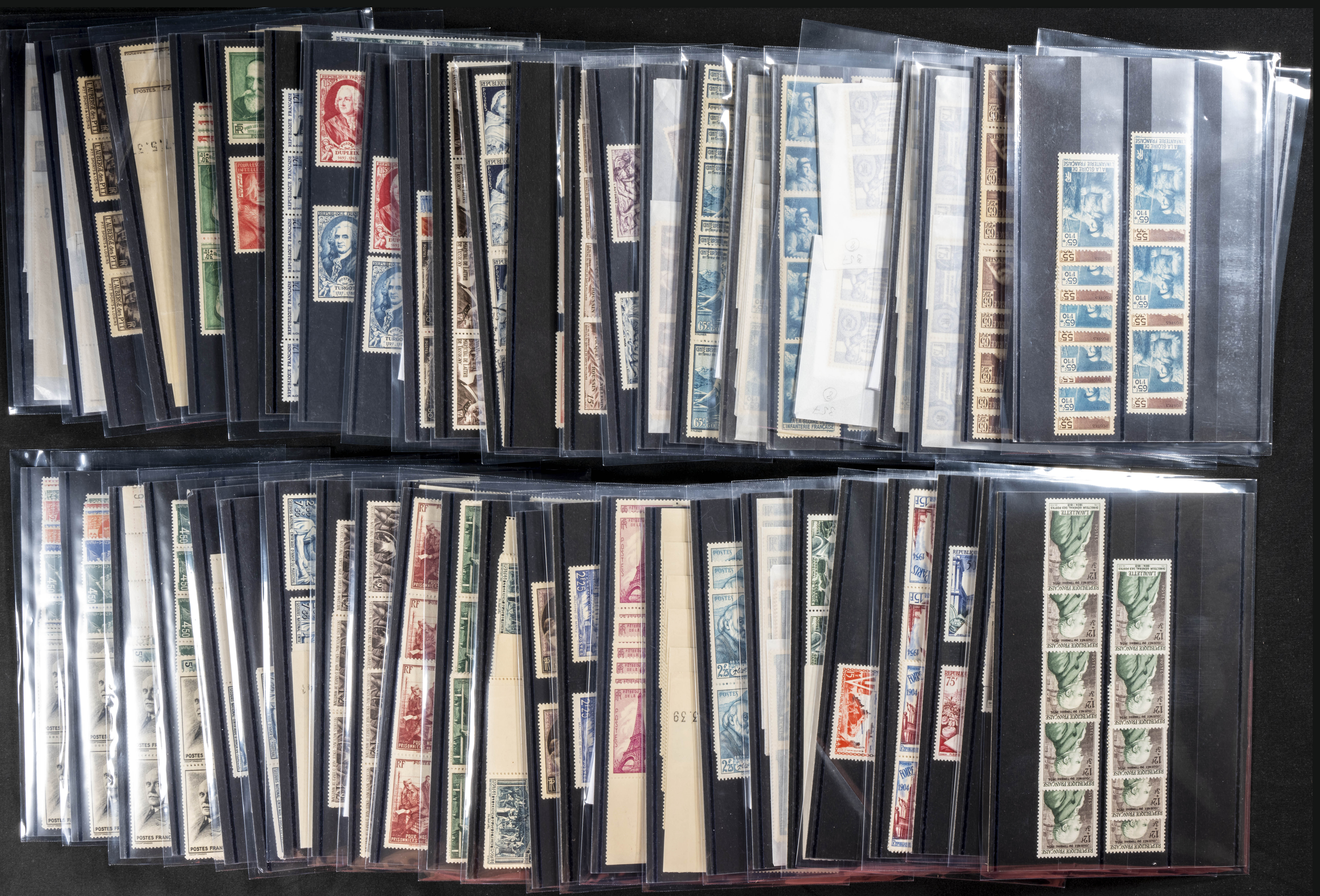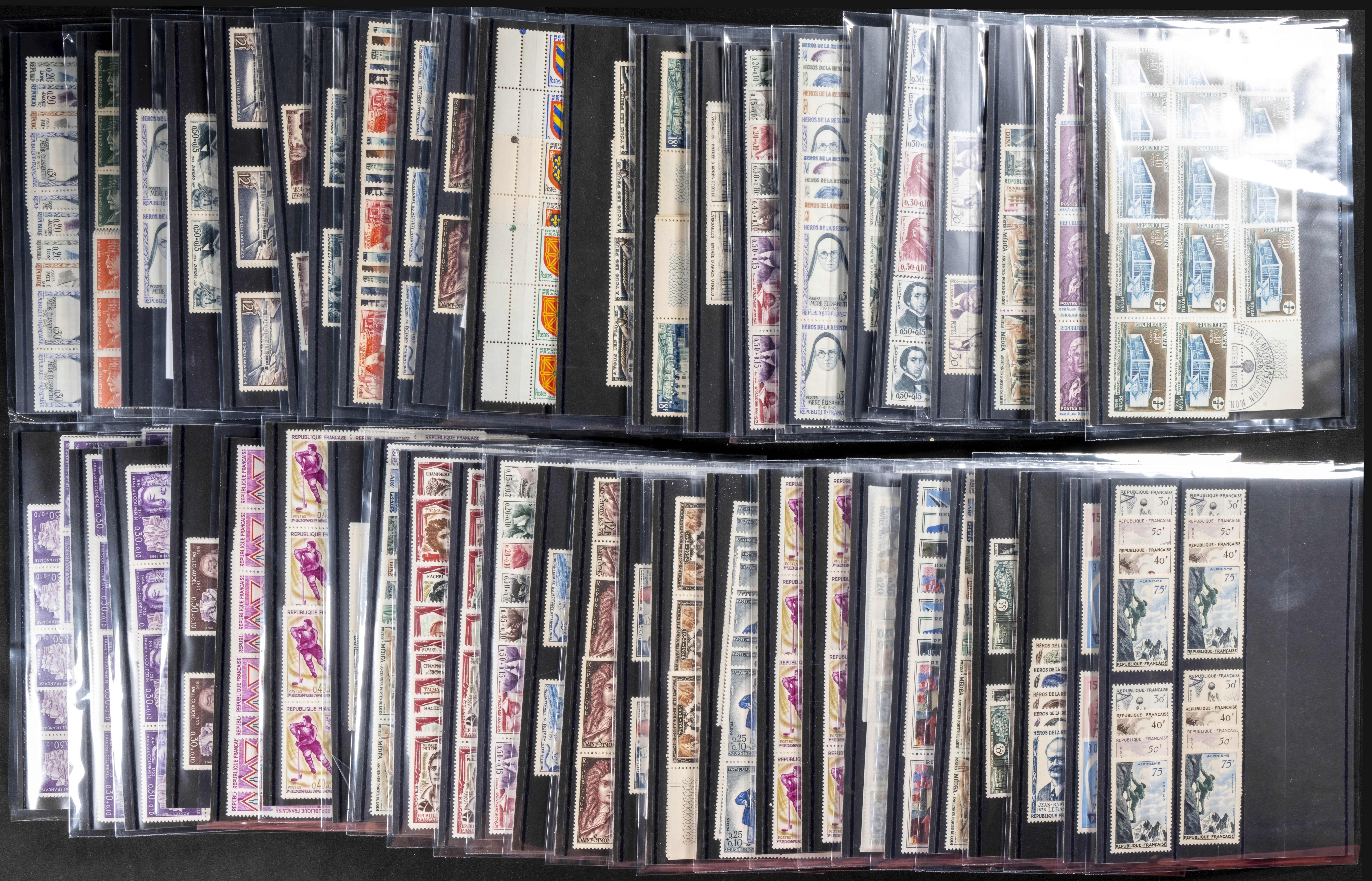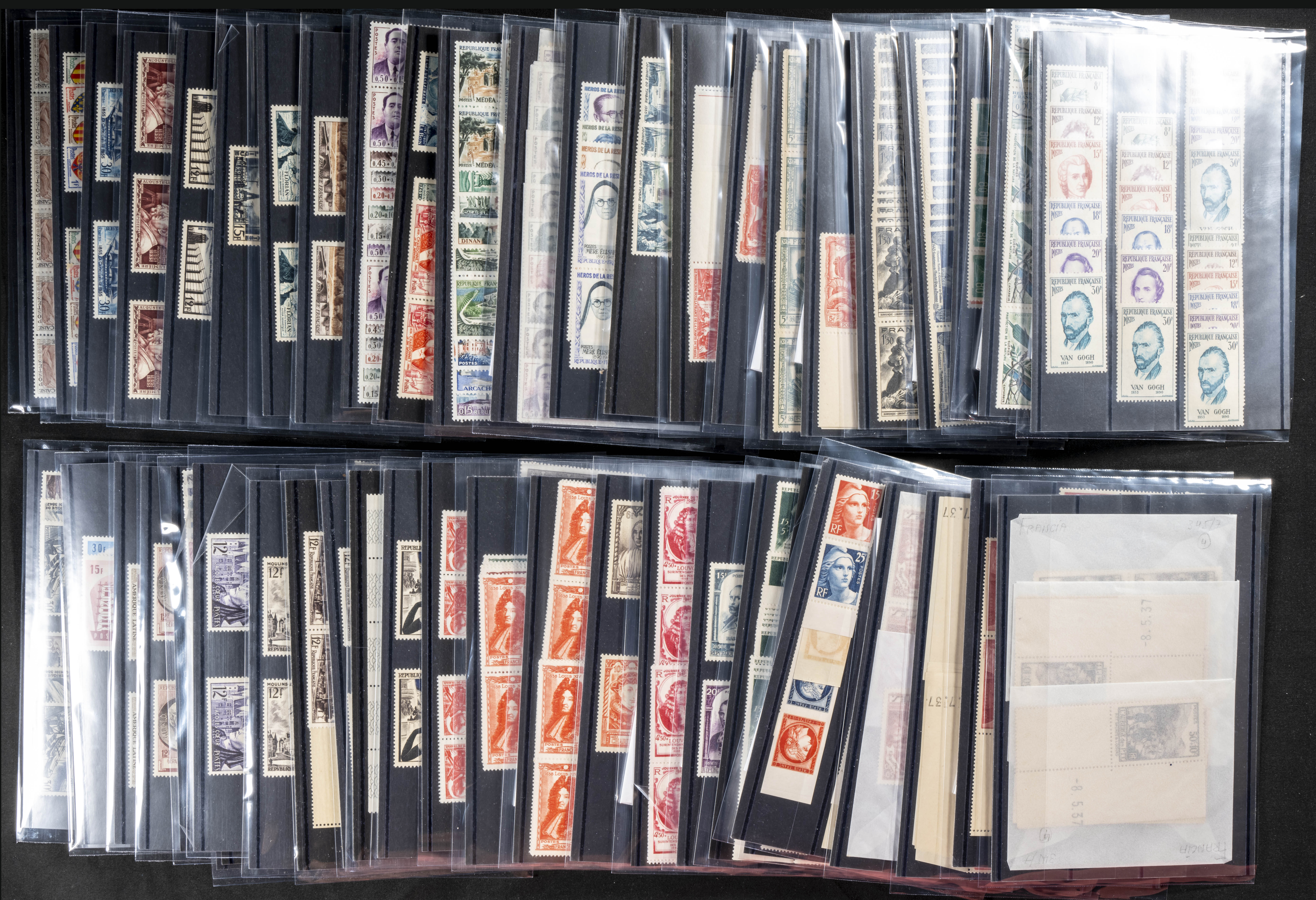 ★★/(1926ca). Interesante conjunto stock de series completas y sellos sueltos de Francia en nuevo (alguno usado) entre 1926 y 2000, la mayoría sin fijasellos y repeticiones en algunos casos hasta cien unidades, la mayor parte con indicación del número Yvert. A EXAMINAR. Yvert 2024: +37.200 Euros
