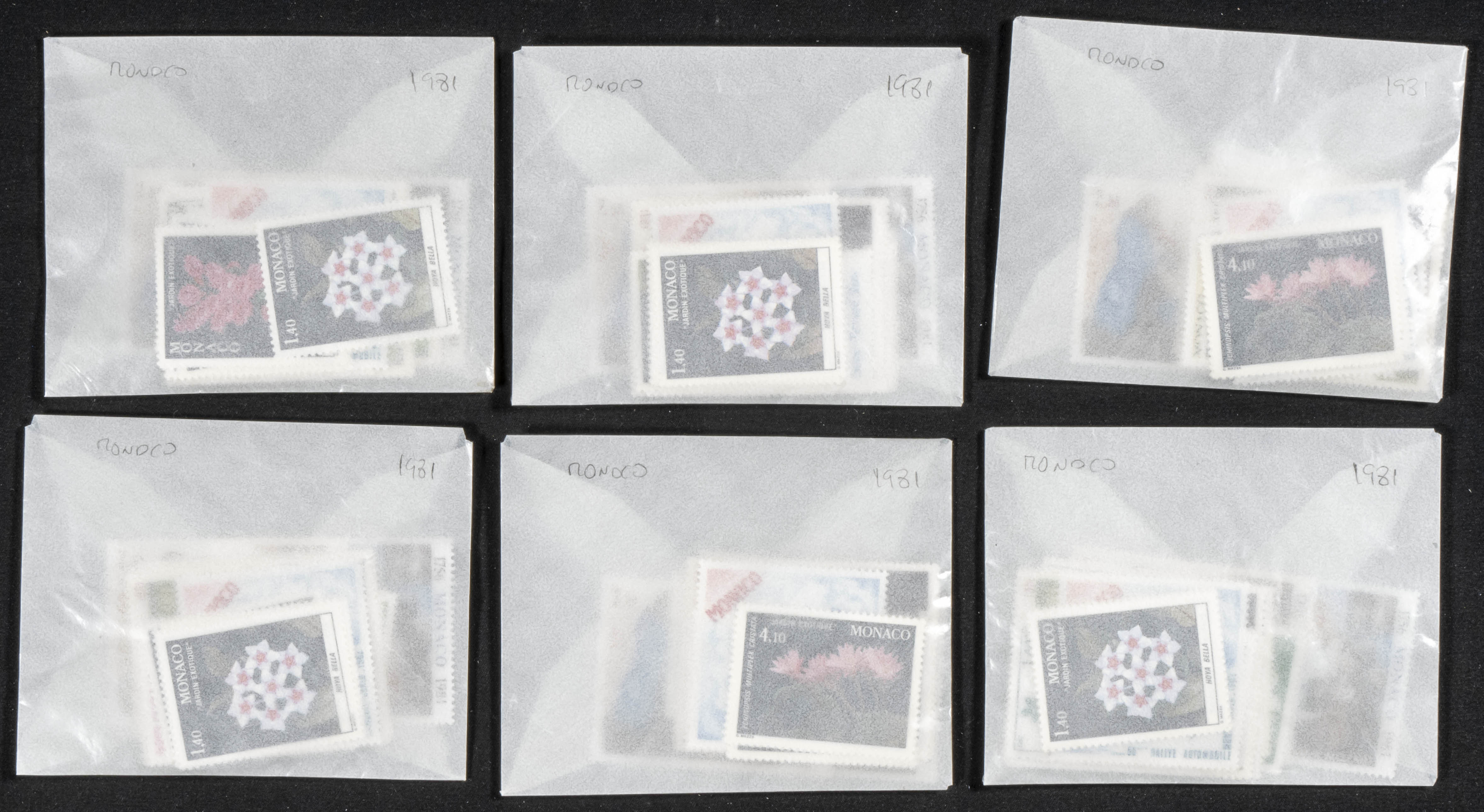 ★★Yvert 1264/05(6). 1981. Conjunto de seis años completos 1981 (sólo correo ordinario y sin sello de hoja bloque) de Mónaco, en nuevo (en sobres de cristal). A EXAMINAR. Yvert 2023: 607 Euros