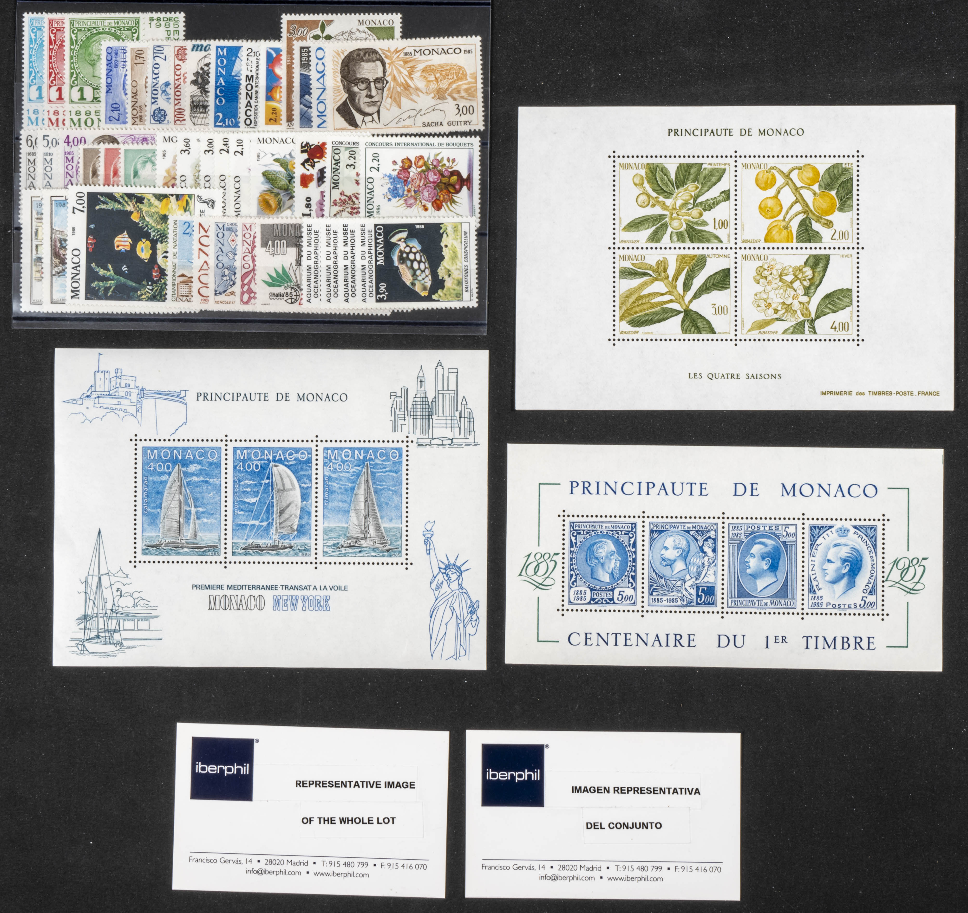 ★★Yvert 1456/09(10). 1985. Conjunto de diez años completos 1985 (sólo correo ordinario e incluyendo sellos de hojas bloque) de Mónaco, en nuevo (montados en fichas). A EXAMINAR. Yvert 2023: 1.190 Euros