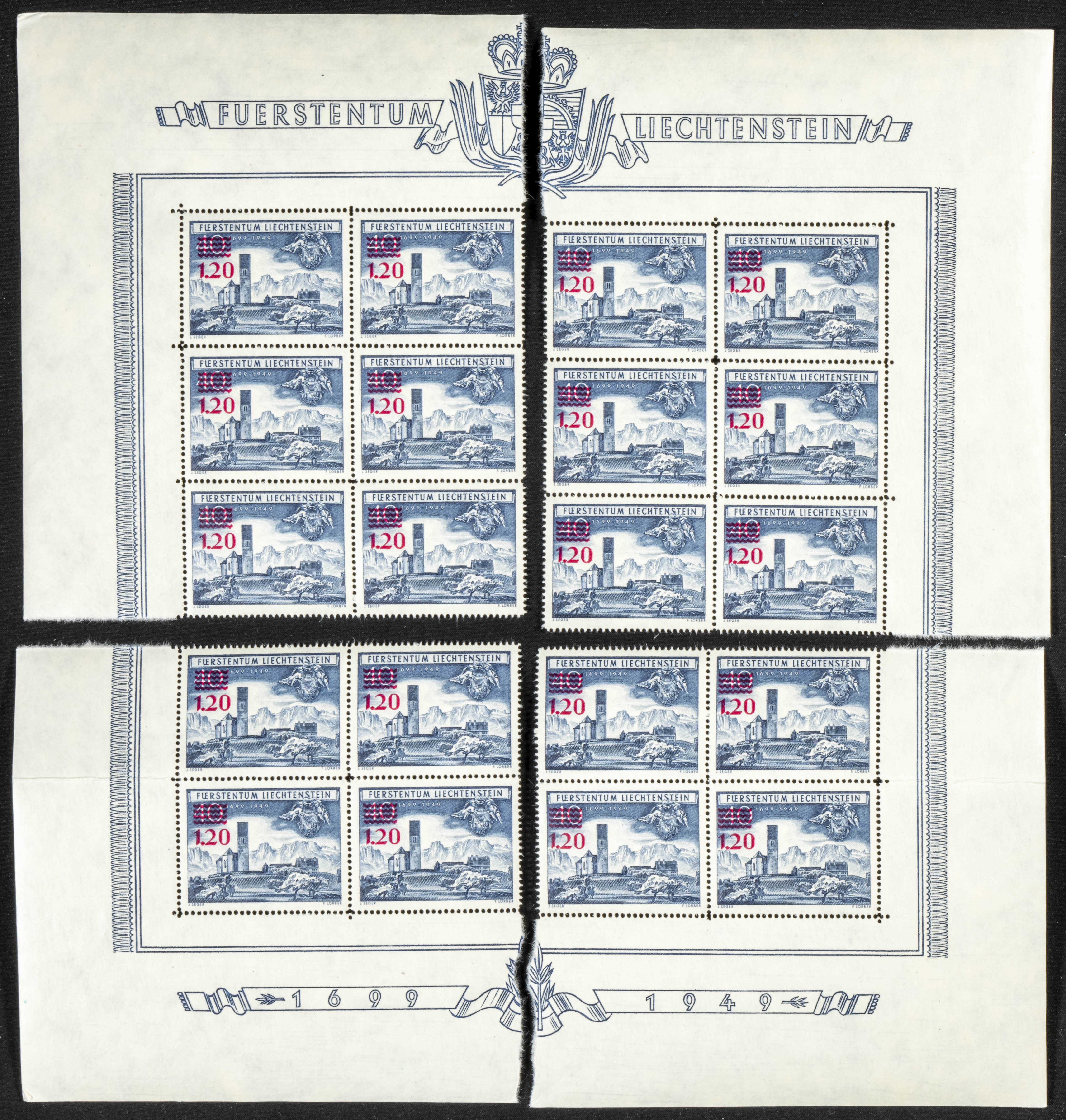 ★★Yvert 271(20). 1952. Veinte sellos de 1´20 s sobre 40 r azul de 1952 de Liechtenstein. MAGNIFICOS. Yvert 2019: 600 Euros