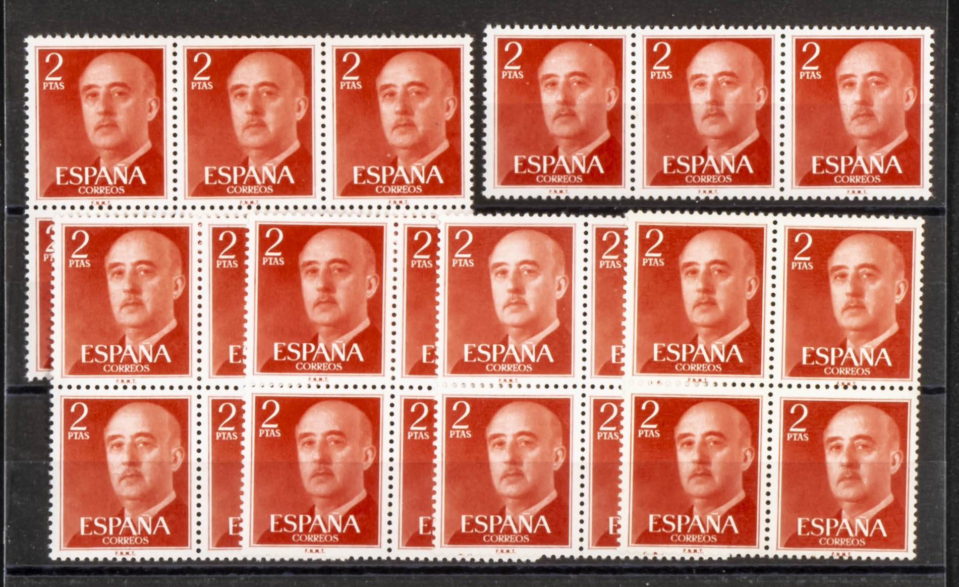 ★★ 1157(25). 1955. 2 pts rojo FRANCO, veinticinco sellos en bloques. MAGNIFICOS. Edifil 2024: 450 Euros