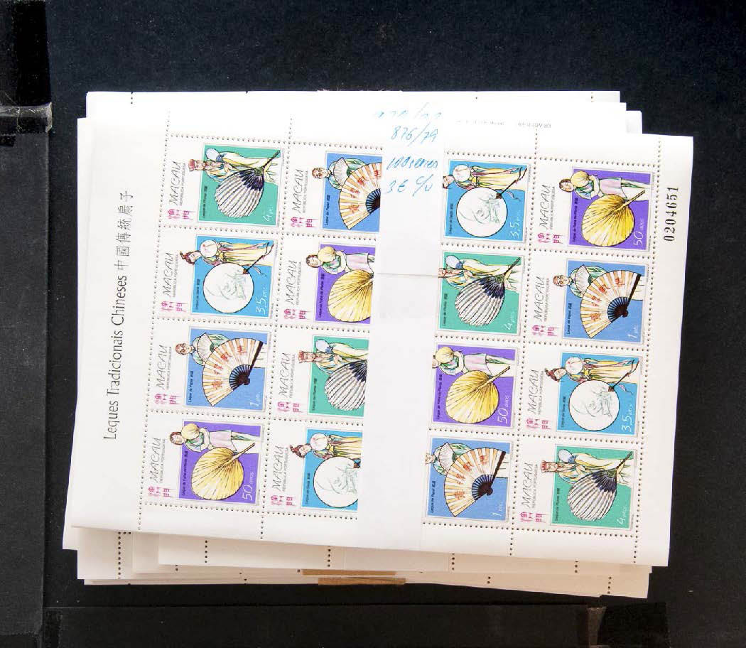 ★★(1997ca). Interesante conjunto de series completas y hojas bloque de Macao de 1997 a 1999, en nuevo y con repeticiones entre cincuenta y cien unidades de cada (se adjunta listado: 30237 Patacas, equivalente a +3700 Euros). ALTISIMO VALOR FACIAL. A EXAMINAR. Yvert 2020: +13.000 Euros