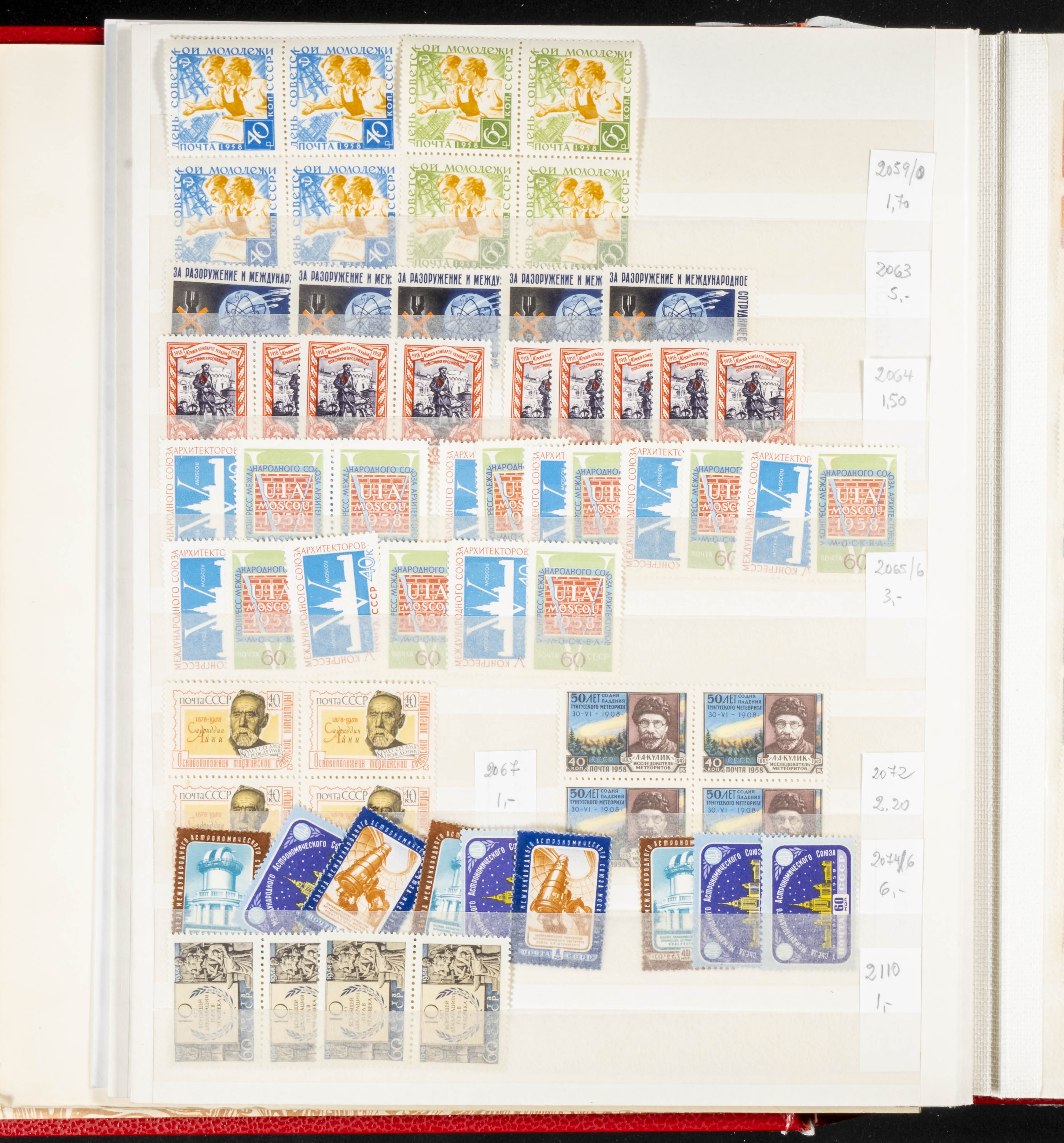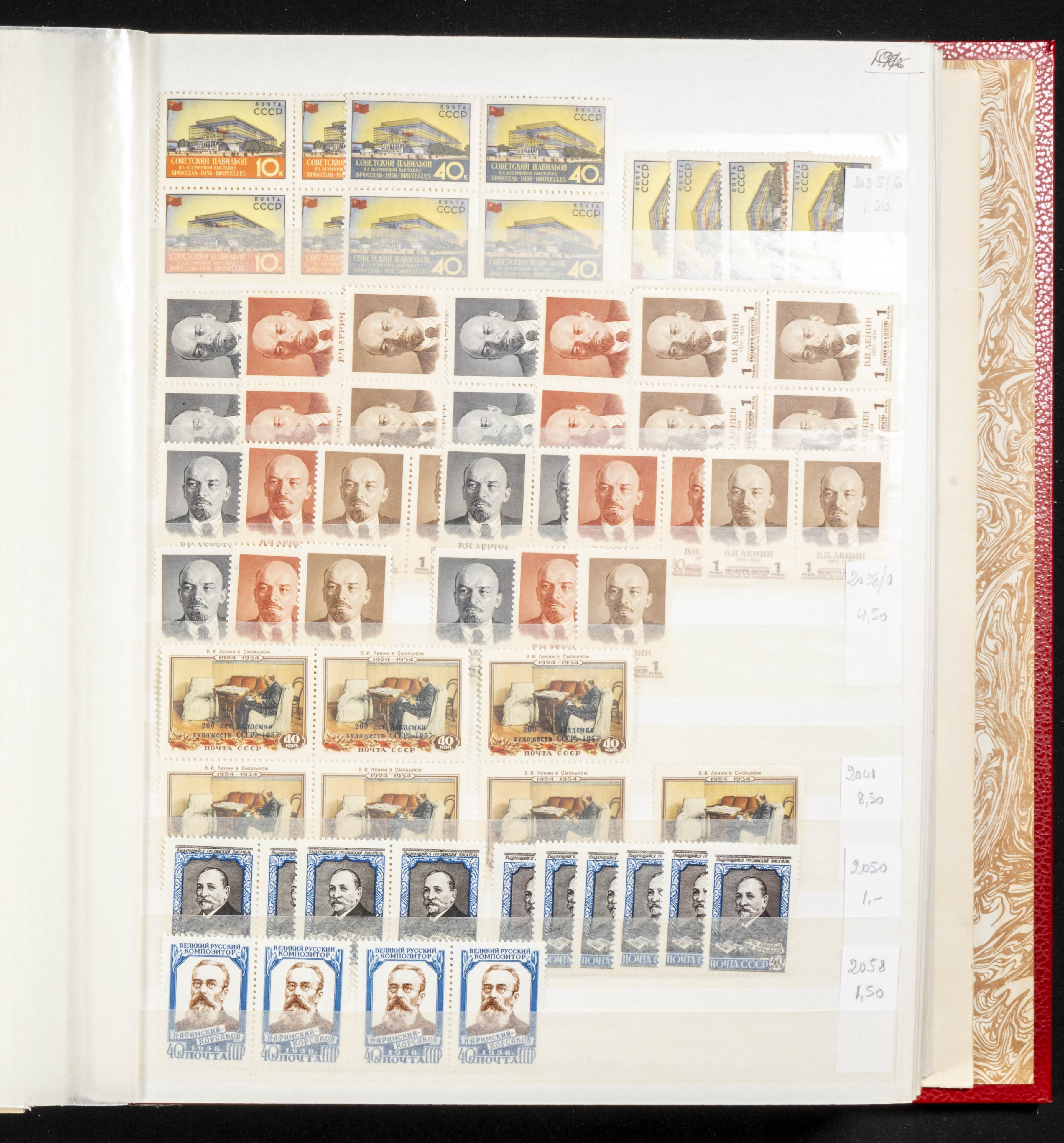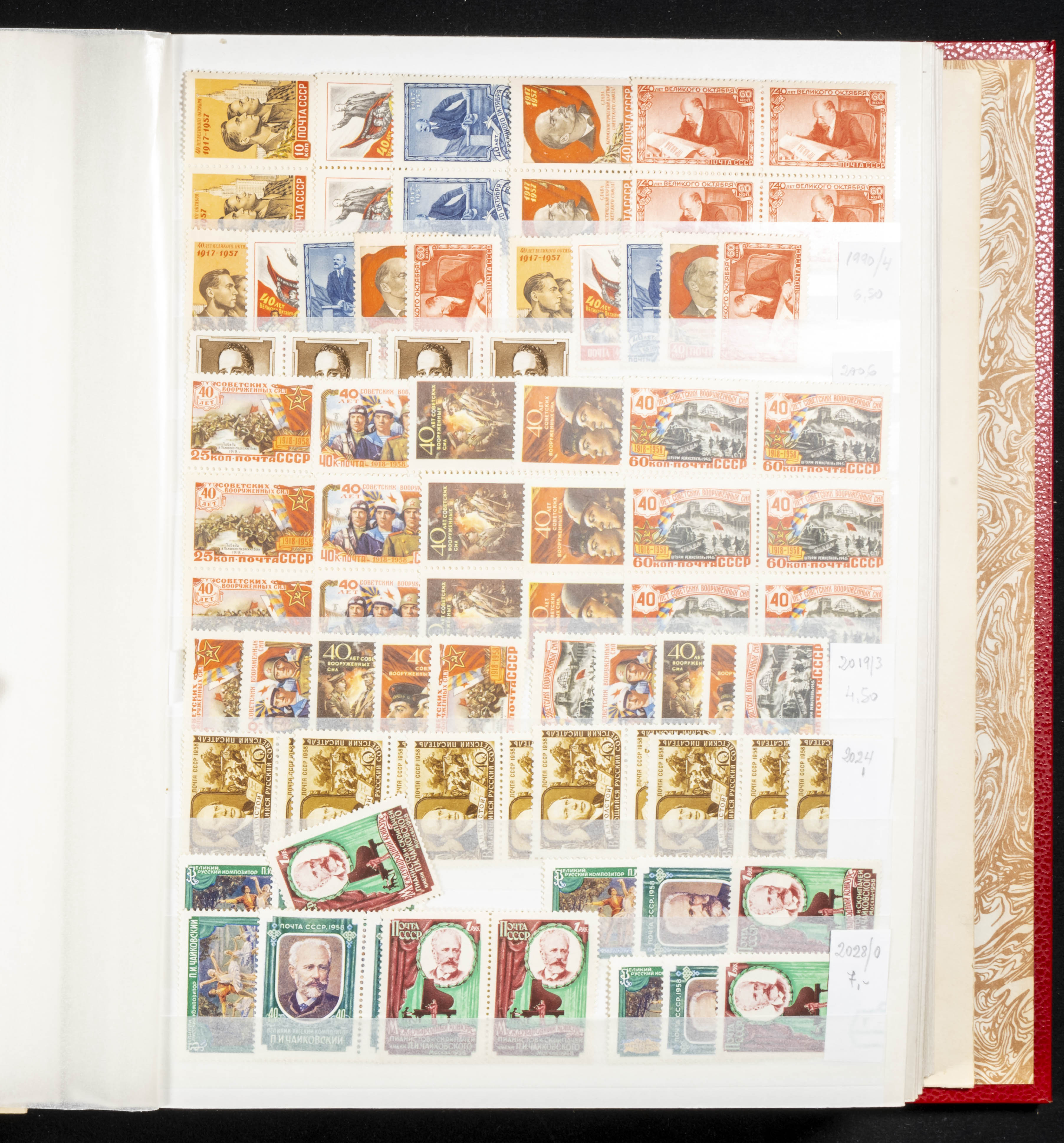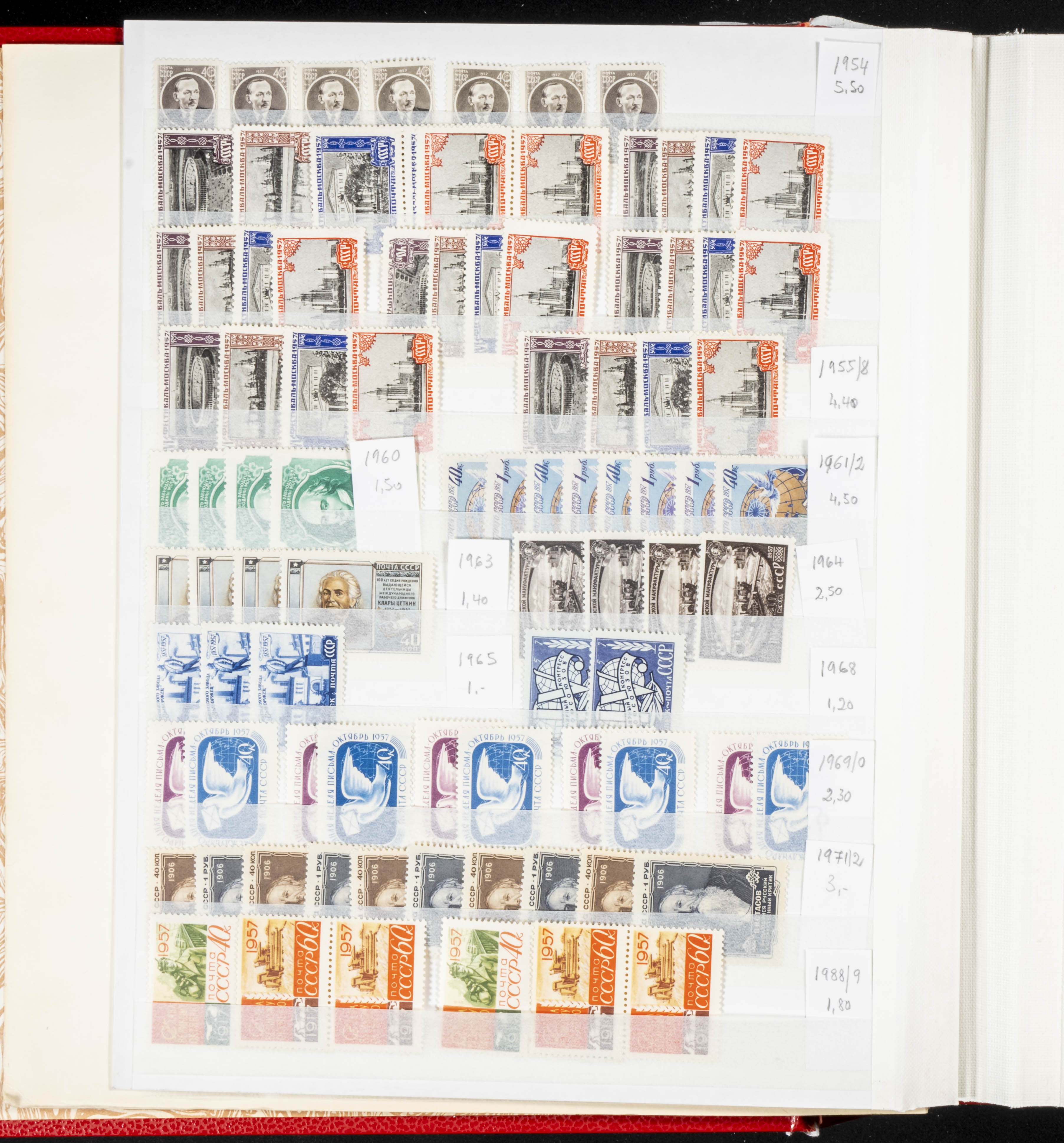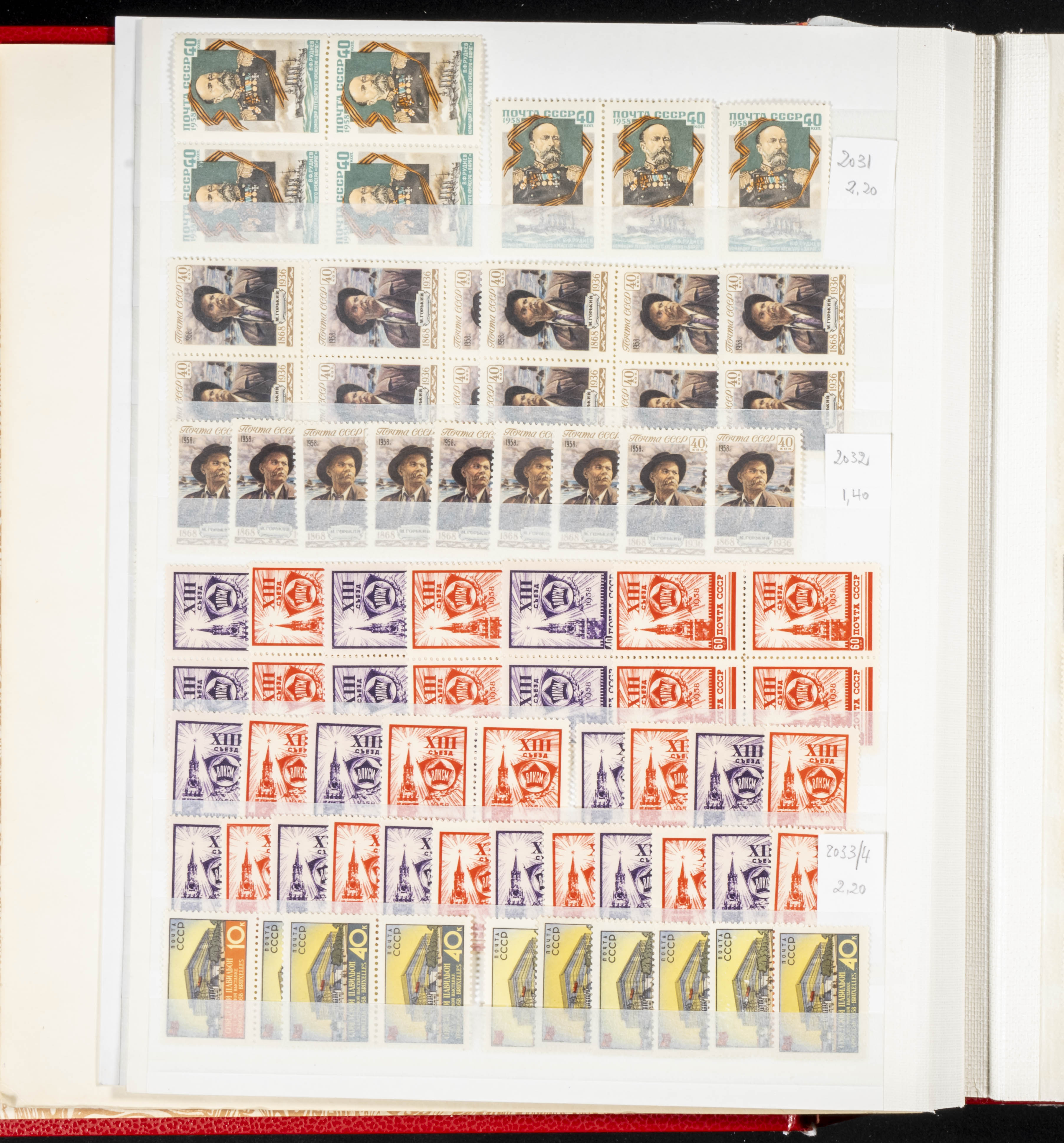 ★★(1937ca). Interesante conjunto-stock de miles de sellos, series completas y hojas bloque de Rusia, en nuevo (algún sello usado), la mayoría sin fijasellos, entre 1937 y 2008, etiquetados con la numeración Yvert y con repeticiones de hasta ocho unidades. ALTISIMO VALOR DE CATALOGO. A EXAMINAR.