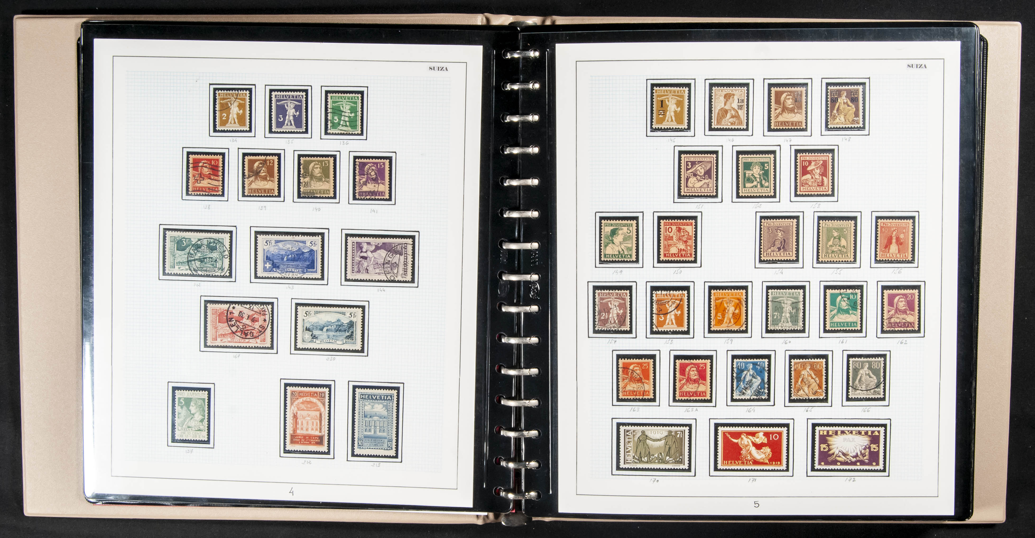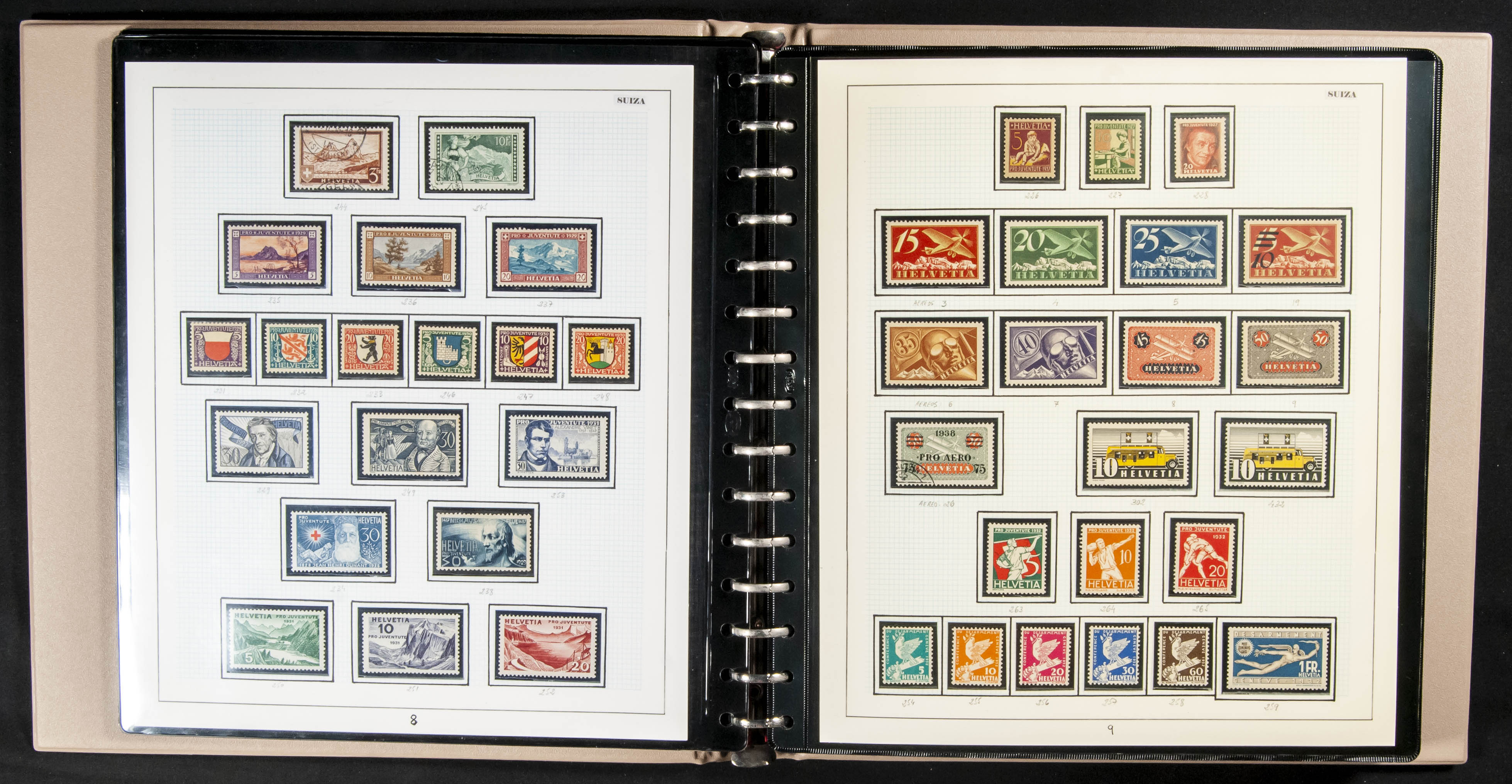 ★★/★(1854ca). Interesante colección muy completa de Suiza entre 1854 y 2000, en nuevo y usado, hasta 1965 una gran parte en usado destacando el 5 fr azul de 1928 nuevo, serie PAX nueva, aérea de 1919, la mayoría de las hojas bloque incluyendo NABA de 1934 y minihoja de PRO-JUVENTUTE de 1953 (Yvert Nº541 y 542). ALTISIMO VALOR DE CATALOGO. IMPRESCINDIBLE EXAMINAR.