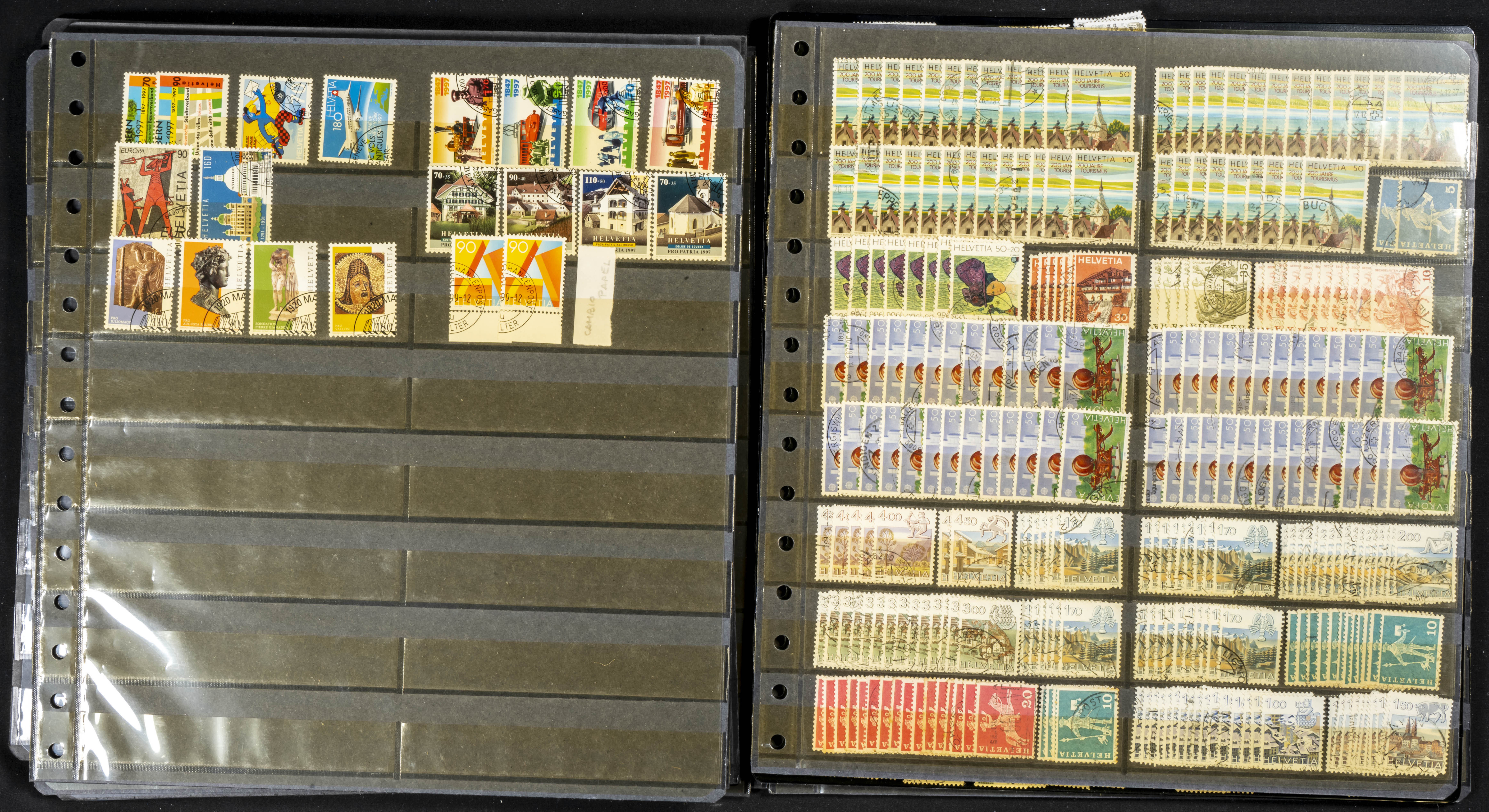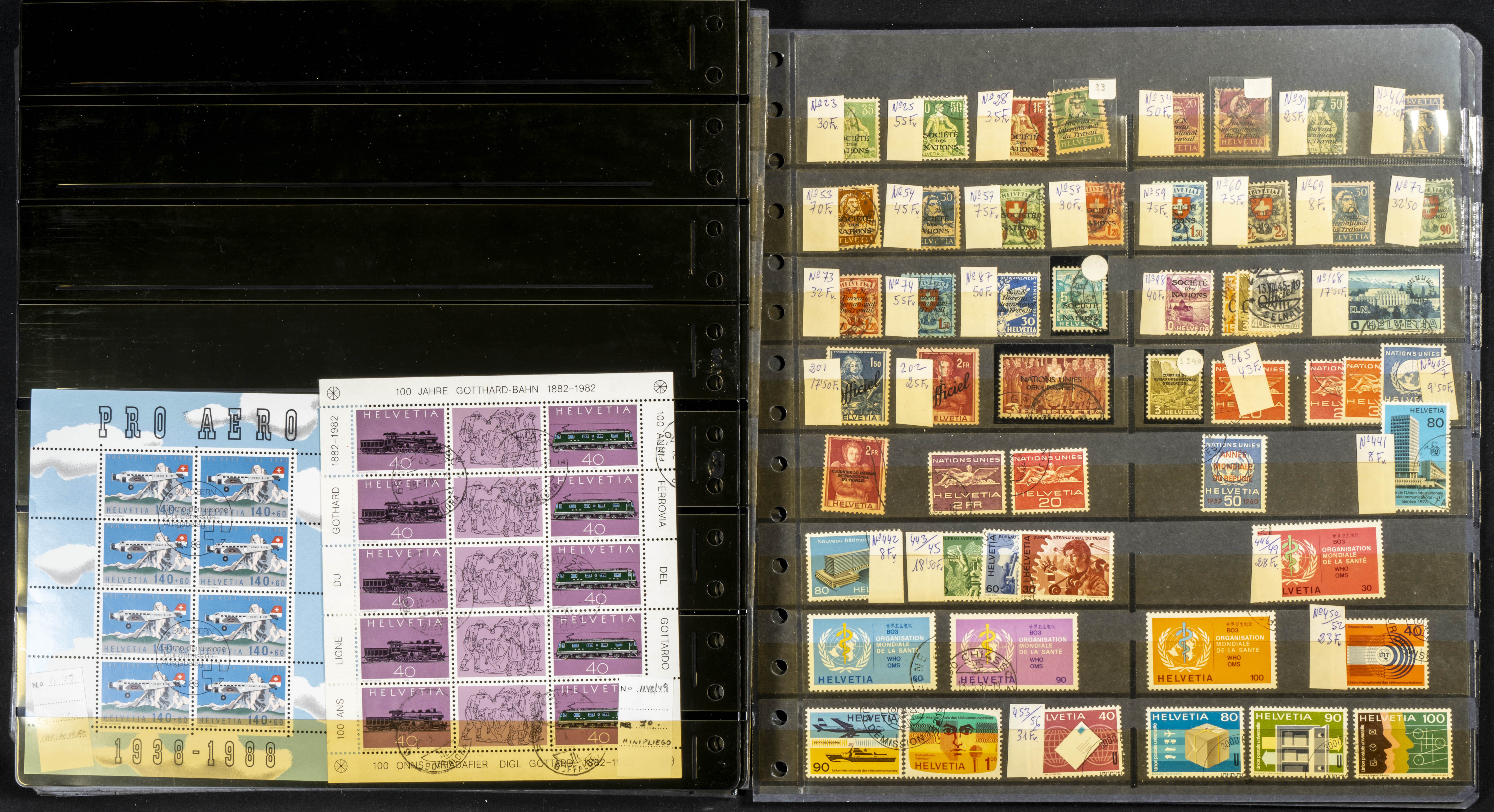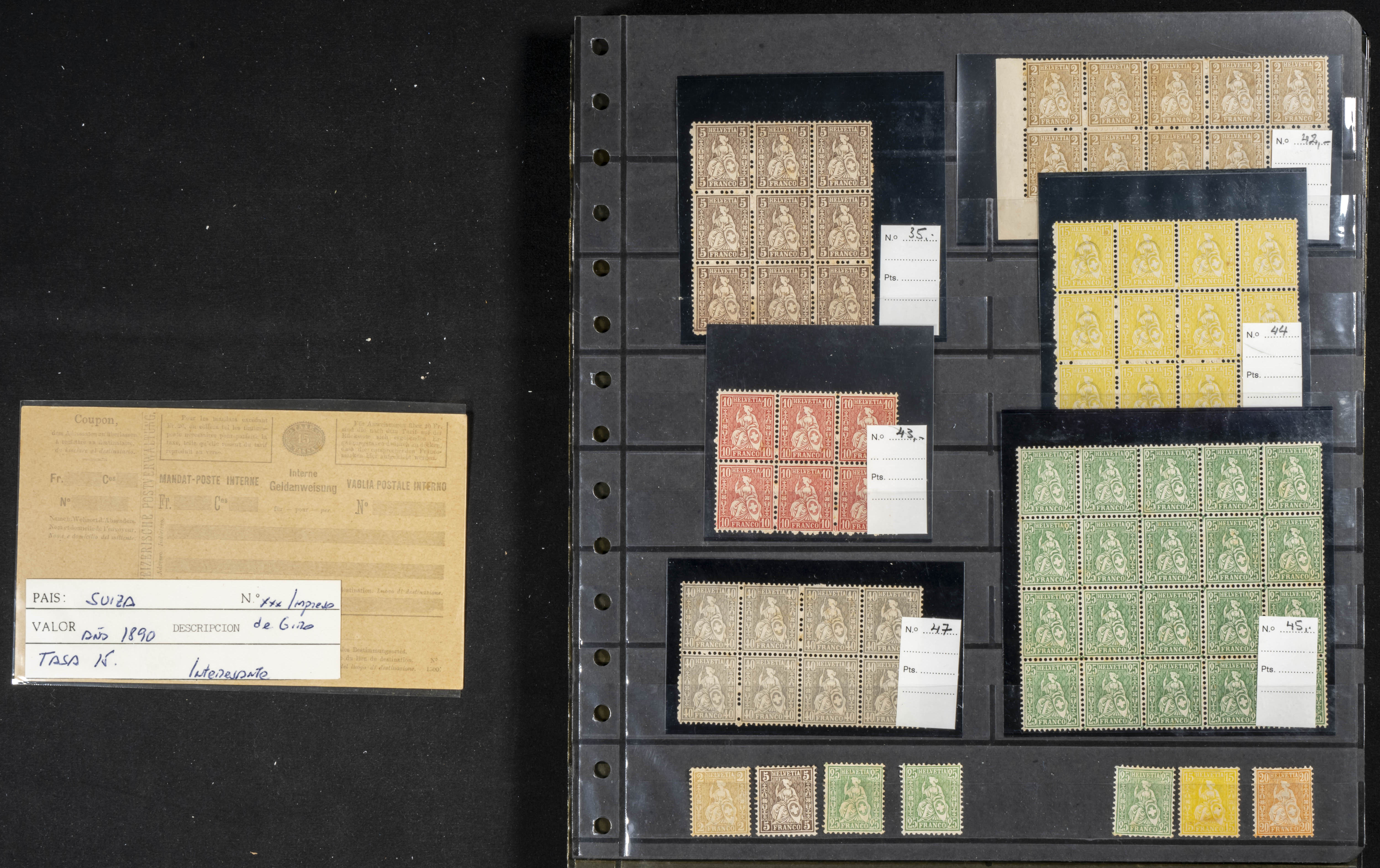 ★★/(1936ca). Interesante conjunto de series completas y hojas bloque de Suiza entre 1936 y 2000, en nuevo y la mayoría sin fijasellos, incluye un conjunto de sellos usados repetidos entre 1910 y 1990, algunos sobre fragmentos, además de varios bloques nuevos de emisiones clásicas dentadas, sellos de servicio y de tasas nuevos y usados. ALTO VALOR DE CATALOGO. A EXAMINAR.