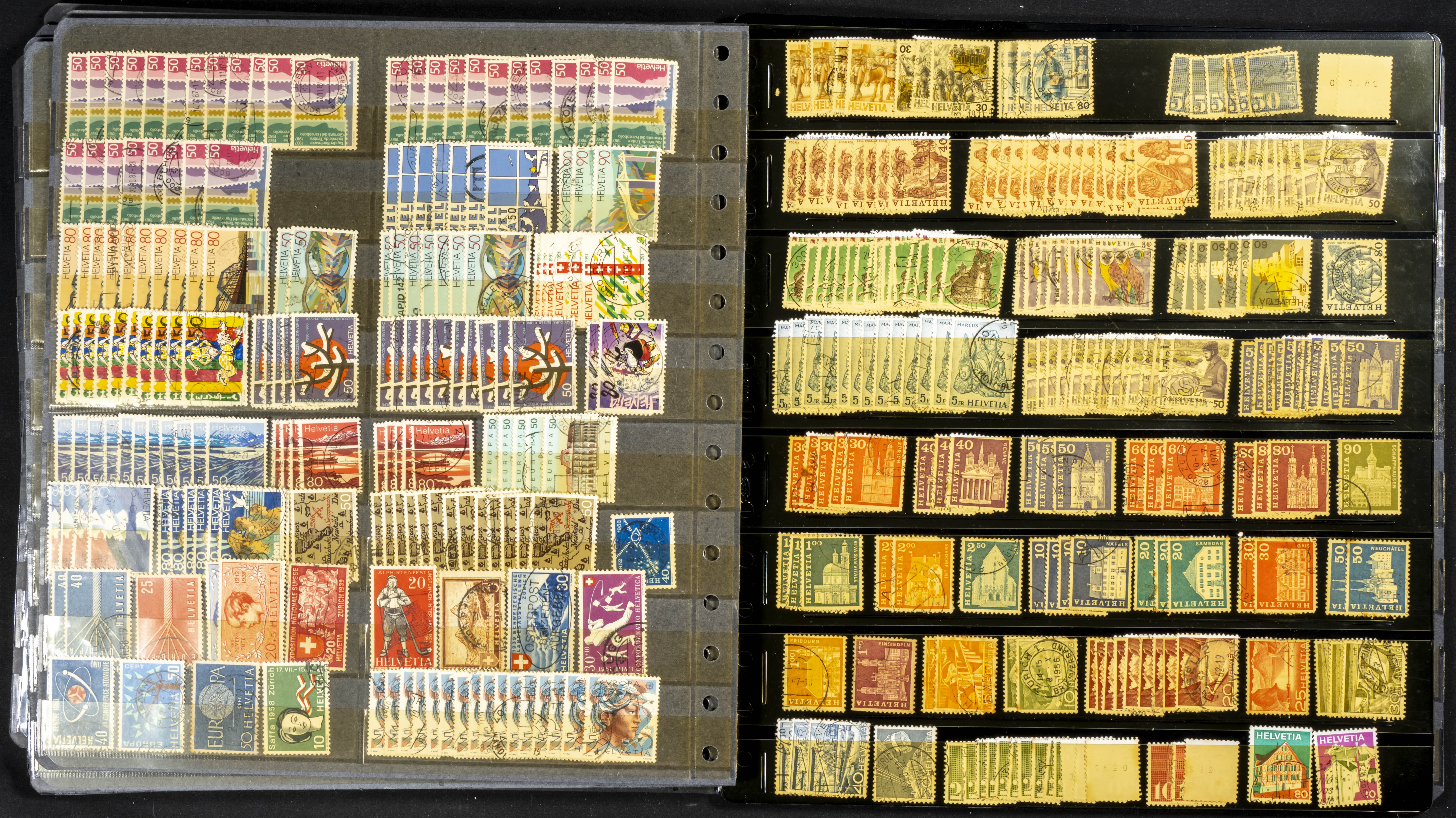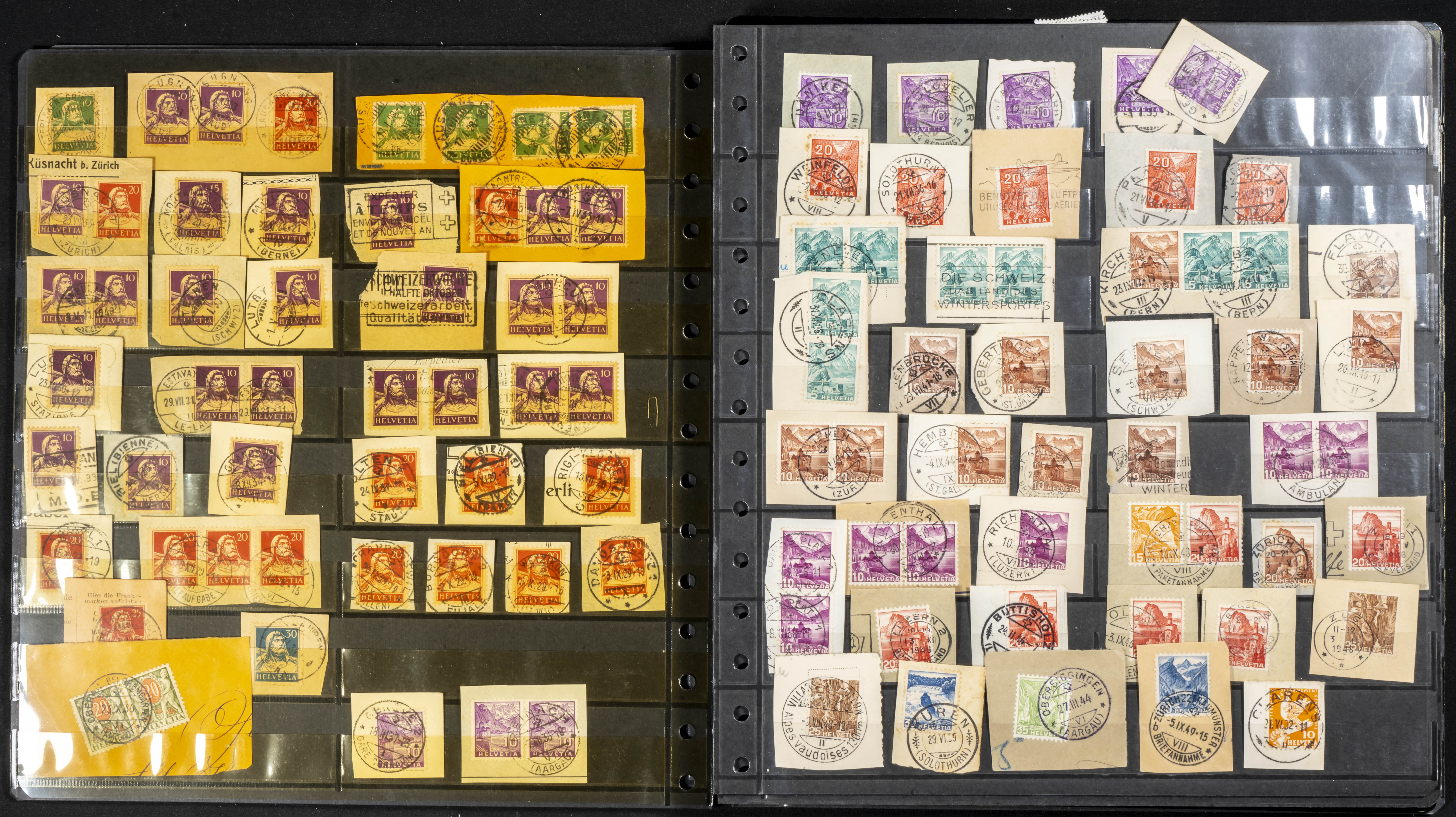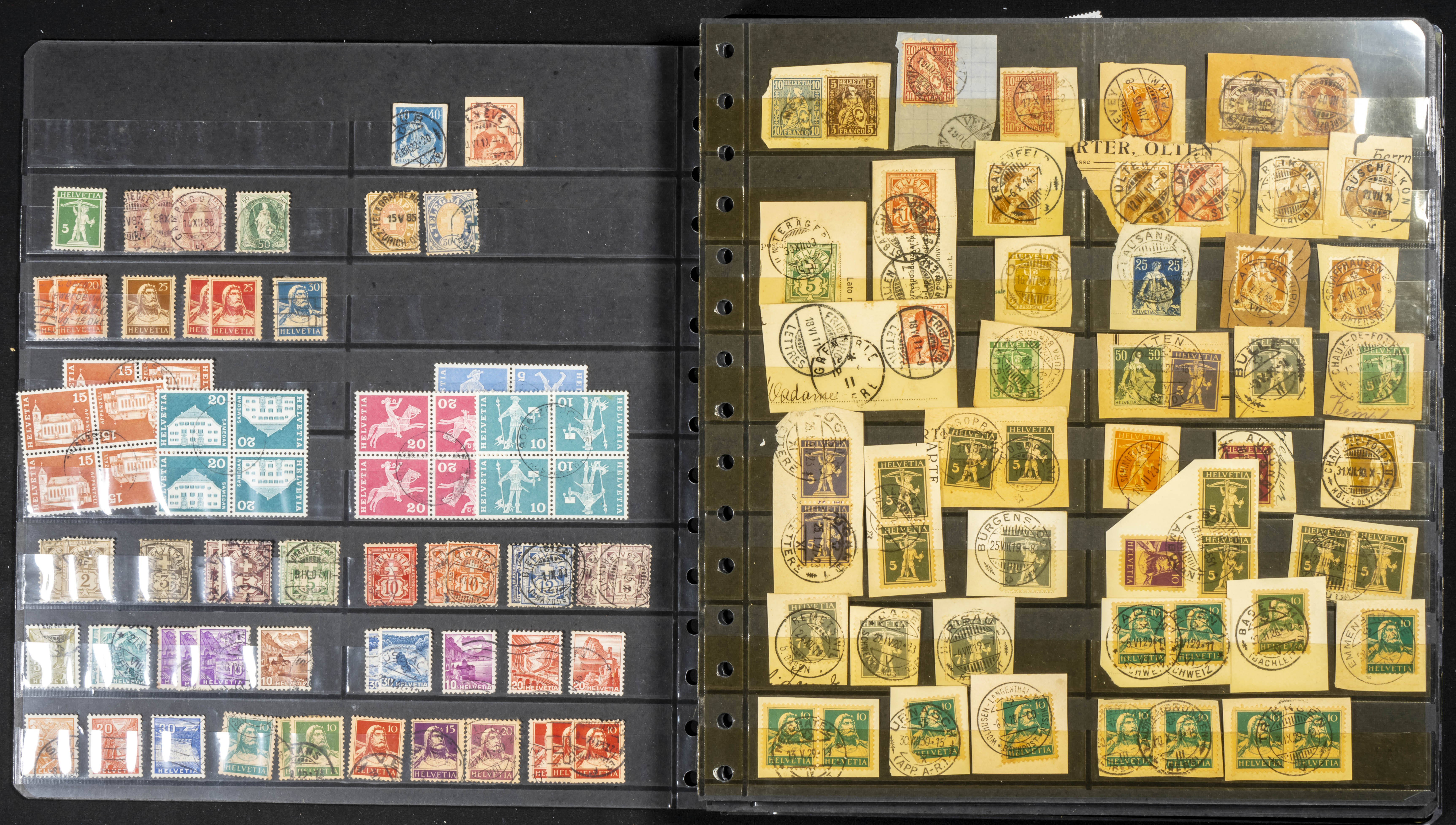 ★★/(1936ca). Interesante conjunto de series completas y hojas bloque de Suiza entre 1936 y 2000, en nuevo y la mayoría sin fijasellos, incluye un conjunto de sellos usados repetidos entre 1910 y 1990, algunos sobre fragmentos, además de varios bloques nuevos de emisiones clásicas dentadas, sellos de servicio y de tasas nuevos y usados. ALTO VALOR DE CATALOGO. A EXAMINAR.