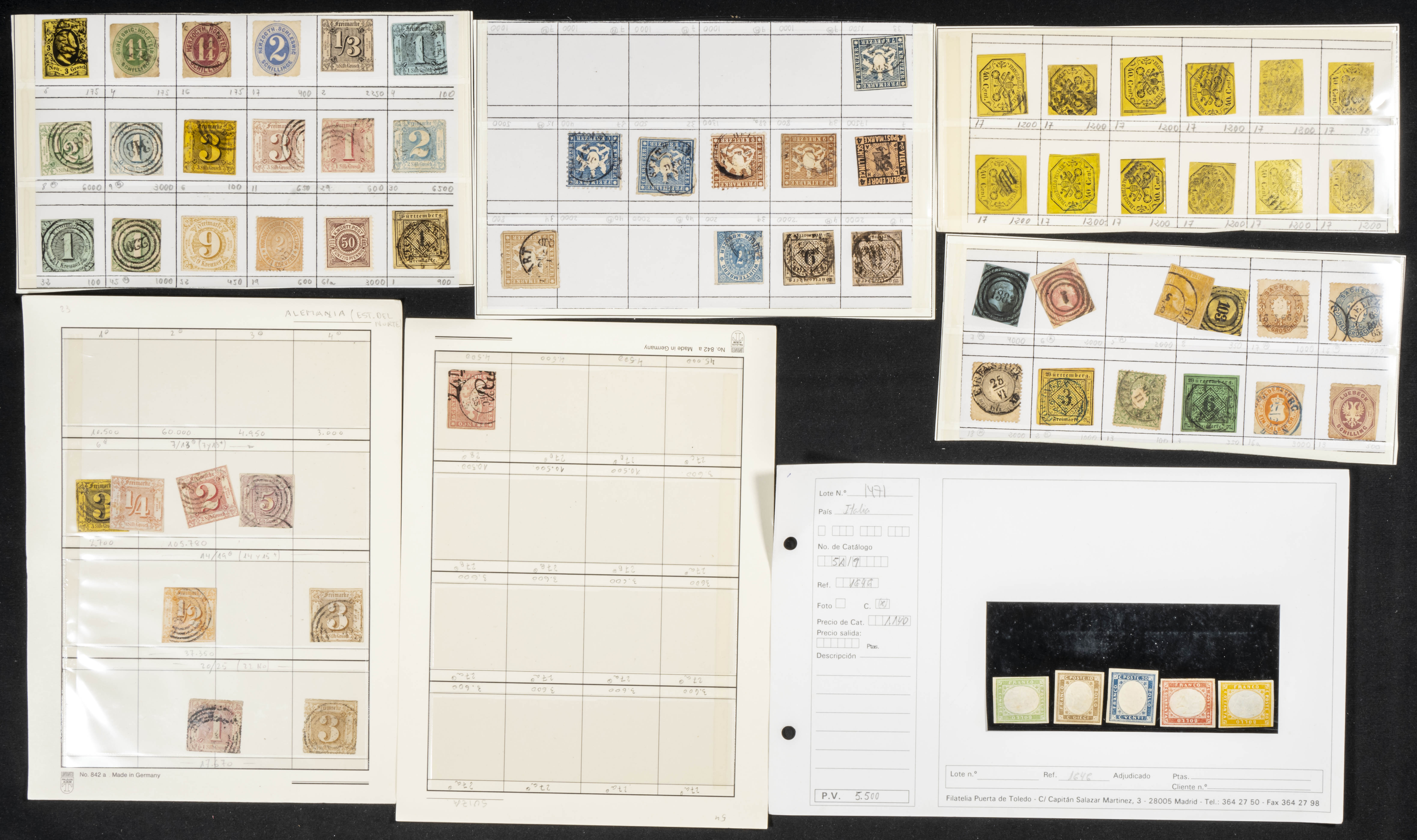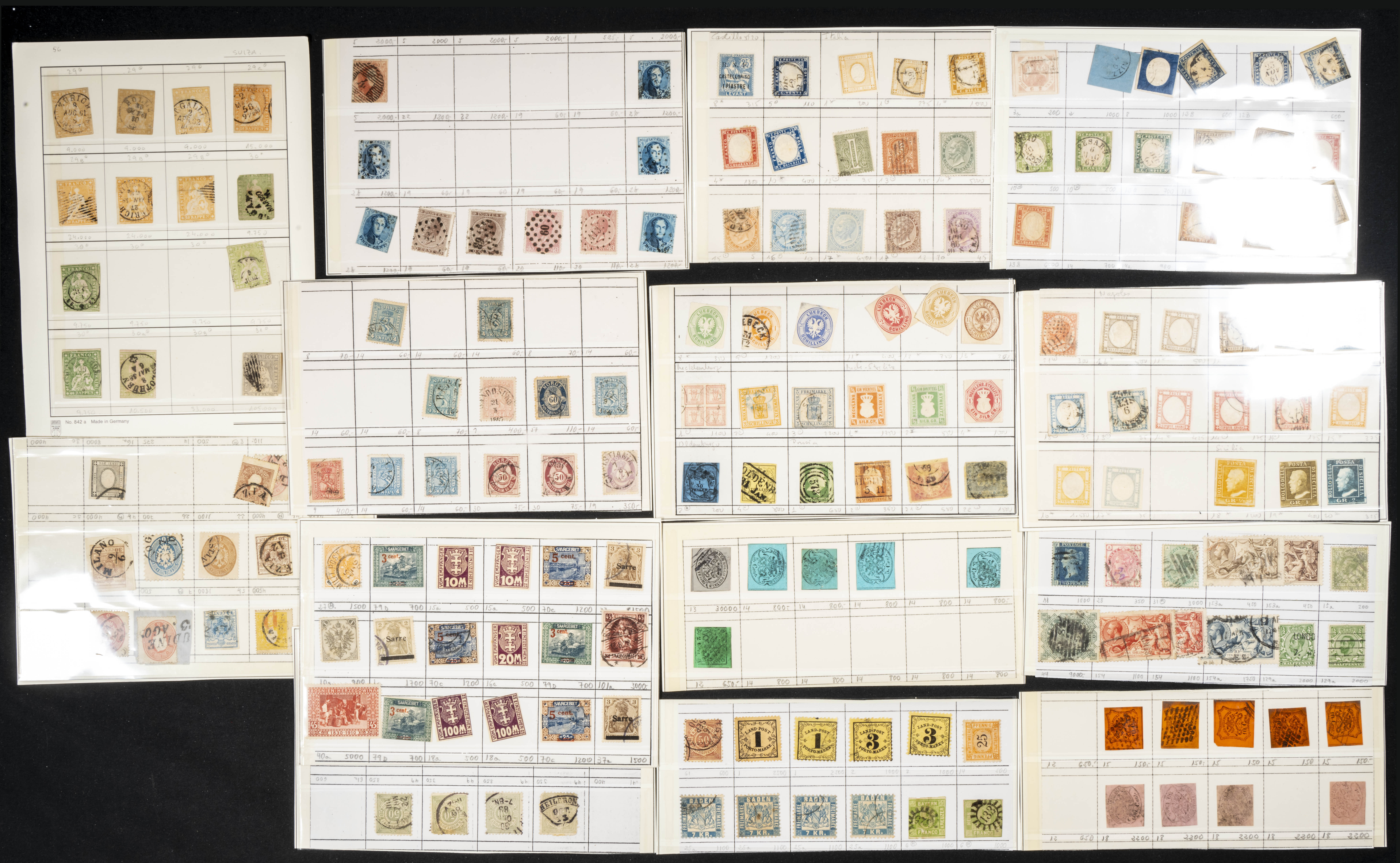 (★)/(1850ca). Interesantísimo conjunto de más de quinientos sellos clásicos y emisiones posteriores de diversos países, la mayoría europeos entre 1850 y 1920 en nuevo y usado (mayoría) montado en hojas de álbum recortadas con indicación del catálogo Yvert (algún sello falso). ALTISIMO VALOR DE CATALOGO. IMPRESCINDIBLE EXAMINAR.