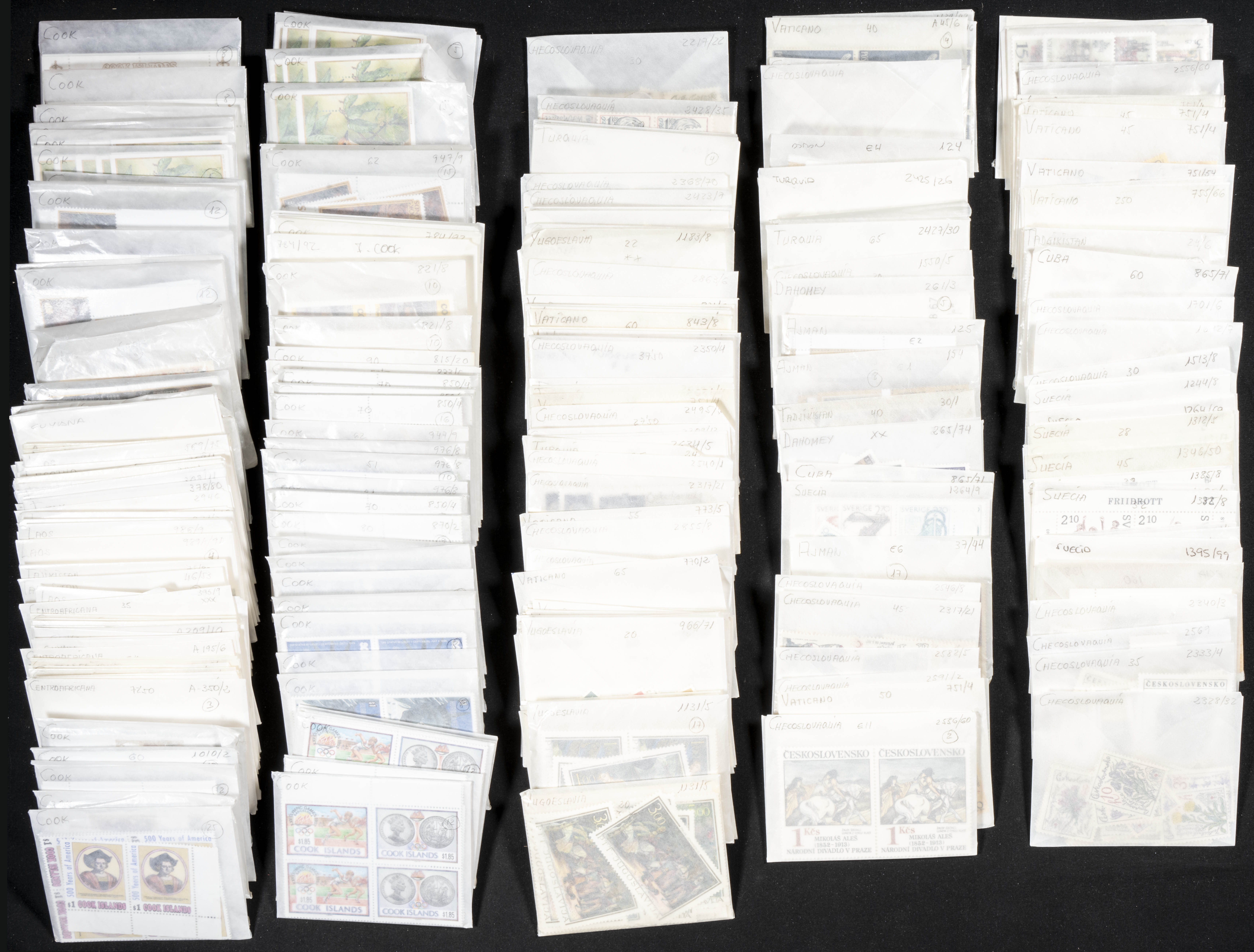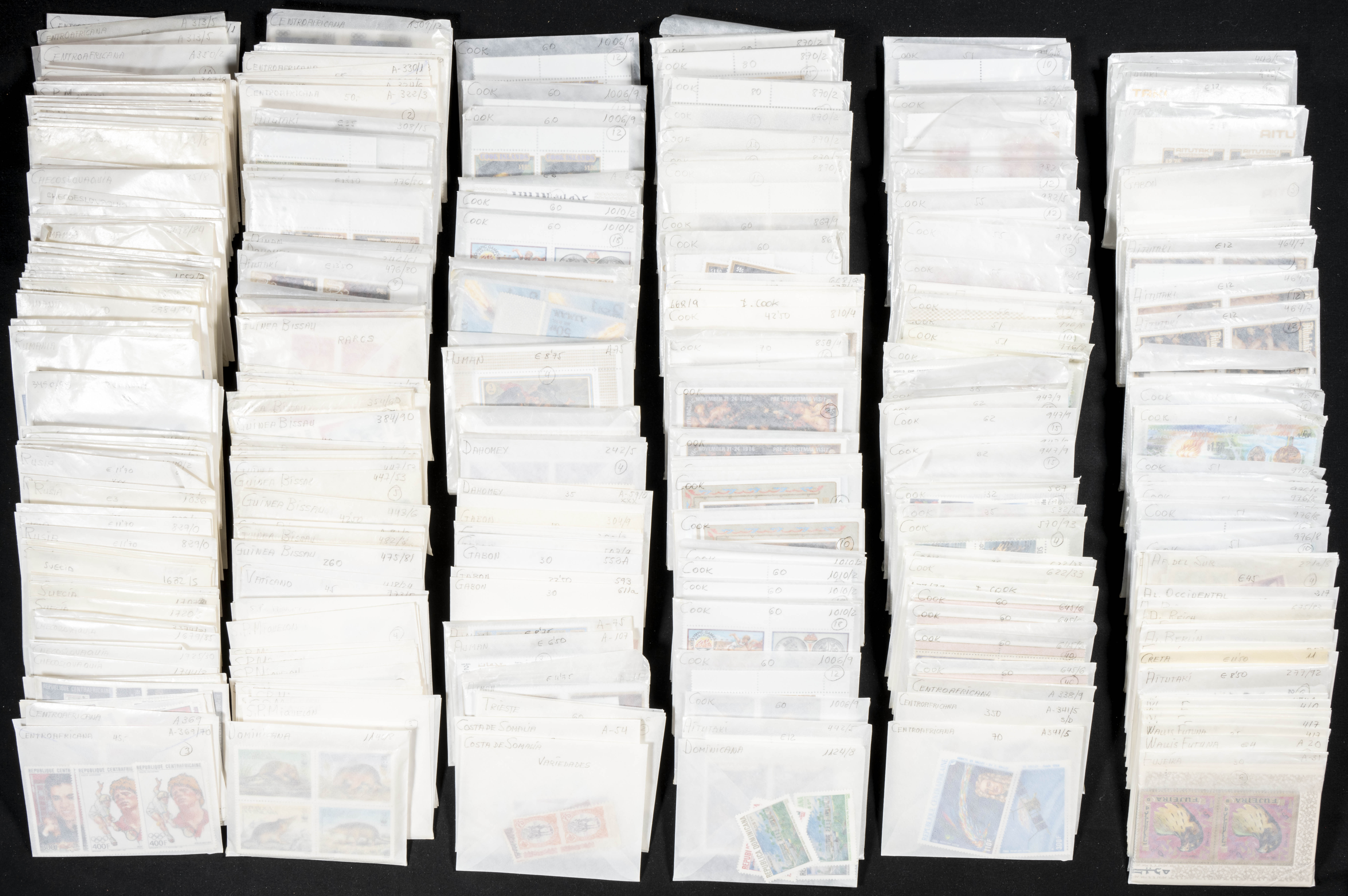 ★★/★(1940ca). Interesante conjunto de más de mil quinientas series completas de diversos países entre 1940 y 1995, en nuevo montados en sobres de cristal con indicación del número Yvert y en muchos casos con repeticiones hasta cuarenta unidades, incluyendo alguna serie sin dentar o variedades. ALTISIMO VALOR DE CATALOGO. IMPRESCINDIBLE EXAMINAR.